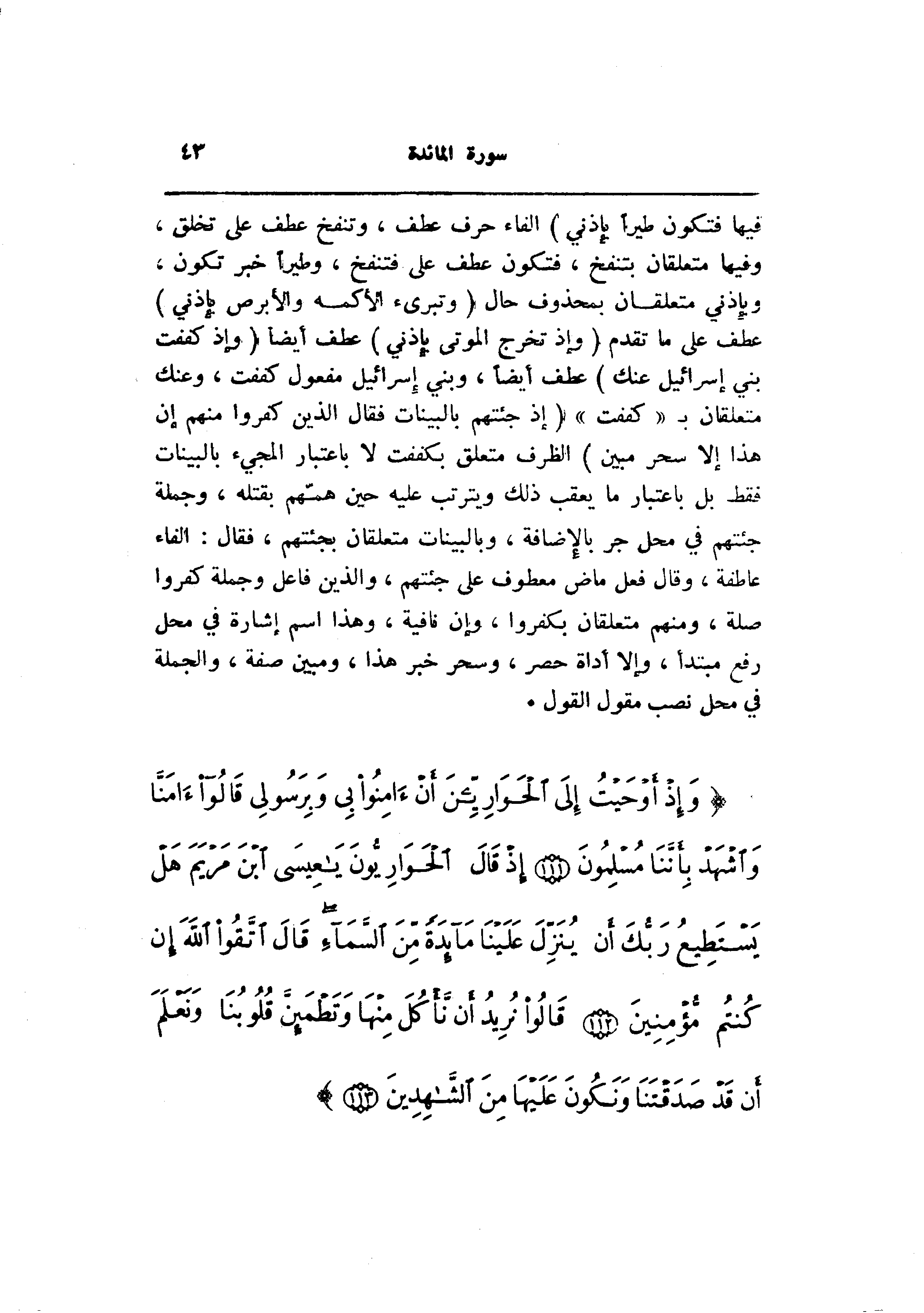 الفاء حرف عطف، وتنفخ عطف على تخلق، وفيها متعلقان بتنفخ، فتكون عطف على فتنفخ، وطيرا خبر تكون، وبإذني متعلقان بمحذوف حال (وَتُبْرِئُ الْأَكْمَهَ وَالْأَبْرَصَ بِإِذْنِي) عطف على ما تقدم (وَإِذْ تُخْرِجُ الْمَوْتى بِإِذْنِي) عطف أيضا (وَإِذْ كَفَفْتُ بَنِي إِسْرائِيلَ عَنْكَ) عطف أيضا، وبني إسرائيل مفعول كففت، وعنك متعلقان ب «كففت» (إِذْ جِئْتَهُمْ بِالْبَيِّناتِ فَقالَ الَّذِينَ كَفَرُوا مِنْهُمْ إِنْ هذا إِلَّا سِحْرٌ مُبِينٌ) الظرف متعلق بكففت لا باعتبار المجيء بالبينات فقط بل باعتبار ما يعقب ذلك ويترتب عليه حين همّهم بقتله، وجملة جئتهم في محل جر بالإضافة، وبالبينات متعلقان بجئتهم، فقال: الفاء عاطفة، وقال فعل ماض معطوف على جئتهم، والذين فاعل وجملة كفروا صلة، ومنهم متعلقان بكفروا، وإن نافية، وهذا اسم إشارة في محل رفع مبتدأ، وإلا أداة حصر، وسحر خبر هذا، ومبين صفة، والجملة في محل نصب مقول القول.