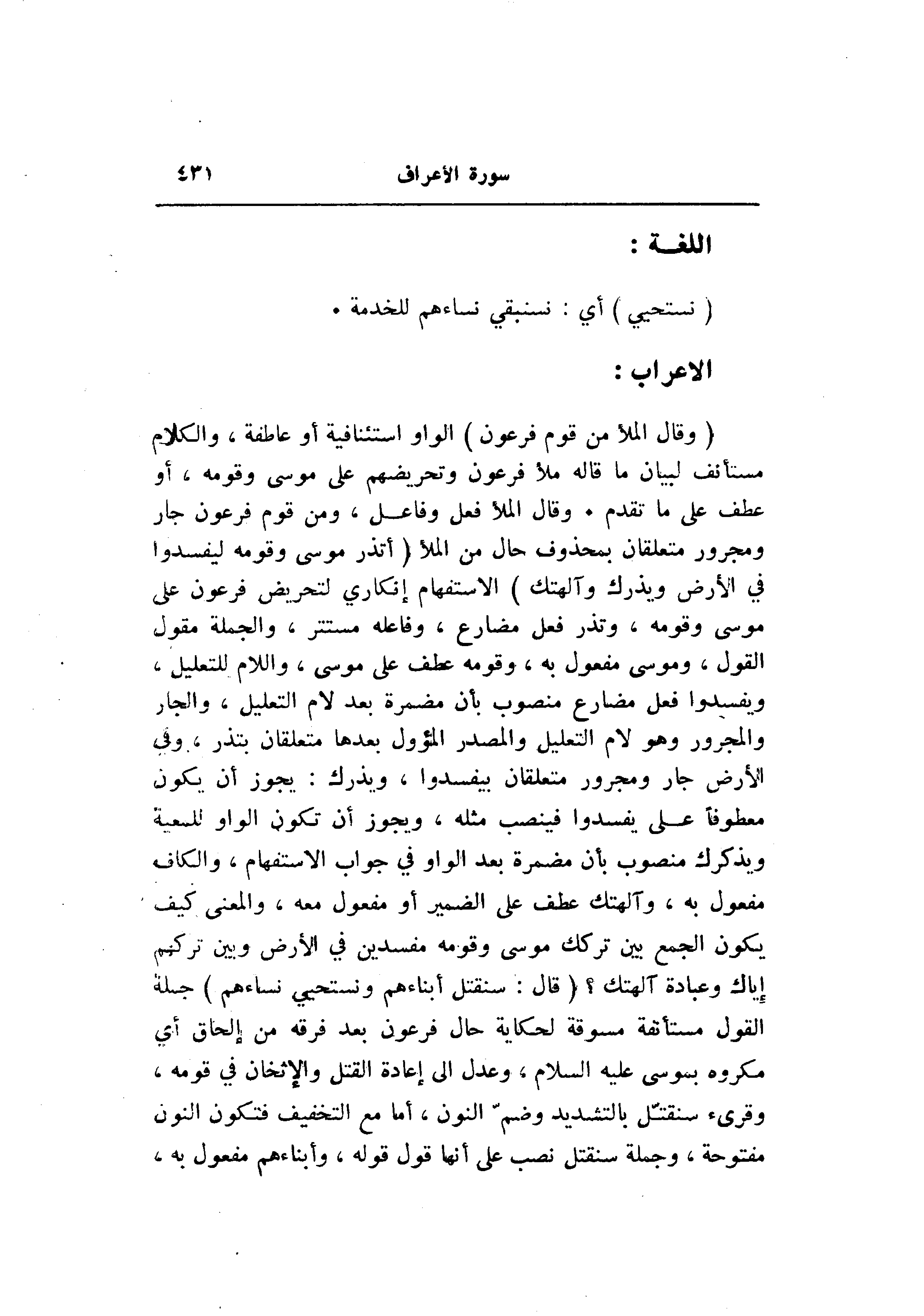 (وَقالَ الْمَلَأُ مِنْ قَوْمِ فِرْعَوْنَ) الواو استئنافية أو عاطفة، والكلام مستأنف لبيان ما قاله ملأ فرعون وتحريضهم على موسى وقومه، أو عطف على ما تقدم. وقال الملأ فعل وفاعل، ومن قوم فرعون جار ومجرور متعلقان بمحذوف حال من الملأ (أَتَذَرُ مُوسى وَقَوْمَهُ لِيُفْسِدُوا فِي الْأَرْضِ وَيَذَرَكَ وَآلِهَتَكَ) الاستفهام إنكاري لتحريض فرعون على موسى وقومه، وتذر فعل مضارع، وفاعله مستتر، والجملة مقول القول، وموسى مفعول به، وقومه عطف على موسى، واللام للتعليل، ويفسدوا فعل مضارع منصوب بأن مضمرة بعد لام التعليل، والجار والمجرور وهو لام التعليل والمصدر المؤول بعدها متعلقان بتذر، وفي الأرض جار ومجرور متعلقان بيفسدوا، ويذرك: يجوز أن يكون معطوفا على يفسدوا فينصب مثله، ويجوز أن تكون الواو للمعية ويذكرك منصوب بأن مضمرة بعد الواو في جواب الاستفهام، والكاف مفعول به، وآلهتك عطف على الضمير أو مفعول معه، والمعنى كيف يكون الجمع بين تركك موسى وقومه مفسدين في الأرض وبين تركهم إياك وعبادة آلهتك؟ (قالَ: سَنُقَتِّلُ أَبْناءَهُمْ وَنَسْتَحْيِي نِساءَهُمْ) جملة القول مستأنفة مسوقة لحكاية حال فرعون بعد فرقه من إلحاق أي مكروه بموسى عليه السلام، وعدل الى إعادة القتل والإثخان في قومه، وقرئ سنقتّل بالتشديد وضمّ النون، أما مع التخفيف فتكون النون مفتوحة، وجملة سنقتل نصب على أنها قول قوله، وأبناءهم مفعول به،