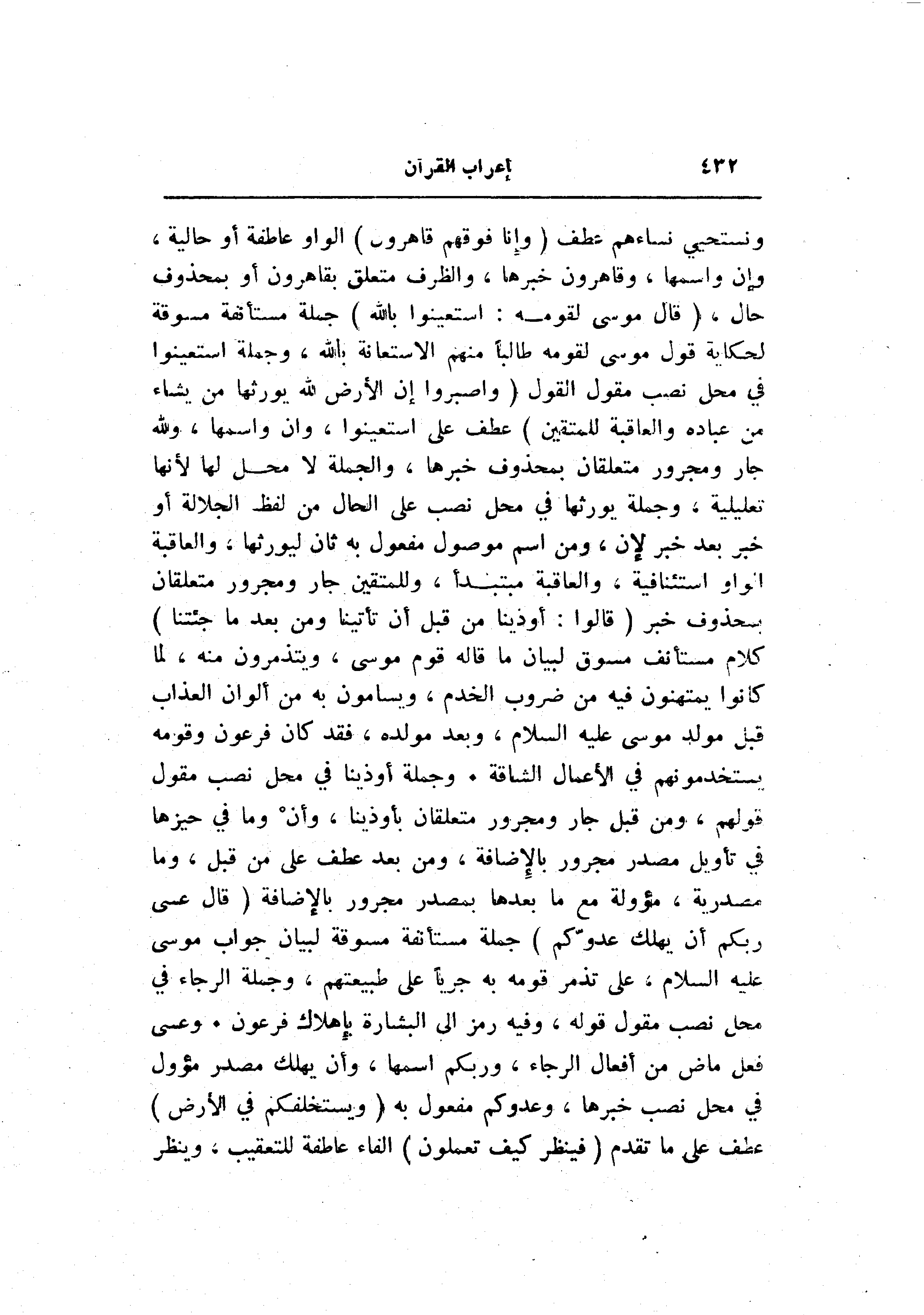 ونستحيي نساءهم عطف (وَإِنَّا فَوْقَهُمْ قاهِرُونَ) الواو عاطفة أو حالية، وإن واسمها، وقاهرون خبرها، والظرف متعلق بقاهرون أو بمحذوف حال، (قالَ مُوسى لِقَوْمِهِ: اسْتَعِينُوا بِاللَّهِ) جملة مستأنفة مسوقة لحكاية قول موسى لقومه طالبا منهم الاستعانة بالله، وجملة استعينوا في محل نصب مقول القول (وَاصْبِرُوا إِنَّ الْأَرْضَ لِلَّهِ يُورِثُها مَنْ يَشاءُ مِنْ عِبادِهِ وَالْعاقِبَةُ لِلْمُتَّقِينَ) عطف على استعينوا، وان واسمها، ولله جار ومجرور متعلقان بمحذوف خبرها، والجملة لا محل لها لأنها تعليلية، وجملة يورثها في محل نصب على الحال من لفظ الجلالة أو خبر بعد خبر لإن، ومن اسم موصول مفعول به ثان ليورثها، والعاقبة الواو استئنافية، والعاقبة مبتدأ، وللمتقين جار ومجرور متعلقان بمحذوف خبر (قالُوا: أُوذِينا مِنْ قَبْلِ أَنْ تَأْتِيَنا وَمِنْ بَعْدِ ما جِئْتَنا) كلام مستأنف مسوق لبيان ما قاله قوم موسى، ويتذمرون منه، لما كانوا يمتهنون فيه من ضروب الخدم، ويسامون به من ألوان العذاب قبل مولد موسى عليه السلام، وبعد مولده، فقد كان فرعون وقومه يستخدمونهم في الأعمال الشاقة. وجملة أوذينا في محل نصب مقول قولهم، ومن قبل جار ومجرور متعلقان بأوذينا، وأن وما في حيزها في تأويل مصدر مجرور بالإضافة، ومن بعد عطف على من قبل، وما مصدرية، مؤولة مع ما بعدها بمصدر مجرور بالإضافة (قالَ عَسى رَبُّكُمْ أَنْ يُهْلِكَ عَدُوَّكُمْ) جملة مستأنفة مسوقة لبيان جواب موسى عليه السلام، على تذمر قومه به جريا على طبيعتهم، وجملة الرجاء في محل نصب مقول قوله، وفيه رمز الى البشارة بإهلاك فرعون. وعسى فعل ماض من أفعال الرجاء، وربكم اسمها، وأن يهلك مصدر مؤول في محل نصب خبرها، وعدوكم مفعول به (وَيَسْتَخْلِفَكُمْ فِي الْأَرْضِ) عطف على ما تقدم (فَيَنْظُرَ كَيْفَ تَعْمَلُونَ) الفاء عاطفة للتعقيب، وينظر