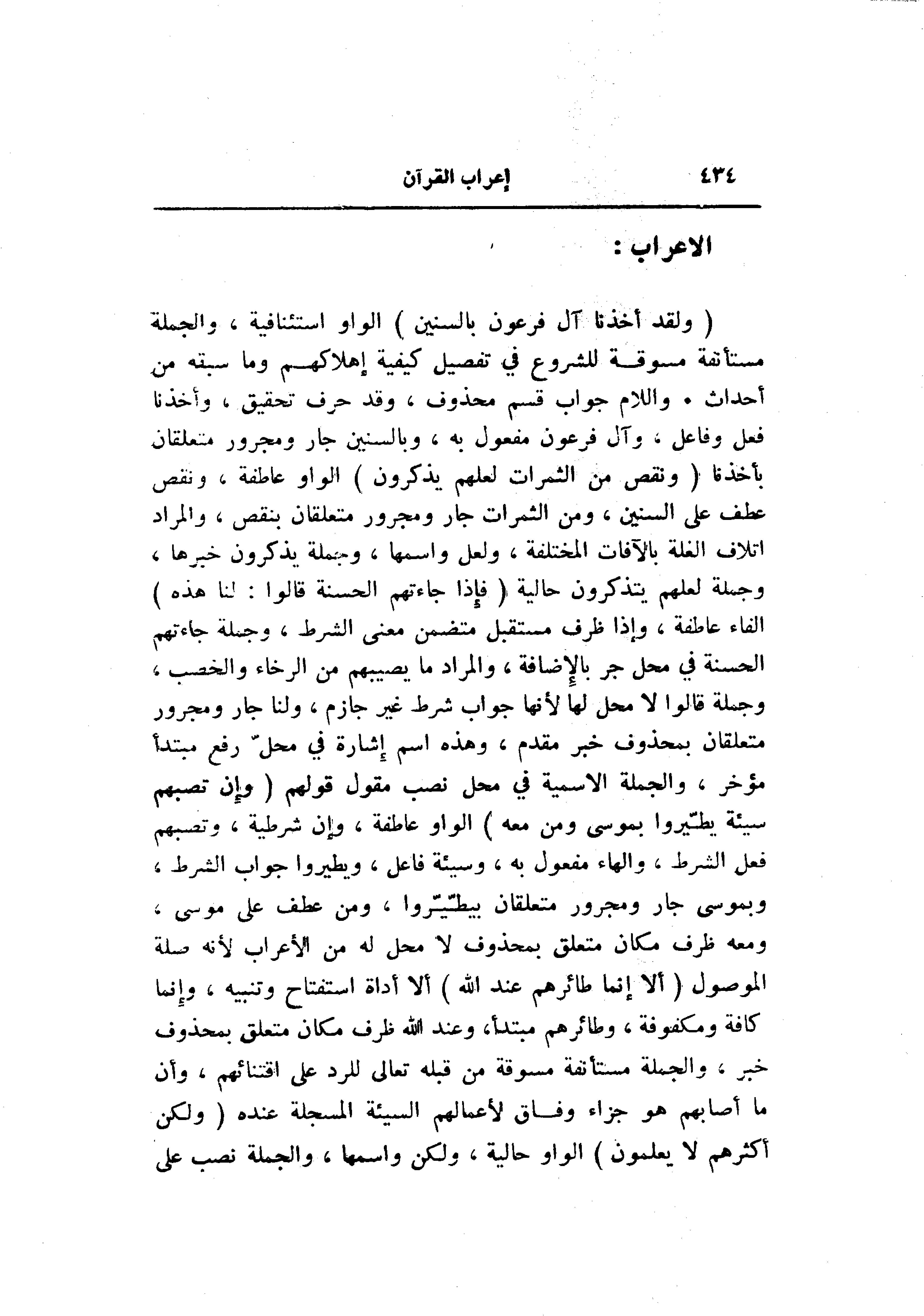 (وَلَقَدْ أَخَذْنا آلَ فِرْعَوْنَ بِالسِّنِينَ) الواو استئنافية، والجملة مستأنفة مسوقة للشروع في تفصيل كيفية إهلاكهم وما سبقه من أحداث. واللام جواب قسم محذوف، وقد حرف تحقيق، وأخذنا فعل وفاعل، وآل فرعون مفعول به، وبالسنين جار ومجرور متعلقان بأخذنا (وَنَقْصٍ مِنَ الثَّمَراتِ لَعَلَّهُمْ يَذَّكَّرُونَ) الواو عاطفة، ونقص عطف على السنين، ومن الثمرات جار ومجرور متعلقان بنقص، والمراد إتلاف الغلة بالآفات المختلفة، ولعل واسمها، وجملة يذكرون خبرها، وجملة لعلهم يتذكرون حالية (فَإِذا جاءَتْهُمُ الْحَسَنَةُ قالُوا: لَنا هذِهِ) الفاء عاطفة، وإذا ظرف مستقبل متضمن معنى الشرط، وجملة جاءتهم الحسنة في محل جر بالإضافة، والمراد ما يصيبهم من الرخاء والخصب، وجملة قالوا لا محل لها لأنها جواب شرط غير جازم، ولنا جار ومجرور متعلقان بمحذوف خبر مقدم، وهذه اسم إشارة في محلّ رفع مبتدأ مؤخر، والجملة الاسمية في محل نصب مقول قولهم (وَإِنْ تُصِبْهُمْ سَيِّئَةٌ يَطَّيَّرُوا بِمُوسى وَمَنْ مَعَهُ) الواو عاطفة، وإن شرطية، وتصبهم فعل الشرط، والهاء مفعول به، وسيئة فاعل، ويطيروا جواب الشرط، وبموسى جار ومجرور متعلقان بيطّيّروا، ومن عطف على موسى، ومعه ظرف مكان متعلق بمحذوف لا محل له من الأعراب لأنه صلة الموصول (أَلا إِنَّما طائِرُهُمْ عِنْدَ اللَّهِ) ألا أداة استفتاح وتنبيه، وإنما كافة ومكفوفة، وطائرهم مبتدأ، وعند الله ظرف مكان متعلق بمحذوف خبر، والجملة مستأنفة مسوقة من قبله تعالى للرد على اقتنائهم، وأن ما أصابهم هو جزاء وفاق لأعمالهم السيئة المسجلة عنده (وَلكِنَّ أَكْثَرَهُمْ لا يَعْلَمُونَ) الواو حالية، ولكن واسمها، والجملة نصب على