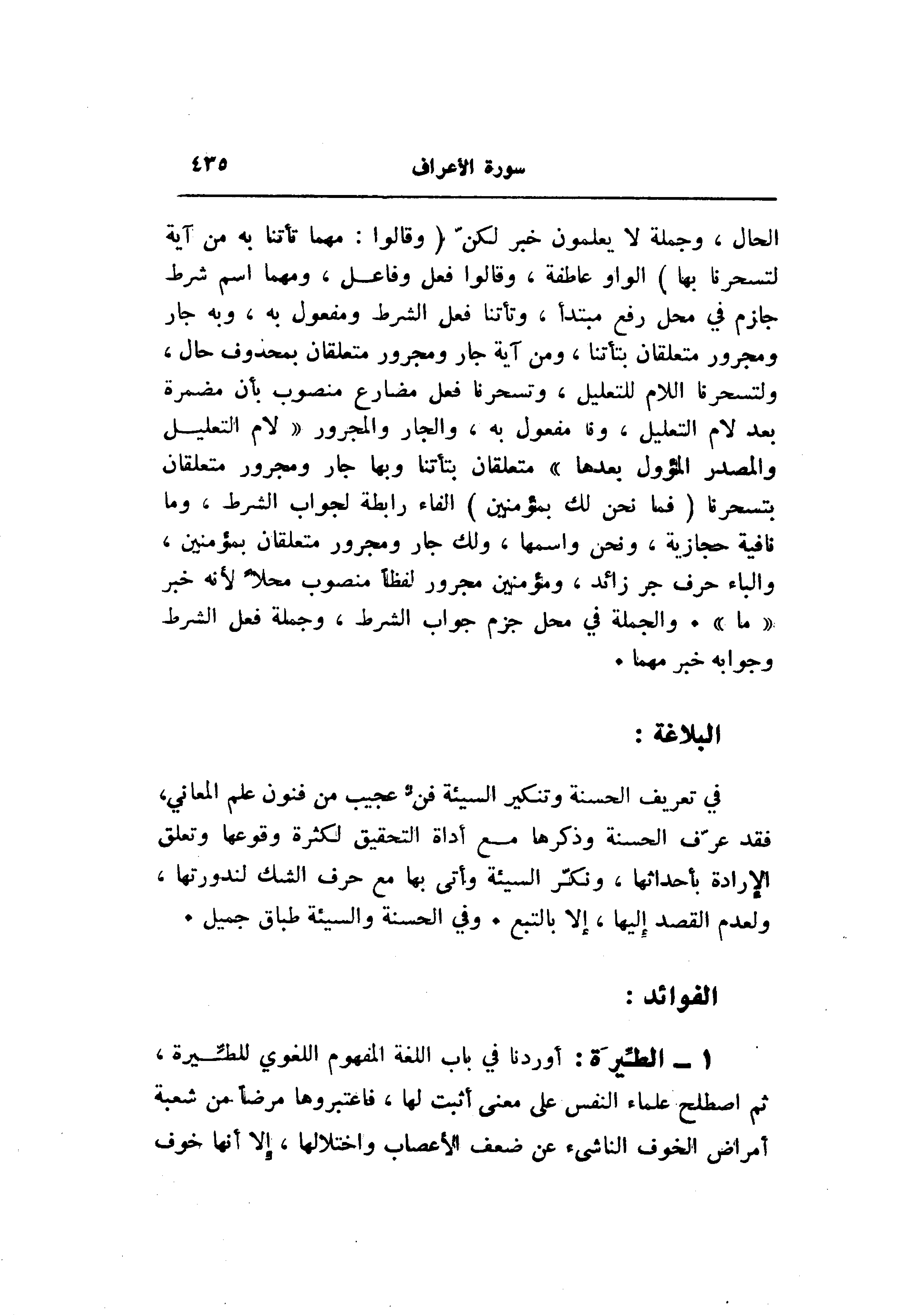 الحال، وجملة لا يعلمون خبر لكنّ (وَقالُوا: مَهْما تَأْتِنا بِهِ مِنْ آيَةٍ لِتَسْحَرَنا بِها) الواو عاطفة، وقالوا فعل وفاعل، ومهما اسم شرط جازم في محل رفع مبتدأ، وتأتنا فعل الشرط ومفعول به، وبه جار ومجرور متعلقان بتأتنا، ومن آية جار ومجرور متعلقان بمحذوف حال، ولتسحرنا اللام للتعليل، وتسحرنا فعل مضارع منصوب بأن مضمرة بعد لام التعليل، ونا مفعول به، والجار والمجرور «لام التعليل والمصدر المؤول بعدها» متعلقان بتأتنا وبها جار ومجرور متعلقان بتسحرنا (فَما نَحْنُ لَكَ بِمُؤْمِنِينَ) الفاء رابطة لجواب الشرط، وما نافية حجازية، ونحن واسمها، ولك جار ومجرور متعلقان بمؤمنين، والباء حرف جر زائد، ومؤمنين مجرور لفظا منصوب محلا لأنه خبر «ما» . والجملة في محل جزم جواب الشرط، وجملة فعل الشرط وجوابه خبر مهما.