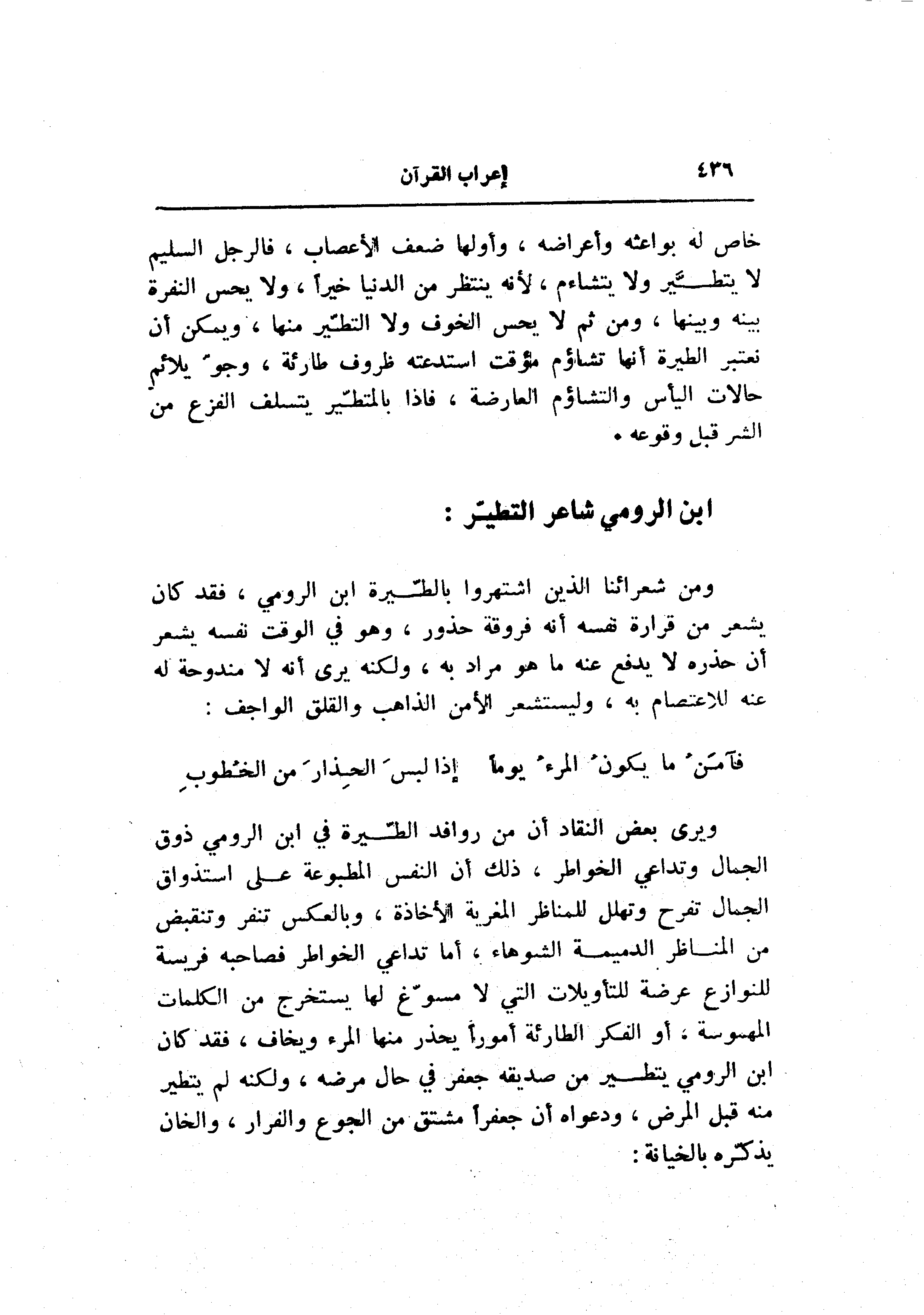 ومن شعرائنا الذين اشتهروا بالطيّرة ابن الرومي، فقد كان يشعر من قرارة نفسه أنه فروقة حذور، وهو في الوقت نفسه يشعر أن حذره لا يدفع عنه ما هو مراد به، ولكنه يرى أنه لا مندوحة له عنه للاعتصام به، وليستشعر الأمن الذاهب والقلق الواجف: