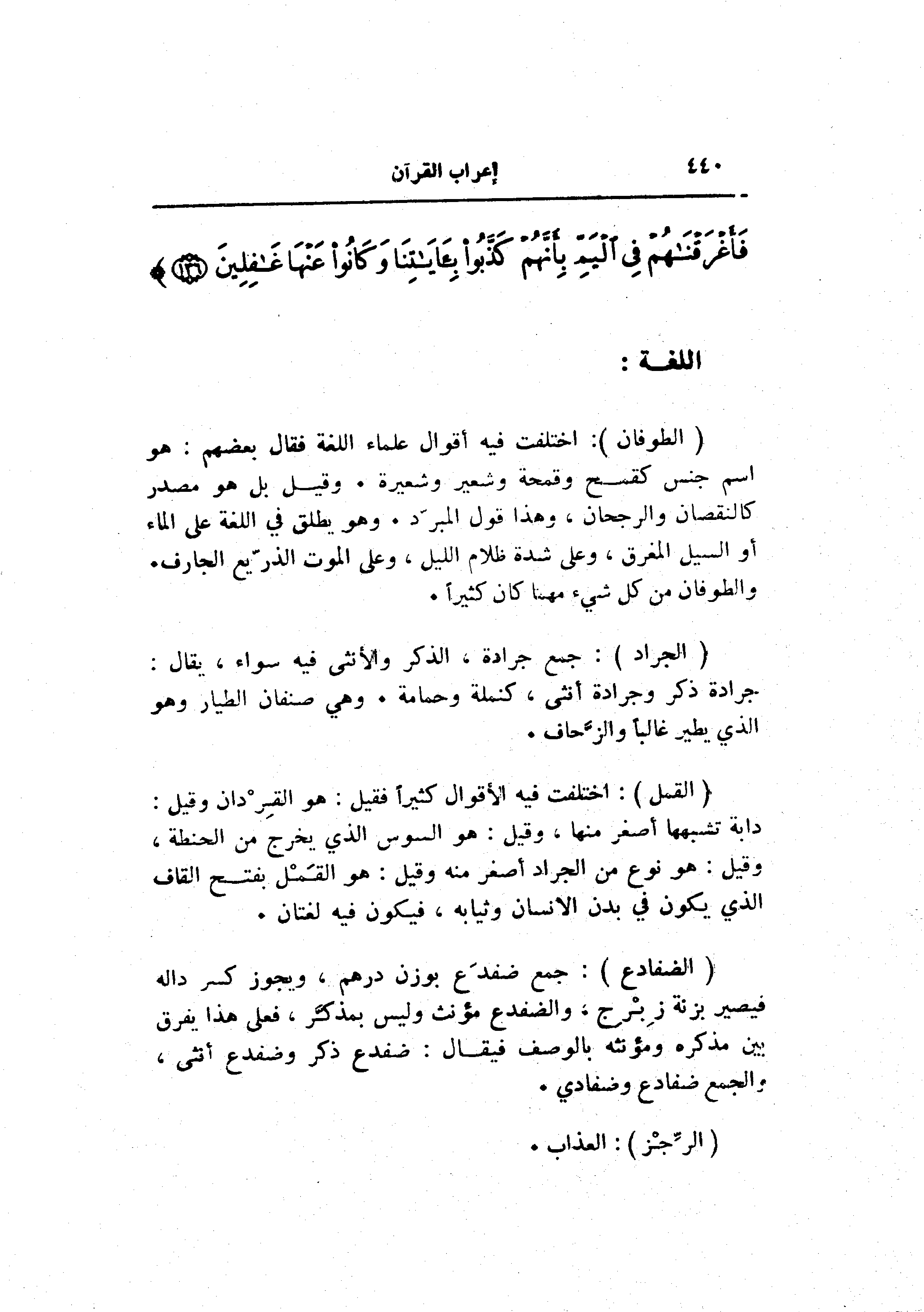 (الطُّوفانَ) : اختلفت فيه أقوال علماء اللغة فقال بعضهم: هو اسم جنس كقمح وقمحة وشعير وشعيرة. وقيل بل هو مصدر كالنقصان والرجحان، وهذا قول المبرد. وهو يطلق في اللغة على الماء أو السيل المغرق، وعلى شدة ظلام الليل، وعلى الموت الذرّيع الجارف.