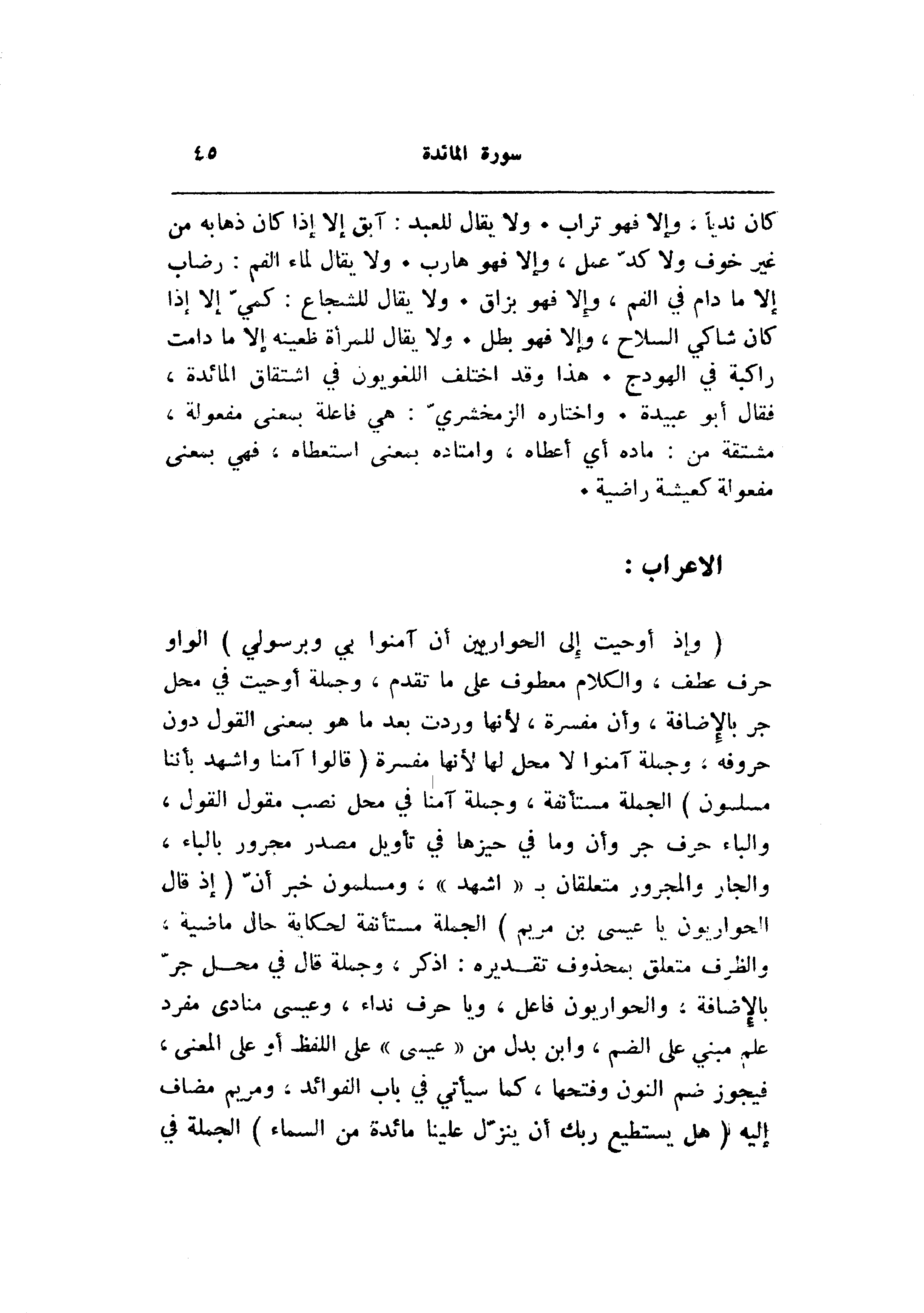 (وَإِذْ أَوْحَيْتُ إِلَى الْحَوارِيِّينَ أَنْ آمِنُوا بِي وَبِرَسُولِي) الواو حرف عطف، والكلام معطوف على ما تقدم، وجملة أوحيت في محل جر بالإضافة، وأن مفسرة، لأنها وردت بعد ما هو بمعنى القول دون حروفه، وجملة آمنوا لا محل لها لأنها مفسرة (قالُوا آمَنَّا وَاشْهَدْ بِأَنَّنا مُسْلِمُونَ) الجملة مستأنفة، وجملة آمنا في محل نصب مقول القول، والباء حرف جر وأن وما في حيزها في تأويل مصدر مجرور بالباء، والجار والمجرور متعلقان ب «اشهد» ، ومسلمون خبر أنّ (إِذْ قالَ الْحَوارِيُّونَ يا عِيسَى ابْنَ مَرْيَمَ) الجملة مستأنفة لحكاية حال ماضية، والظرف متعلق بمحذوف تقديره: اذكر، وجملة قال في محل جرّ بالإضافة، والحواريون فاعل، ويا حرف نداء، وعيسى منادى مفرد علم مبني على الضم، وابن بدل من «عيسى» على اللفظ أو على المعنى، فيجوز ضم النون وفتحها، كما سيأتي في باب الفوائد، ومريم مضاف إليه (هَلْ يَسْتَطِيعُ رَبُّكَ أَنْ يُنَزِّلَ عَلَيْنا مائِدَةً مِنَ السَّماءِ) الجملة في