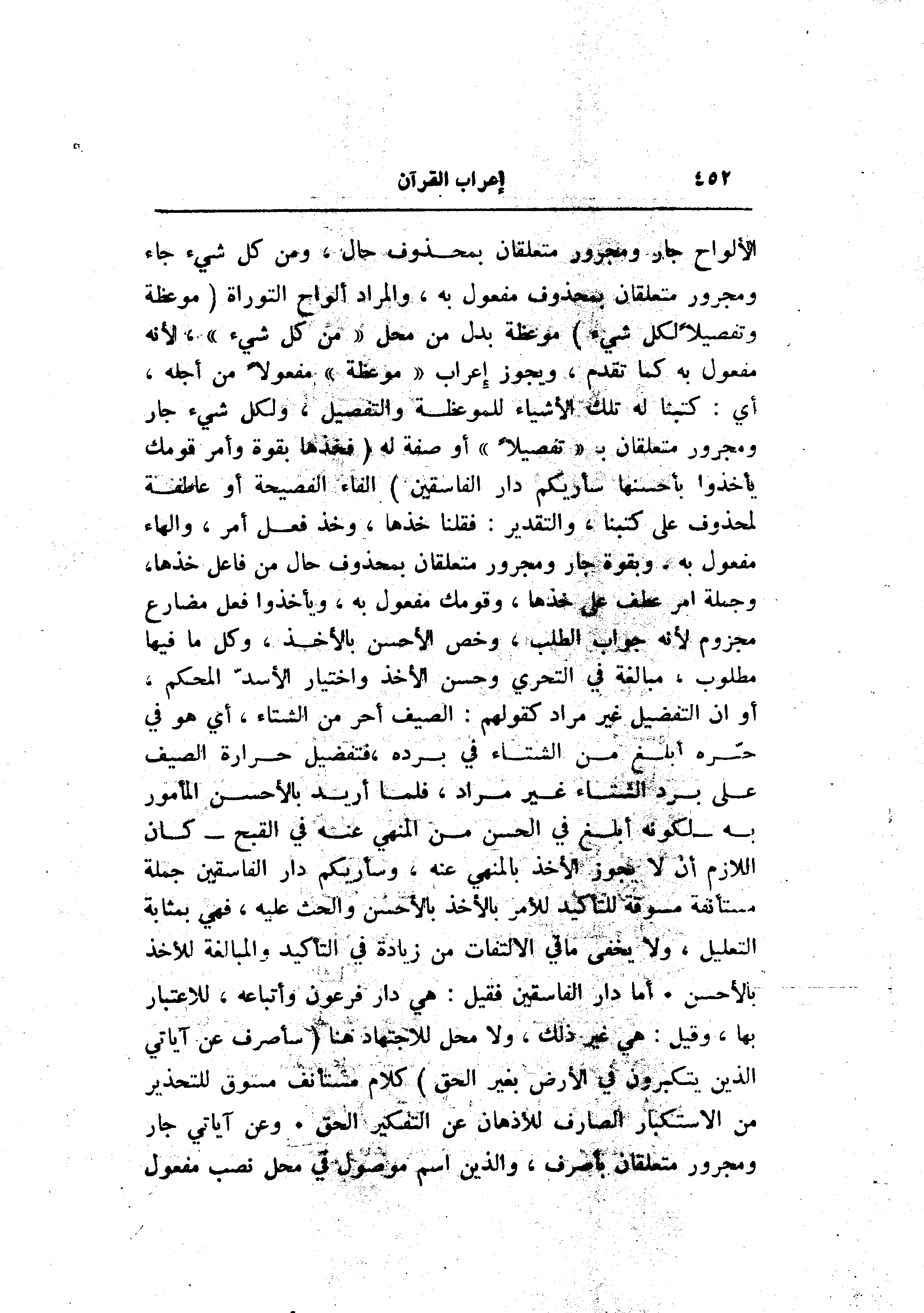 الألواح جار ومجرور متعلقان بمحذوف حال، ومن كل شيء جاء ومجرور متعلقان بمحذوف مفعول به، والمراد ألواح التوراة (مَوْعِظَةً وَتَفْصِيلًا لِكُلِّ شَيْءٍ) موعظة بدل من محل «من كل شيء» ، لأنه مفعول به كما تقدم، ويجوز إعراب «موعظة» مفعولا من أجله، أي: كتبنا له تلك الأشياء للموعظة والتفصيل، ولكل شيء جار ومجرور متعلقان ب «تفصيلا» أو صفة له (فَخُذْها بِقُوَّةٍ وَأْمُرْ قَوْمَكَ يَأْخُذُوا بِأَحْسَنِها سَأُرِيكُمْ دارَ الْفاسِقِينَ) الفاء الفصيحة أو عاطفة لمحذوف على كتبنا، والتقدير: فقلنا خذها، وخذ فعل أمر، والهاء مفعول به. وبقوة جار ومجرور متعلقان بمحذوف حال من فاعل خذها، وجملة امر عطف على خذها، وقومك مفعول به، ويأخذوا فعل مضارع مجزوم لأنه جواب الطلب، وخص الأحسن بالأخذ، وكل ما فيها مطلوب، مبالغة في التحري وحسن الأخذ واختيار الأسدّ المحكم، أو ان التفضيل غير مراد كقولهم: الصيف أحر من الشتاء، أي هو في حرّه أبلغ من الشتاء في برده، فتفضيل حرارة الصيف على برد الشتاء غير مراد، فلما أريد بالأحسن المأمور به- لكونه أبلغ في الحسن من المنهي عنه في القبح- كان اللازم أن لا يجوز الأخذ بالمنهي عنه، وسأريكم دار الفاسقين جملة مستأنفة مسوقة للتأكيد للأمر بالأخذ بالأحسن والحث عليه، فهي بمثابة التعليل، ولا يخفى ما في الالتفات من زيادة في التأكيد والمبالغة للأخذ بالأحسن. أما دار الفاسقين فقيل: هي دار فرعون وأتباعه، للاعتبار بها، وقيل: هي غير ذلك، ولا محل للاجتهاد هنا (سَأَصْرِفُ عَنْ آياتِيَ الَّذِينَ يَتَكَبَّرُونَ فِي الْأَرْضِ بِغَيْرِ الْحَقِّ) كلام مستأنف مسوق للتحذير من الاستكبار الصارف للأذهان عن التفكير الحق. وعن آياتي جار ومجرور متعلقان بأصرف، والذين اسم موصول في محل نصب مفعول