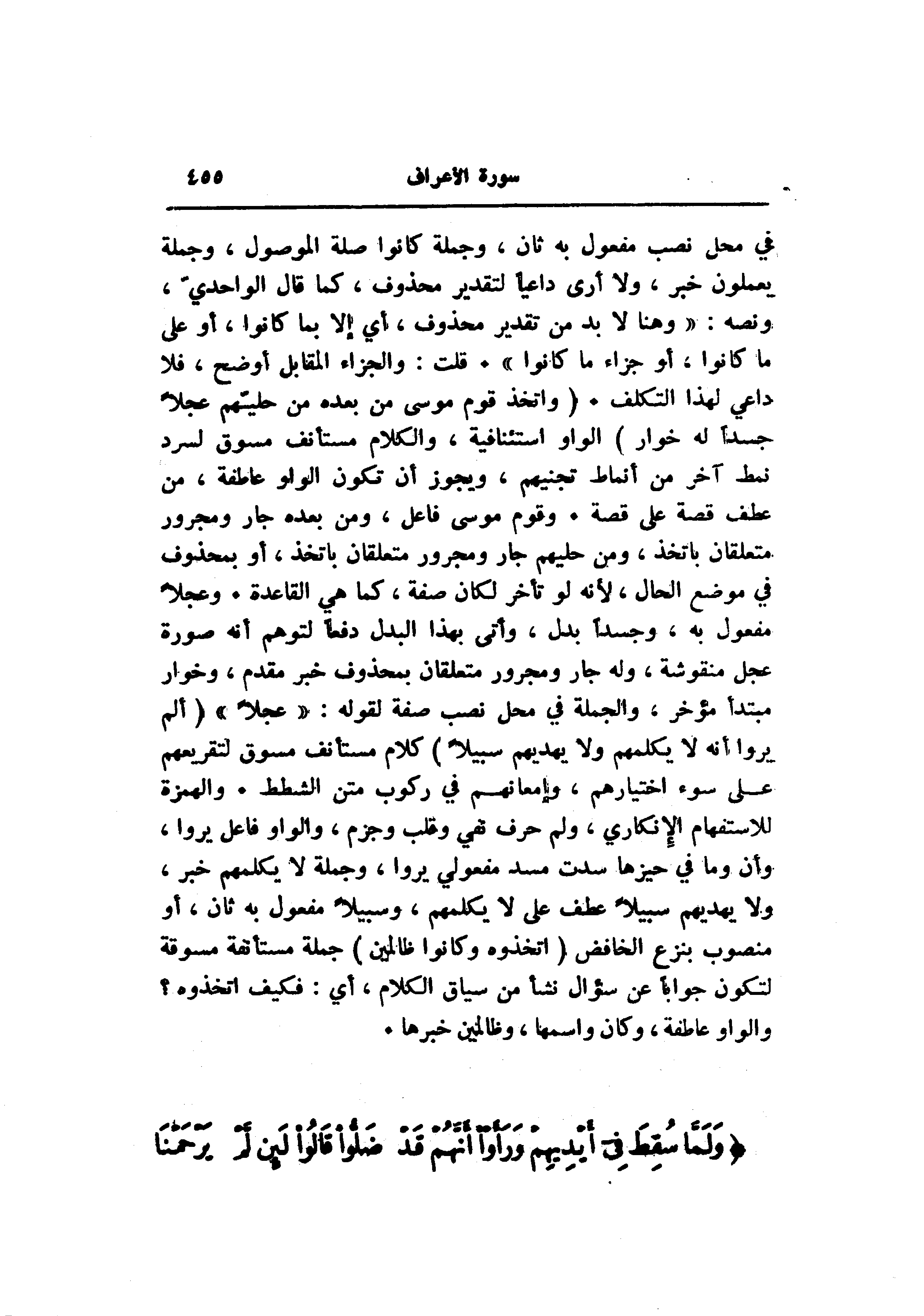 في محل نصب مفعول به ثان، وجملة كانوا صلة الموصول، وجملة يعملون خبر، ولا أرى داعيا لتقدير محذوف، كما قال الواحديّ، ونصه: «وهنا لا بد من تقدير محذوف، أي إلا بما كانوا، أو على ما كانوا، أو جزاء ما كانوا» . قلت: والجزاء المقابل أوضح، فلا داعي لهذا التكلف. (وَاتَّخَذَ قَوْمُ مُوسى مِنْ بَعْدِهِ مِنْ حُلِيِّهِمْ عِجْلًا جَسَداً لَهُ خُوارٌ) الواو استئنافية، والكلام مستأنف مسوق لسرد نمط آخر من أنماط تجنيهم، ويجوز أن تكون الواو عاطفة، من عطف قصة على قصة. وقوم موسى فاعل، ومن بعده جار ومجرور متعلقان باتخذ، ومن حليهم جار ومجرور متعلقان باتخذ، أو بمحذوف في موضع الحال، لأنه لو تأخر لكان صفة، كما هي القاعدة. وعجلا مفعول به، وجسدا بدل، وأتى بهذا البدل دفعا لتوهم أنه صورة عجل منقوشة، وله جار ومجرور متعلقان بمحذوف خبر مقدم، وخوار مبتدأ مؤخر، والجملة في محل نصب صفة لقوله: «عجلا» (أَلَمْ يَرَوْا أَنَّهُ لا يُكَلِّمُهُمْ وَلا يَهْدِيهِمْ سَبِيلًا) كلام مستأنف مسوق لتقريعهم على سوء اختيارهم، وإمعانهم في ركوب متن الشطط. والهمزة للاستفهام الإنكاري، ولم حرف نفي وقلب وجزم، والواو فاعل يروا، وأن وما في حيزها سدت مسد مفعولي يروا، وجملة لا يكلمهم خبر، ولا يهديهم سبيلا عطف على لا يكلمهم، وسبيلا مفعول به ثان، أو منصوب بنزع الخافض (اتَّخَذُوهُ وَكانُوا ظالِمِينَ) جملة مستأنفة مسوقة لتكون جوابا عن سؤال نشأ من سياق الكلام، أي: فكيف اتخذوه؟