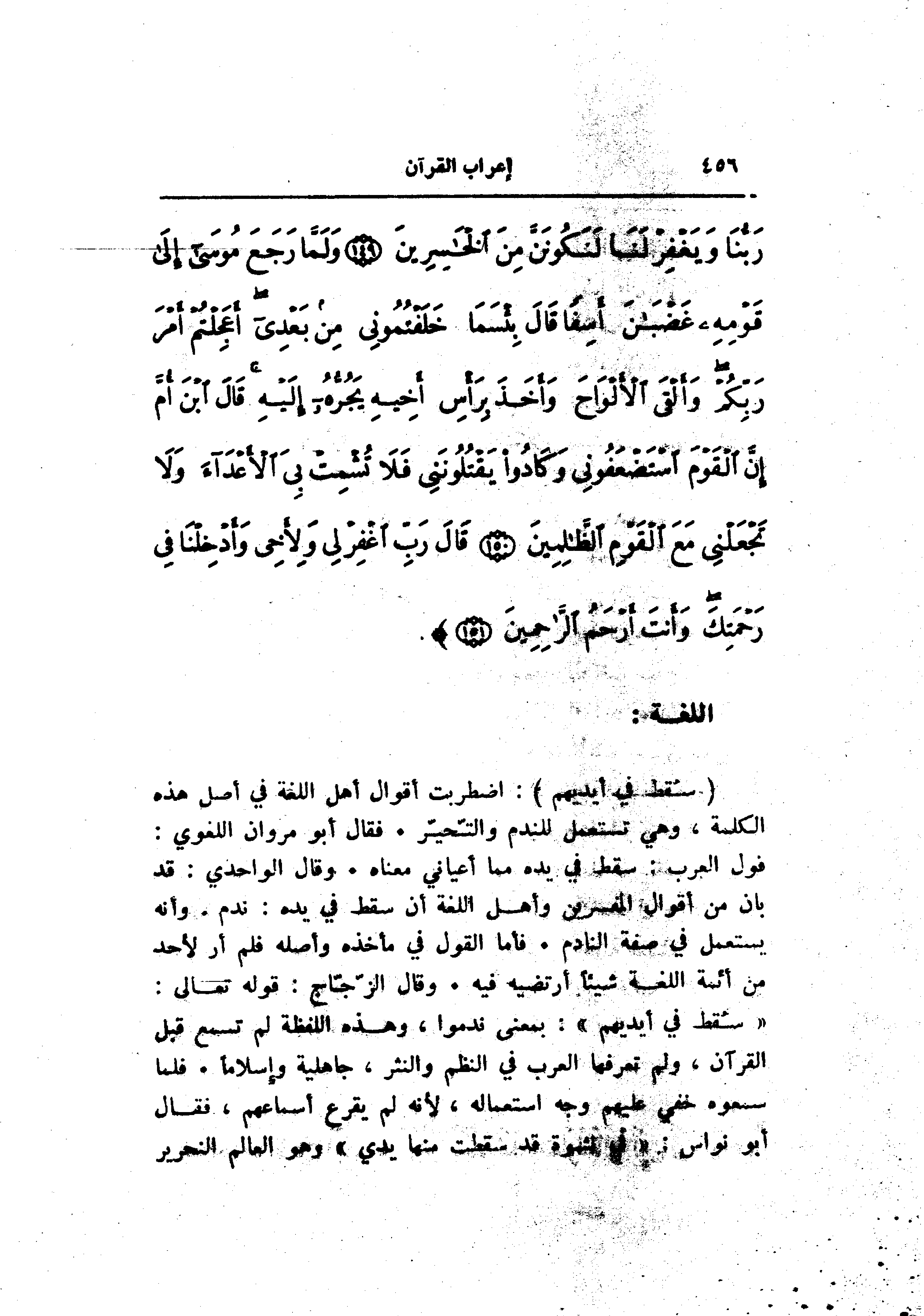 «سقط في أيديهم» : بمعنى ندموا، وهذه اللفظة لم تسمع قبل القرآن، ولم تعرفها العرب في النظم والنثر، جاهلية وإسلاما. فلما سمعوه خفي عليهم وجه استعماله، لأنه لم يقرع أسماعهم، فقال أبو نواس: «في نشوة قد سقطت منها يدي» وهو العالم النحرير