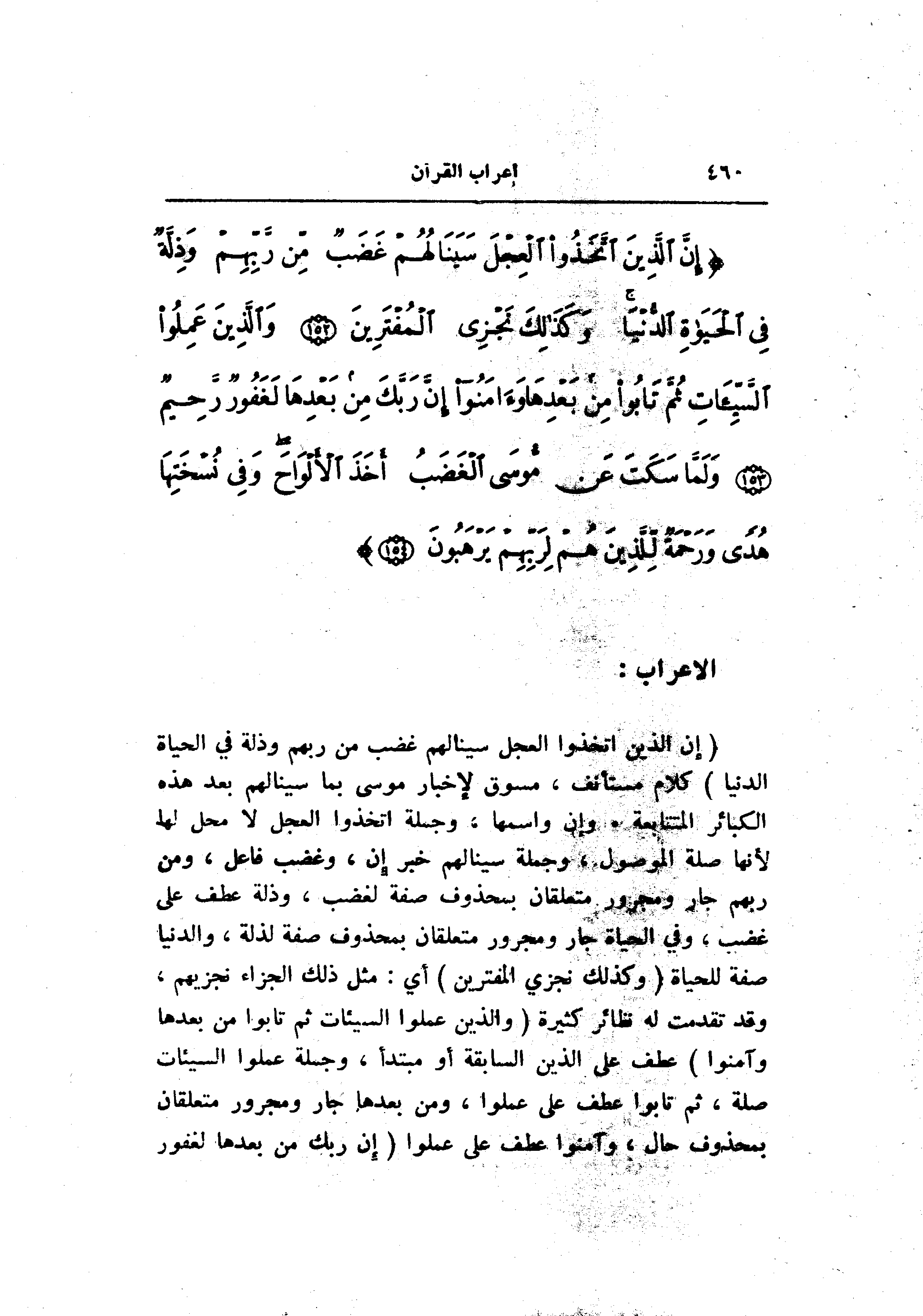 (إِنَّ الَّذِينَ اتَّخَذُوا الْعِجْلَ سَيَنالُهُمْ غَضَبٌ مِنْ رَبِّهِمْ وَذِلَّةٌ فِي الْحَياةِ الدُّنْيا) كلام مستأنف، مسوق لإخبار موسى بما سينالهم بعد هذه الكبائر المتتابعة. وإن واسمها، وجملة اتخذوا العجل لا محل لها لأنها صلة الموصول، وجملة سينالهم خبر إن، وغضب فاعل، ومن ربهم جار ومجرور متعلقان بمحذوف صفة لغضب، وذلة عطف على غضب، وفي الحياة جار ومجرور متعلقان بمحذوف صفة لذلة، والدنيا صفة للحياة (وَكَذلِكَ نَجْزِي الْمُفْتَرِينَ) أي: مثل ذلك الجزاء نجزيهم، وقد تقدمت له نظائر كثيرة (وَالَّذِينَ عَمِلُوا السَّيِّئاتِ ثُمَّ تابُوا مِنْ بَعْدِها وَآمَنُوا) عطف على الذين السابقة أو مبتدأ، وجملة عملوا السيئات صلة، ثم تابوا عطف على عملوا، ومن بعدها جار ومجرور متعلقان بمحذوف حال، وآمنوا عطف على عملوا (إِنَّ رَبَّكَ مِنْ بَعْدِها لَغَفُورٌ