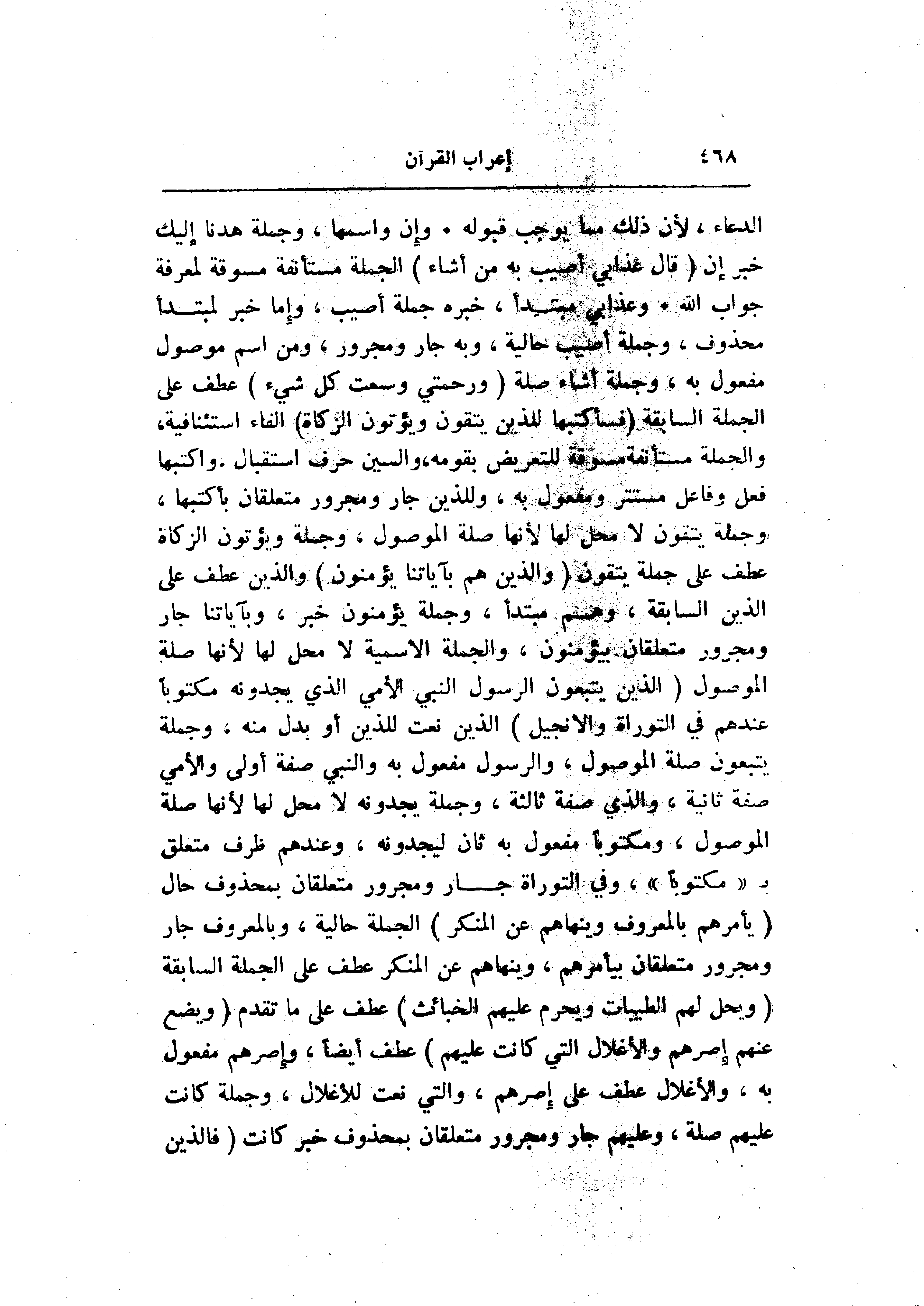 الدعاء، لأن ذلك مما يوجب قبوله. وإن واسمها، وجملة هدنا إليك خبر إن (قالَ عَذابِي أُصِيبُ بِهِ مَنْ أَشاءُ) الجملة مستأنفة مسوقة لمعرفة جواب الله. وعذابي مبتدأ، خبره جملة أصيب، وإما خبر لمبتدأ محذوف، وجملة أصيب حالية، وبه جار ومجرور، ومن اسم موصول مفعول به، وجملة أشاء صلة (وَرَحْمَتِي وَسِعَتْ كُلَّ شَيْءٍ) عطف على الجملة السابقة (فَسَأَكْتُبُها لِلَّذِينَ يَتَّقُونَ وَيُؤْتُونَ الزَّكاةَ) الفاء استئنافية، والجملة مستأنفة مسوقة للتعريض بقومه، والسين حرف استقبال، واكتبها فعل وفاعل مستتر ومفعول به، وللذين جار ومجرور متعلقان بسأكتبها، وجملة يتقون لا محل لها لأنها صلة الموصول، وجملة ويؤتون الزكاة عطف على جملة يتقون (وَالَّذِينَ هُمْ بِآياتِنا يُؤْمِنُونَ) والذين عطف على الذين السابقة، وهم مبتدأ، وجملة يؤمنون خبر، وبآياتنا جار ومجرور متعلقان بيؤمنون، والجملة الاسمية لا محل لها لأنها صلة الموصول (الَّذِينَ يَتَّبِعُونَ الرَّسُولَ النَّبِيَّ الْأُمِّيَّ الَّذِي يَجِدُونَهُ مَكْتُوباً عِنْدَهُمْ فِي التَّوْراةِ وَالْإِنْجِيلِ) الذين نعت للذين أو بدل منه، وجملة يتبعون صلة الموصول، والرسول مفعول به والنبي صفة أولى والأمي صفة ثانية، والذي صفة ثالثة، وجملة يجدونه لا محل لها لأنها صلة الموصول، ومكتوبا مفعول به ثان ليجدونه، وعندهم ظرف متعلق ب «مكتوبا» ، وفي التوراة جار ومجرور متعلقان بمحذوف حال (يَأْمُرُهُمْ بِالْمَعْرُوفِ وَيَنْهاهُمْ عَنِ الْمُنْكَرِ) الجملة حالية، وبالمعروف جار ومجرور متعلقان بيأمرهم، وينهاهم عن المنكر عطف على الجملة السابقة (وَيُحِلُّ لَهُمُ الطَّيِّباتِ وَيُحَرِّمُ عَلَيْهِمُ الْخَبائِثَ) عطف على ما تقدم (وَيَضَعُ عَنْهُمْ إِصْرَهُمْ وَالْأَغْلالَ الَّتِي كانَتْ عَلَيْهِمْ) عطف أيضا، وإصرهم مفعول به، والأغلال عطف على إصرهم، والتي نعت للأغلال، وجملة كانت عليهم صلة، وعليهم جار ومجرور متعلقان بمحذوف خبر كانت (فَالَّذِينَ