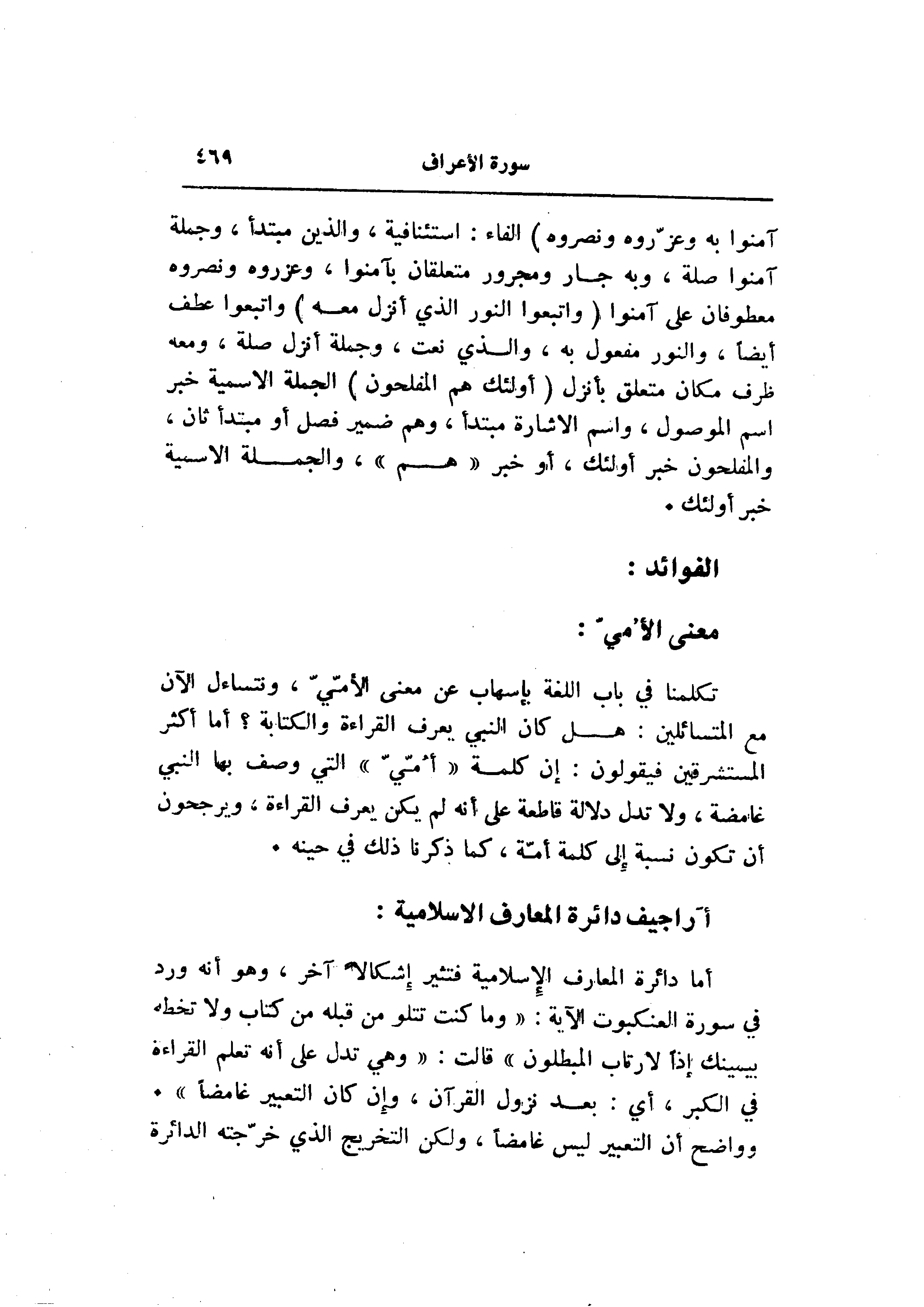 تكلمنا في باب اللغة بإسهاب عن معنى الأمّيّ، ونتساءل الآن مع المتسائلين: هل كان النبي يعرف القراءة والكتابة؟ أما أكثر المستشرقين فيقولون: إن كلمة «أمّيّ» التي وصف بها النبي غامضة، ولا تدل دلالة قاطعة على أنه لم يكن يعرف القراءة، ويرجحون أن تكون نسبة إلى كلمة أمّة، كما ذكرنا ذلك في حينه.