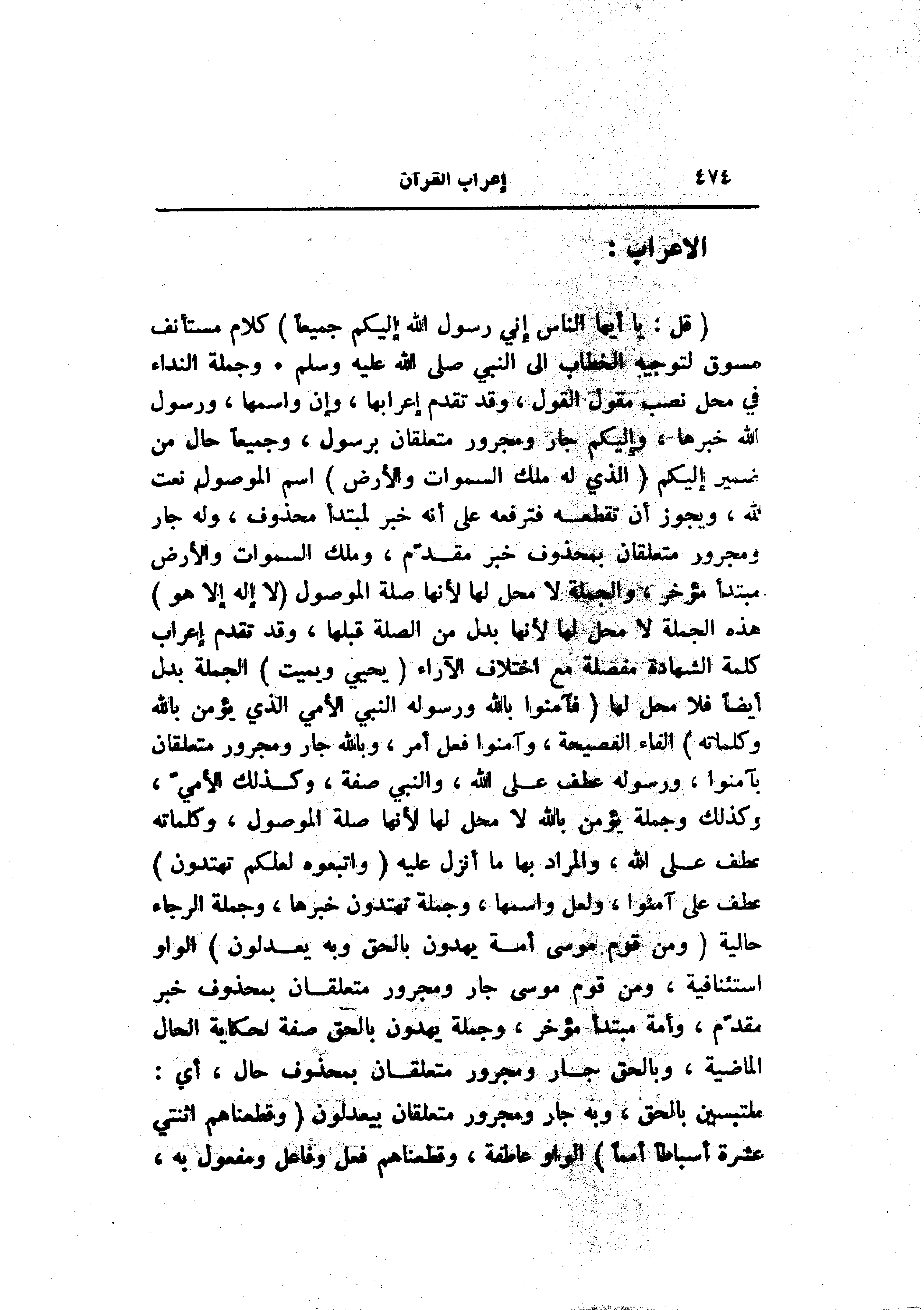(قُلْ: يا أَيُّهَا النَّاسُ إِنِّي رَسُولُ اللَّهِ إِلَيْكُمْ جَمِيعاً) كلام مستأنف مسوق لتوجيه الخطاب الى النبي صلى الله عليه وسلم. وجملة النداء في محل نصب مقول القول، وقد تقدم إعرابها، وإن واسمها، ورسول الله خبرها، وإليكم جار ومجرور متعلقان برسول، وجميعا حال من ضمير إليكم (الَّذِي لَهُ مُلْكُ السَّماواتِ وَالْأَرْضِ) اسم الموصول نعت لله، ويجوز أن تقطعه فترفعه على أنه خبر لمبتدأ محذوف، وله جار ومجرور متعلقان بمحذوف خبر مقدّم، وملك السموات والأرض مبتدأ مؤخر، والجملة لا محل لها لأنها صلة الموصول (لا إِلهَ إِلَّا هُوَ) هذه الجملة لا محل لها لأنها بدل من الصلة قبلها، وقد تقدم إعراب كلمة الشهادة مفصلة مع اختلاف الآراء (يُحيِي وَيُمِيتُ) الجملة بدل أيضا فلا محل لها (فَآمِنُوا بِاللَّهِ وَرَسُولِهِ النَّبِيِّ الْأُمِّيِّ الَّذِي يُؤْمِنُ بِاللَّهِ وَكَلِماتِهِ) الفاء الفصيحة، وآمنوا فعل أمر، وبالله جار ومجرور متعلقان بآمنوا، ورسوله عطف على الله، والنبي صفة، وكذلك الأميّ، وكذلك وجملة يؤمن بالله لا محل لها لأنها صلة الموصول، وكلماته عطف على الله، والمراد بها ما أنزل عليه (وَاتَّبِعُوهُ لَعَلَّكُمْ تَهْتَدُونَ) عطف على الله، والمراد بها ما أنزل عليه (وَاتَّبِعُوهُ لَعَلَّكُمْ تَهْتَدُونَ) عطف على آمنوا، ولعل واسمها، وجملة تهتدون خبرها، وجملة الرجاء حالية (وَمِنْ قَوْمِ مُوسى أُمَّةٌ يَهْدُونَ بِالْحَقِّ وَبِهِ يَعْدِلُونَ) الواو استئنافية، ومن قوم موسى جار ومجرور متعلقان بمحذوف خبر مقدّم، وأمة مبتدأ مؤخر، وجملة يهدون بالحق صفة لحكاية الحال الماضية، وبالحق جار ومجرور متعلقان بمحذوف حال، أي: