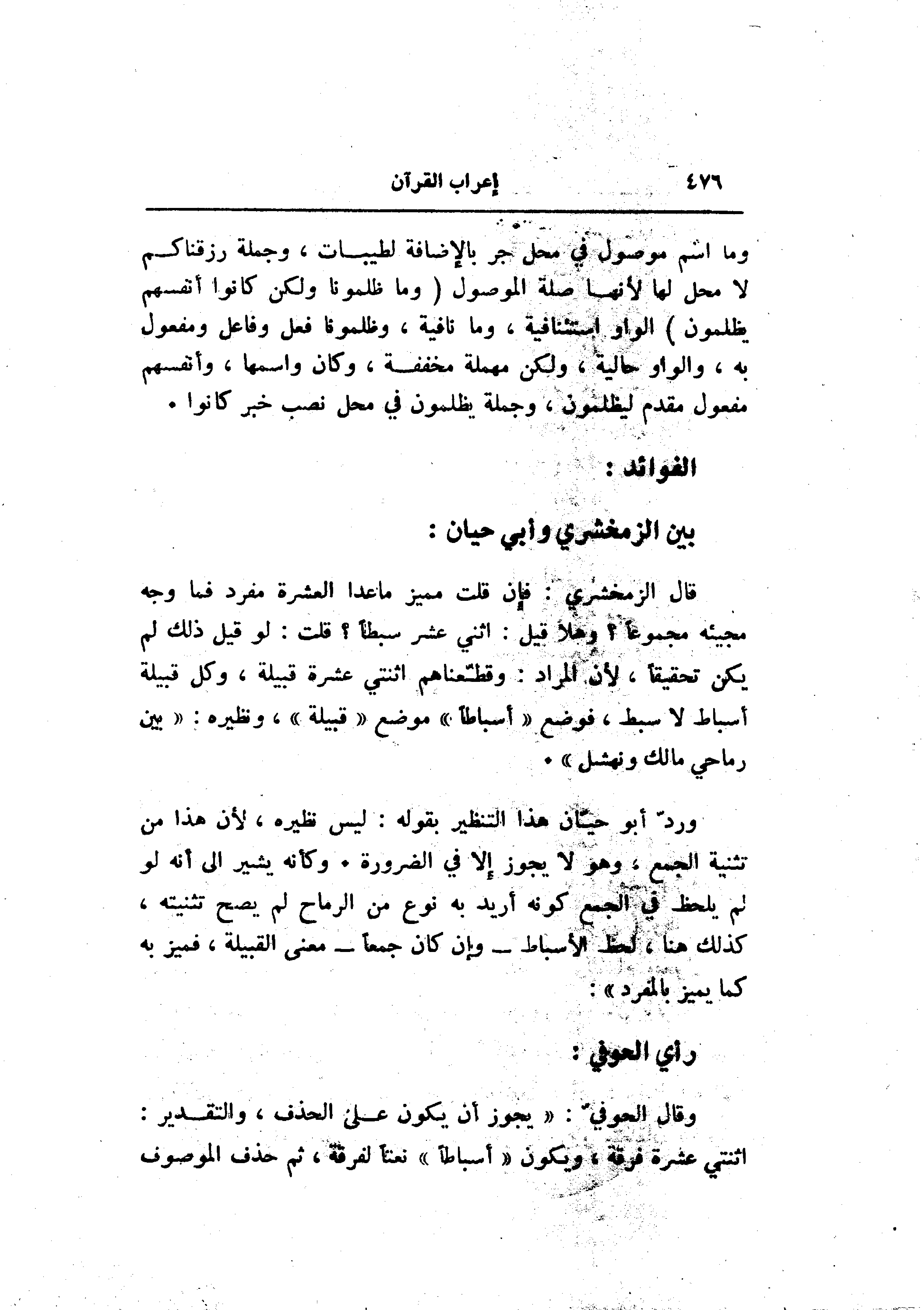وردّ أبو حيّان هذا التنظير بقوله: ليس نظيره، لأن هذا من تثنية الجمع، وهو لا يجوز إلا في الضرورة. وكأنه يشير الى أنه لو لم يلحظ في الجمع كونه أريد به نوع من الرماح لم يصح تثنيته، كذلك هنا، لحظ الأسباط- وإن كان جمعا- معنى القبيلة، فميز به كما يميز بالمفرد» :