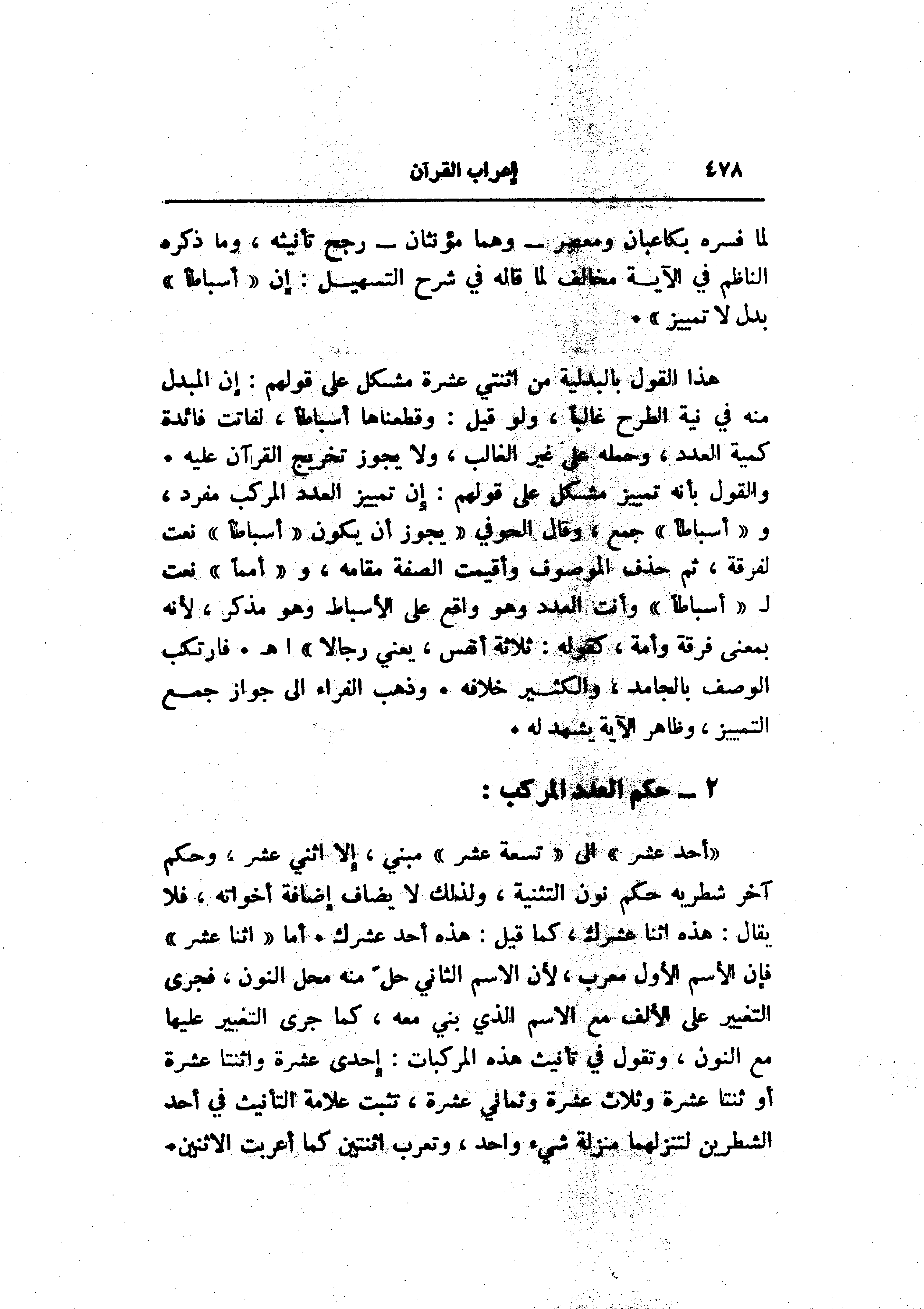 «أحد عشر» الى «تسعة عشر» مبني، إلا اثني عشر، وحكم آخر شطريه حكم نون التثنية، ولذلك لا يضاف إضافة أخواته، فلا يقال: هذه اثنا عشرك، كما قيل: هذه أحد عشرك. أما «اثنا عشر» فإن الاسم الأول معرب، لأن الاسم الثاني حلّ منه محل النون، فجرى التغيير على الألف مع الاسم الذي بني معه، كما جرى التغيير عليها مع النون، وتقول في تأنيث هذه المركبات: إحدى عشرة واثنتا عشرة أو ثنتا عشرة وثلاث عشرة وثماني عشرة، تثبت علامة التأنيث في أحد الشطرين لتنزلهما منزلة شيء واحد، وتعرب اثنتين كما أعربت الاثنين.