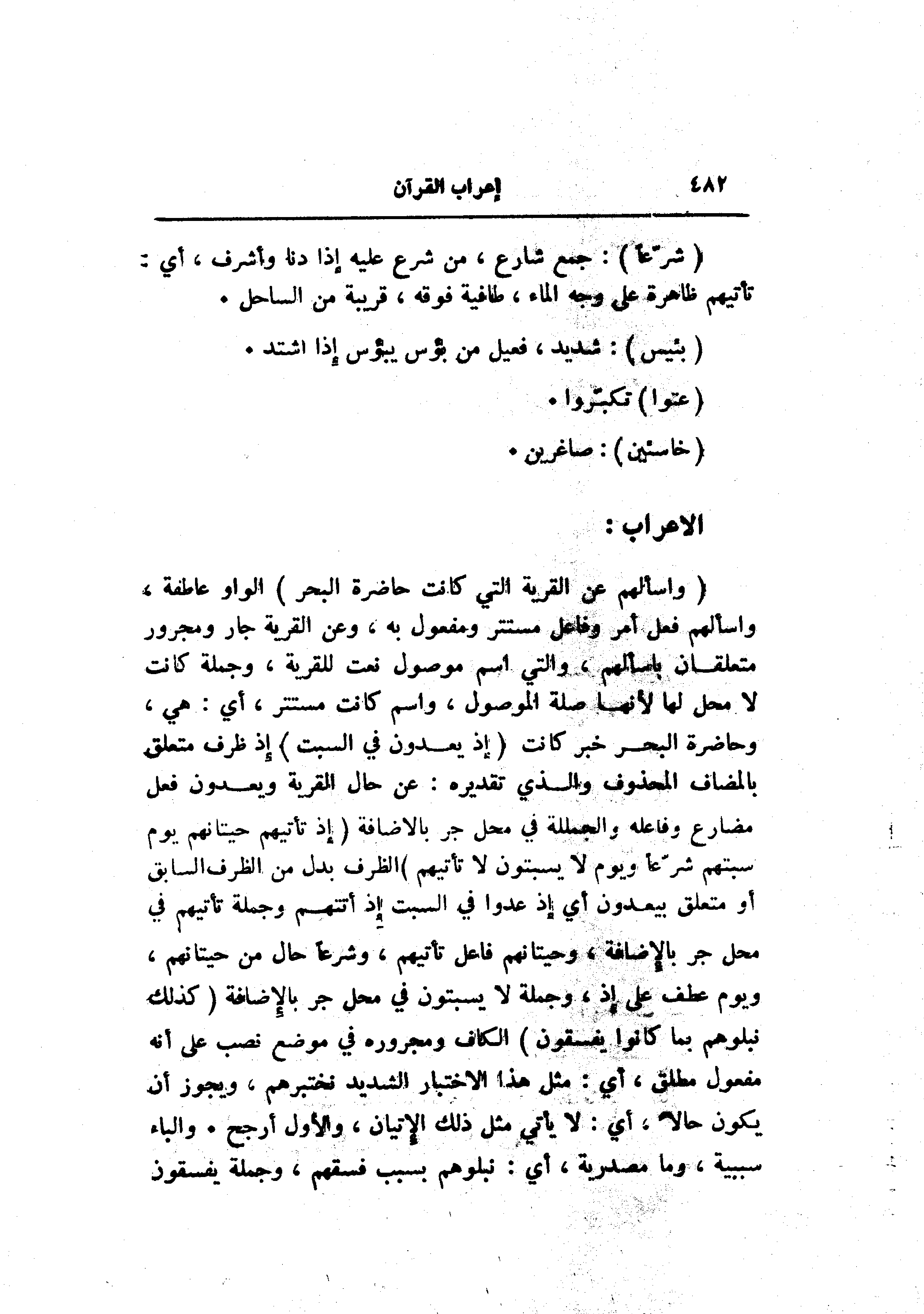 (وَسْئَلْهُمْ عَنِ الْقَرْيَةِ الَّتِي كانَتْ حاضِرَةَ الْبَحْرِ) الواو عاطفة، واسألهم فعل أمر وفاعل مستتر ومفعول به، وعن القرية جار ومجرور متعلقان باسألهم، والتي اسم موصول نعت للقرية، وجملة كانت لا محل لها لأنها صلة الموصول، واسم كانت مستتر، أي: هي، وحاضرة البحر خبر كانت (إِذْ يَعْدُونَ فِي السَّبْتِ) إذ ظرف متعلق بالمضاف المحذوف والذي تقديره: عن حال القرية ويعدون فعل مضارع وفاعله والجملة في محل جر بالاضافة (إِذْ تَأْتِيهِمْ حِيتانُهُمْ يَوْمَ سَبْتِهِمْ شُرَّعاً وَيَوْمَ لا يَسْبِتُونَ لا تَأْتِيهِمْ) الظرف بدل من الظرف السابق أو متعلق بيعدون أي إذ عدوا في السبت إذ أتتهم وجملة تأتيهم في محل جر بالإضافة، وحيتانهم فاعل تأتيهم، وشرعا حال من حيتانهم، ويوم عطف على إذ، وجملة لا يسبتون في محل جر بالإضافة (كَذلِكَ نَبْلُوهُمْ بِما كانُوا يَفْسُقُونَ) الكاف ومجروره في موضع نصب على أنه مفعول مطلق، أي: مثل هذا الاختبار الشديد نختبرهم، ويجوز أن يكون حالا، أي: لا يأتي مثل ذلك الإتيان، والأول أرجح. والباء سببية، وما مصدرية، أي: نبلوهم بسبب فسقهم، وجملة يفسقون