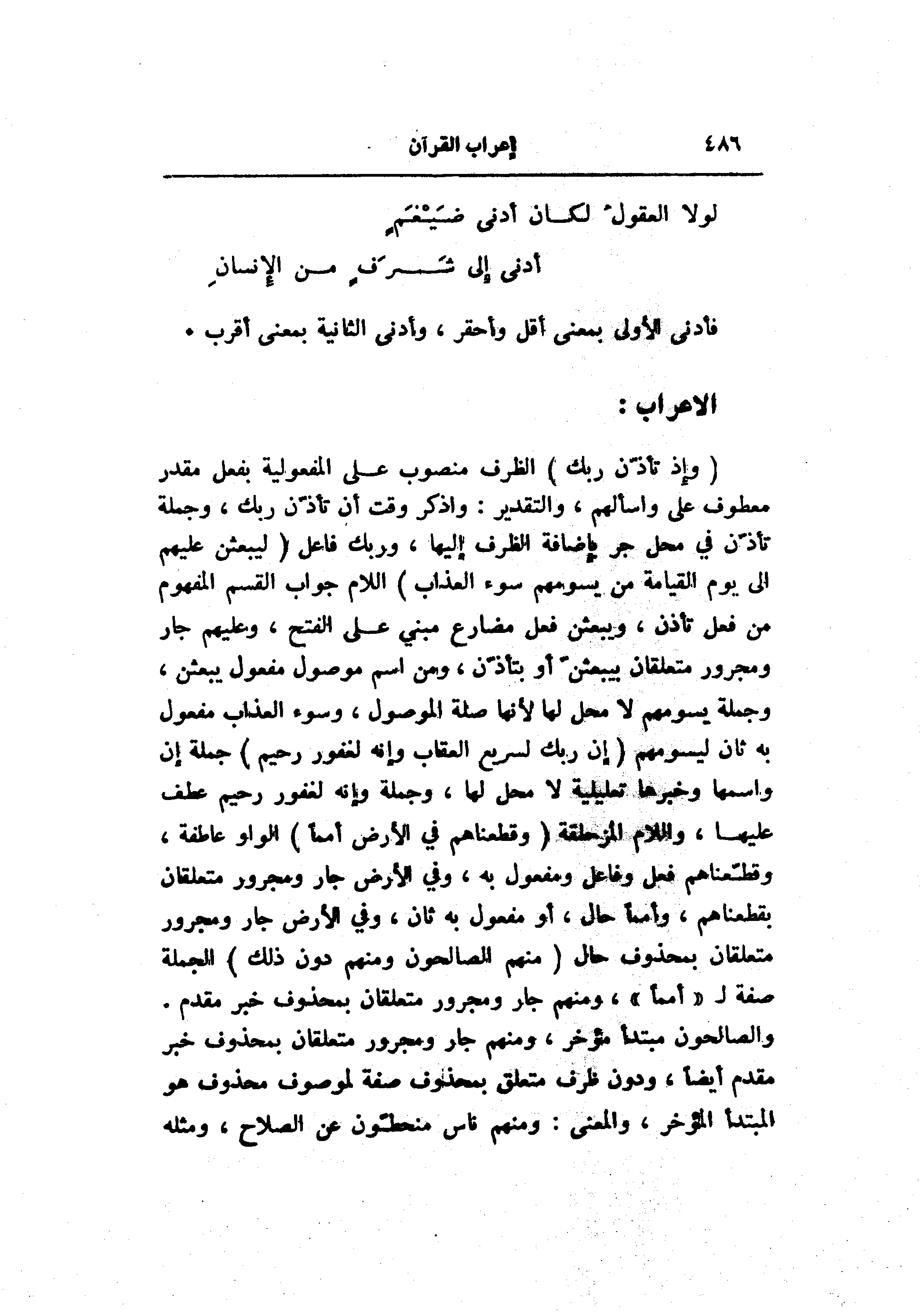 (وَإِذْ تَأَذَّنَ رَبُّكَ) الظرف منصوب على المفعولية بفعل مقدر معطوف على واسألهم، والتقدير: واذكر وقت أن تأذّن ربك، وجملة تأذّن في محل جر بإضافة الظرف إليها، وربك فاعل (لَيَبْعَثَنَّ عَلَيْهِمْ إِلى يَوْمِ الْقِيامَةِ مَنْ يَسُومُهُمْ سُوءَ الْعَذابِ) اللام جواب القسم المفهوم من فعل تأذن، ويبعثن فعل مضارع مبني على الفتح، وعليهم جار ومجرور متعلقان بيبعثنّ أو بتأذّن، ومن اسم موصول مفعول يبعثن، وجملة يسومهم لا محل لها لأنها صلة الموصول، وسوء العذاب مفعول به ثان ليسومهم (إِنَّ رَبَّكَ لَسَرِيعُ الْعِقابِ وَإِنَّهُ لَغَفُورٌ رَحِيمٌ) جملة إن واسمها وخبرها تعليلية لا محل لها، وجملة وإنه لغفور رحيم عطف عليها، واللام المزحلقة (وَقَطَّعْناهُمْ فِي الْأَرْضِ أُمَماً) الواو عاطفة، وقطّعناهم فعل وفاعل ومفعول به، وفي الأرض جار ومجرور متعلقان بقطعناهم، وأمما حال، أو مفعول به ثان، وفي الأرض جار ومجرور متعلقان بمحذوف حال (مِنْهُمُ الصَّالِحُونَ وَمِنْهُمْ دُونَ ذلِكَ) الجملة صفة ل «أمما» ، ومنهم جار ومجرور متعلقان بمحذوف خبر مقدم.