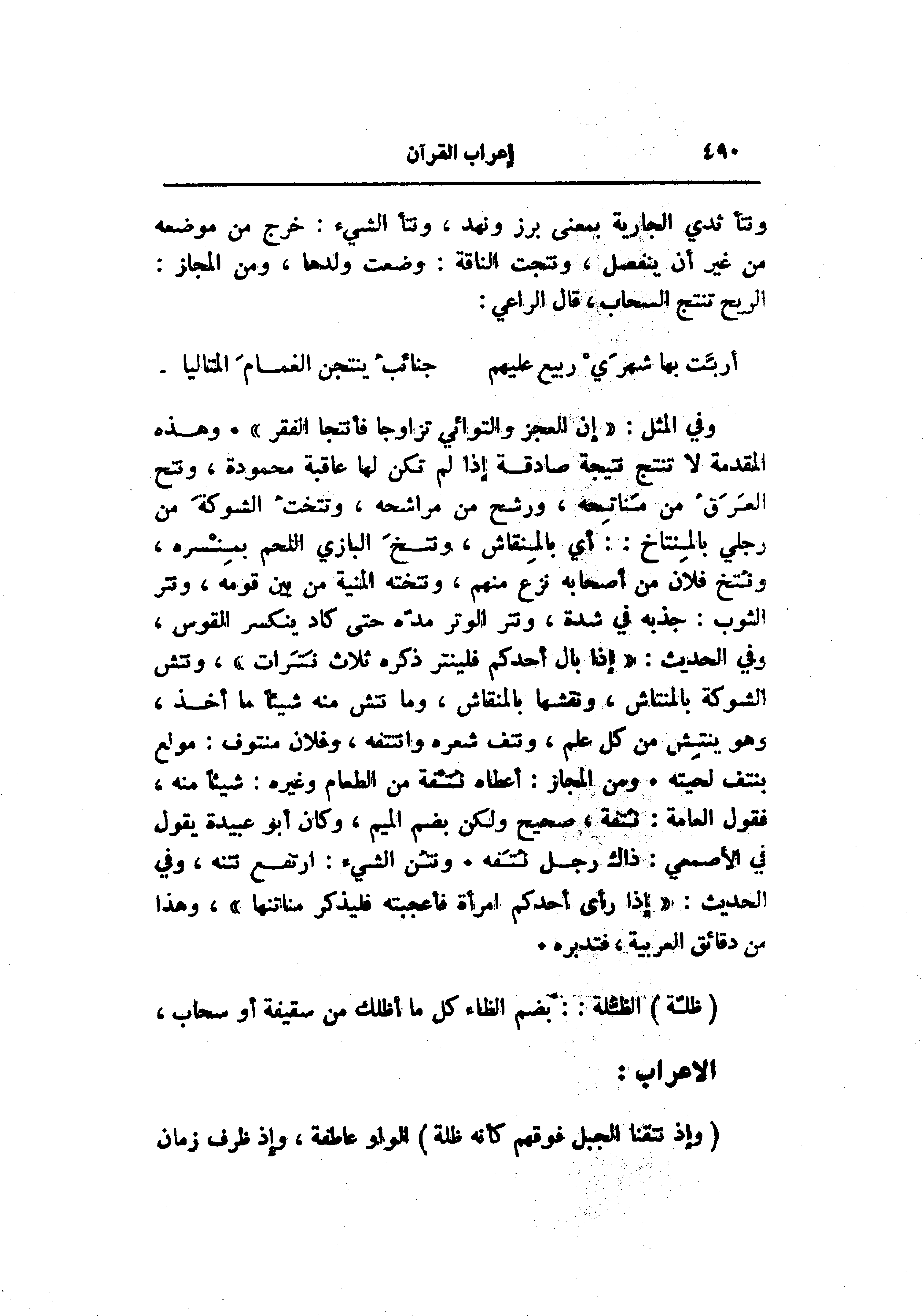 وفي المثل: «إن العجز والتوائي تزاوجا فأنتجا الفقر» . وهذه المقدمة لا تنتج نتيجة صادقة إذا لم تكن لها عاقبة محمودة، ونتح العرق من مناتحه، ورشح من مراشحه، وتتخت الشوكة من رجلي بالمنتاخ: أي بالمنقاش، ونتخ البازي اللحم بمنسره، ونتخ فلان من أصحابه نزع منهم، ونتخته المنية من بين قومه، ونتر الثوب: جذبه في شدة، ونتر الوتر مدّه حتى كاد ينكسر القوس، وفي الحديث: «إذا بال أحدكم فلينتر ذكره ثلاث نترات» ، ونتش الشوكة بالمنتاش، ونقشها بالمنقاش، وما نتش منه شيئا ما أخذ، وهو ينتش من كل علم، ونتف شعره وانتتفه، وفلان منتوف: مولع بنتف لحيته. ومن المجاز: أعطاه نتفة من الطعام وغيره: شيئا منه، فقول العامة: نتفة، صحيح ولكن بضم الميم، وكان أبو عبيدة يقول في الأصمعي: ذاك رجل نتفه. ونتن الشيء: ارتفع نتنه، وفي الحديث: «إذا رأى أحدكم امرأة فأعجبته فليذكر مناتنها» ، وهذا من دقائق العربية، فتدبره.