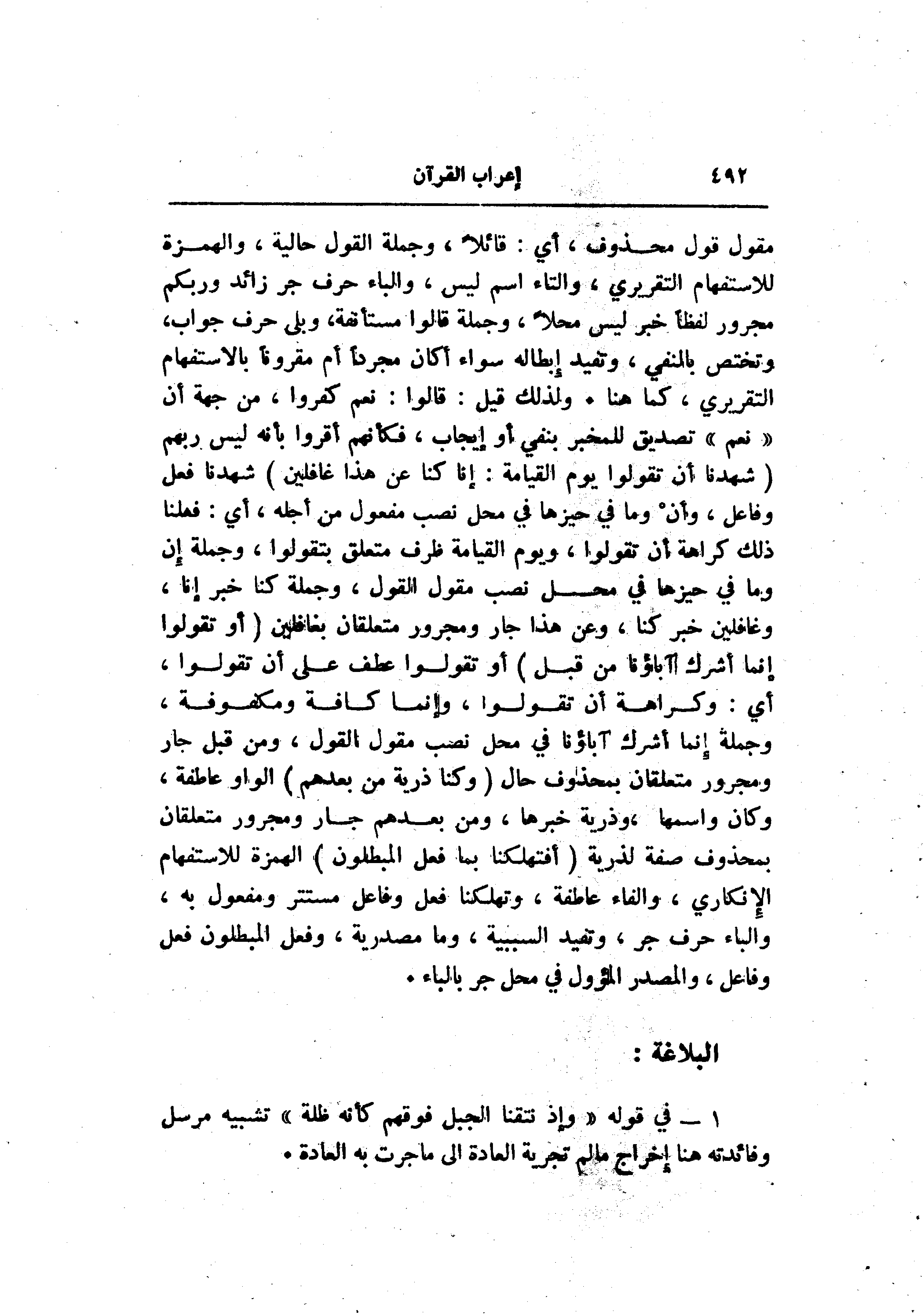 مقول قول محذوف، أي: قائلا، وجملة القول حالية، والهمزة للاستفهام التقريري، والتاء اسم ليس، والباء حرف جر زائد وربكم مجرور لفظا خبر ليس محلا، وجملة قالوا مستأنفة، وبلى حرف جواب، وتختص بالنفي، وتفيد إبطاله سواء أكان مجردا أم مقرونا بالاستفهام التقريري، كما هنا. ولذلك قيل: قالوا: نعم كفروا، من جهة أن «نعم» تصديق للمخبر بنفي أو إيجاب، فكأنهم أقروا بأنه ليس ربهم (شَهِدْنا أَنْ تَقُولُوا يَوْمَ الْقِيامَةِ: إِنَّا كُنَّا عَنْ هذا غافِلِينَ) شهدنا فعل وفاعل، وأن وما في حيزها في محل نصب مفعول من أجله، أي: فعلنا ذلك كراهة أن تقولوا، ويوم القيامة ظرف متعلق بتقولوا، وجملة إن وما في حيزها في محل نصب مقول القول، وجملة كنا خبر إنا، وغافلين خبر كنا، وعن هذا جار ومجرور متعلقان بغافلين (أَوْ تَقُولُوا إِنَّما أَشْرَكَ آباؤُنا مِنْ قَبْلُ) أو تقولوا عطف على أن تقولوا، أي: وكراهة أن تقولوا، وإنما كافة ومكفوفة، وجملة إنما أشرك آباؤنا في محل نصب مقول القول، ومن قبل جار ومجرور متعلقان بمحذوف حال (وَكُنَّا ذُرِّيَّةً مِنْ بَعْدِهِمْ) الواو عاطفة، وكان واسمها، وذرية خبرها، ومن بعدهم جار ومجرور متعلقان بمحذوف صفة لذرية (أَفَتُهْلِكُنا بِما فَعَلَ الْمُبْطِلُونَ) الهمزة للاستفهام الإنكاري، والفاء عاطفة، وتهلكنا فعل وفاعل مستتر ومفعول به، والباء حرف جر، وتفيد السببية، وما مصدرية، وفعل المبطلون فعل وفاعل، والمصدر المؤول في محل جر بالباء.