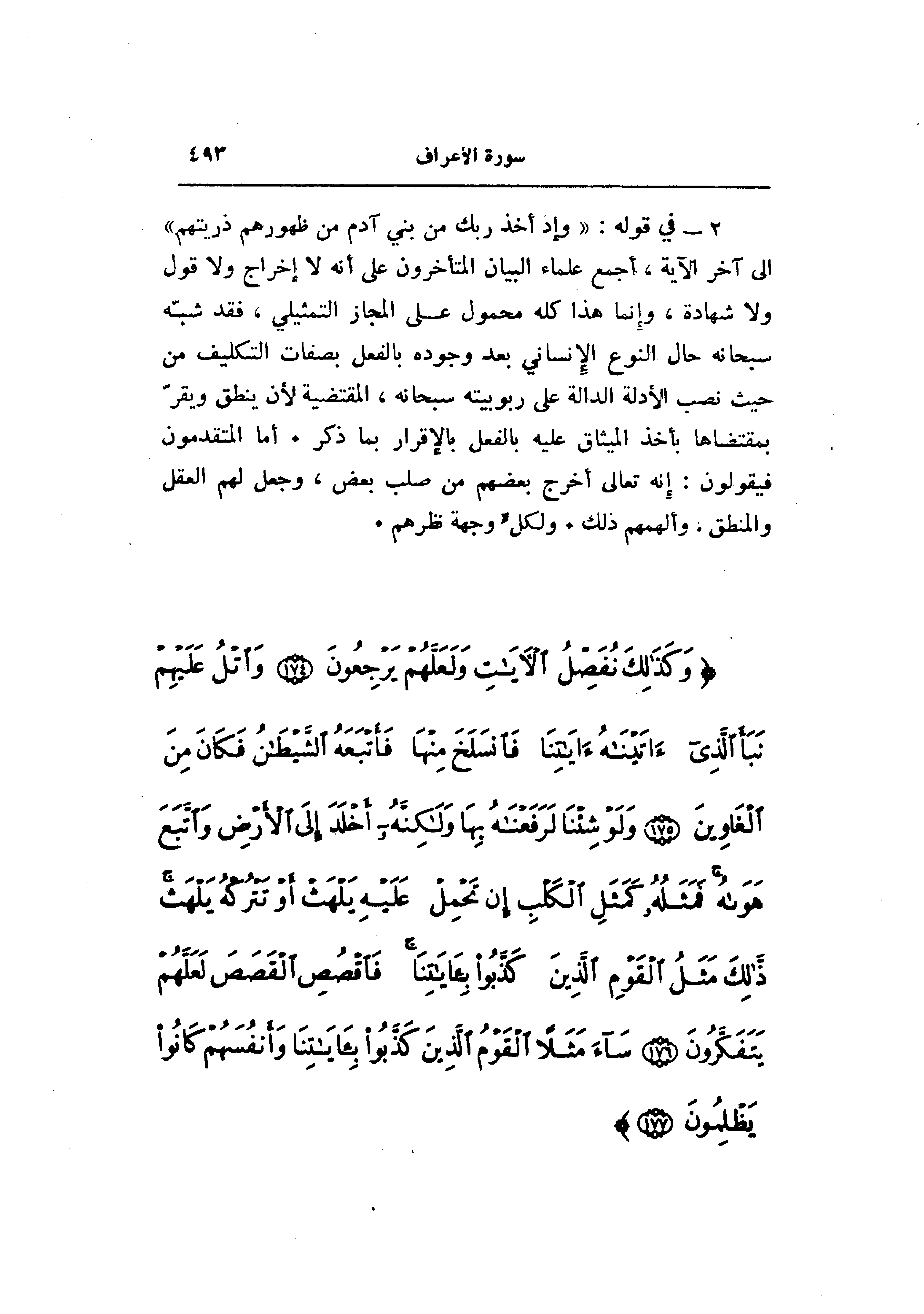 2- في قوله: «وإذ أخذ ربك من بني آدم من ظهورهم ذريتهم» الى آخر الآية، أجمع علماء البيان المتأخرون على أنه لا إخراج ولا قول ولا شهادة، وإنما هذا كله محمول على المجاز التمثيلي، فقد شبّه سبحانه حال النوع الإنساني بعد وجوده بالفعل بصفات التكليف من حيث نصب الأدلة الدالة على ربوبيته سبحانه، المقتضية لأن ينطق ويقرّ بمقتضاها بأخذ الميثاق عليه بالفعل بالإقرار بما ذكر. أما المتقدمون فيقولون: إنه تعالى أخرج بعضهم من صلب بعض، وجعل لهم العقل والمنطق، وألهمهم ذلك. ولكلّ وجهة نظرهم.