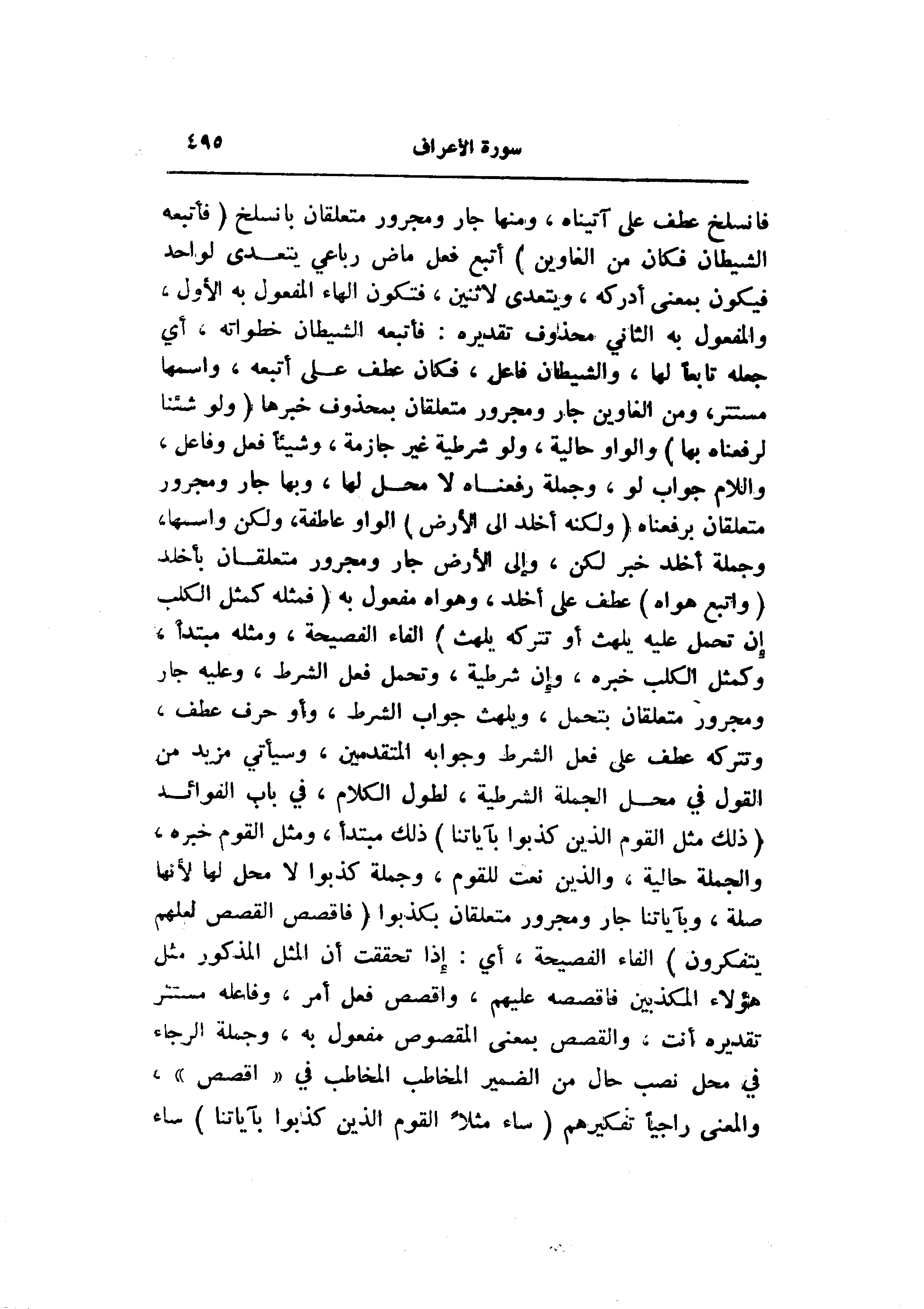 فانسلخ عطف على آتيناه، ومنها جار ومجرور متعلقان بانسلخ (فَأَتْبَعَهُ الشَّيْطانُ فَكانَ مِنَ الْغاوِينَ) أتبع فعل ماض رباعي يتعدى لواحد فيكون بمعنى أدركه، ويتعدى لاثنين، فتكون الهاء المفعول به الأول، والمفعول به الثاني محذوف تقديره: فأتبعه الشيطان خطواته، أي جعله تابعا لها، والشيطان فاعل، فكان عطف على أتبعه، واسمها مستتر، ومن الغاوين جار ومجرور متعلقان بمحذوف خبرها (وَلَوْ شِئْنا لَرَفَعْناهُ بِها) والواو حالية، ولو شرطية غير جازمة، وشيئا فعل وفاعل، واللام جواب لو، وجملة رفعناه لا محل لها، وبها جار ومجرور متعلقان برفعناه (وَلكِنَّهُ أَخْلَدَ إِلَى الْأَرْضِ) الواو عاطفة، ولكن واسمها، وجملة أخلد خبر لكن، وإلى الأرض جار ومجرور متعلقان بأخلد (وَاتَّبَعَ هَواهُ) عطف على أخلد، وهواه مفعول به (فَمَثَلُهُ كَمَثَلِ الْكَلْبِ إِنْ تَحْمِلْ عَلَيْهِ يَلْهَثْ أَوْ تَتْرُكْهُ يَلْهَثْ) الفاء الفصيحة، ومثله مبتدأ، وكمثل الكلب خبره، وإن شرطية، وتحمل فعل الشرط، وعليه جار ومجرور متعلقان بتحمل، ويلهث جواب الشرط، وأو حرف عطف، وتتركه عطف على فعل الشرط وجوابه المتقدمين، وسيأتي مزيد من القول في محل الجملة الشرطية، لطول الكلام، في باب الفوائد (ذلِكَ مَثَلُ الْقَوْمِ الَّذِينَ كَذَّبُوا بِآياتِنا) ذلك مبتدأ، ومثل القوم خبره، والجملة حالية، والذين نعت للقوم، وجملة كذبوا لا محل لها لأنها صلة، وبآياتنا جار ومجرور متعلقان بكذبوا (فَاقْصُصِ الْقَصَصَ لَعَلَّهُمْ يَتَفَكَّرُونَ) الفاء الفصيحة، أي: إذا تحققت أن المثل المذكور مثل هؤلاء المكذبين فاقصصه عليهم، واقصص فعل أمر، وفاعله مستتر تقديره أنت، والقصص بمعنى المقصوص مفعول به، وجملة الرجاء في محل نصب حال من الضمير المخاطب المخاطب في «اقصص» ، والمعنى راجيا تفكيرهم (ساءَ مَثَلًا الْقَوْمُ الَّذِينَ كَذَّبُوا بِآياتِنا) ساء