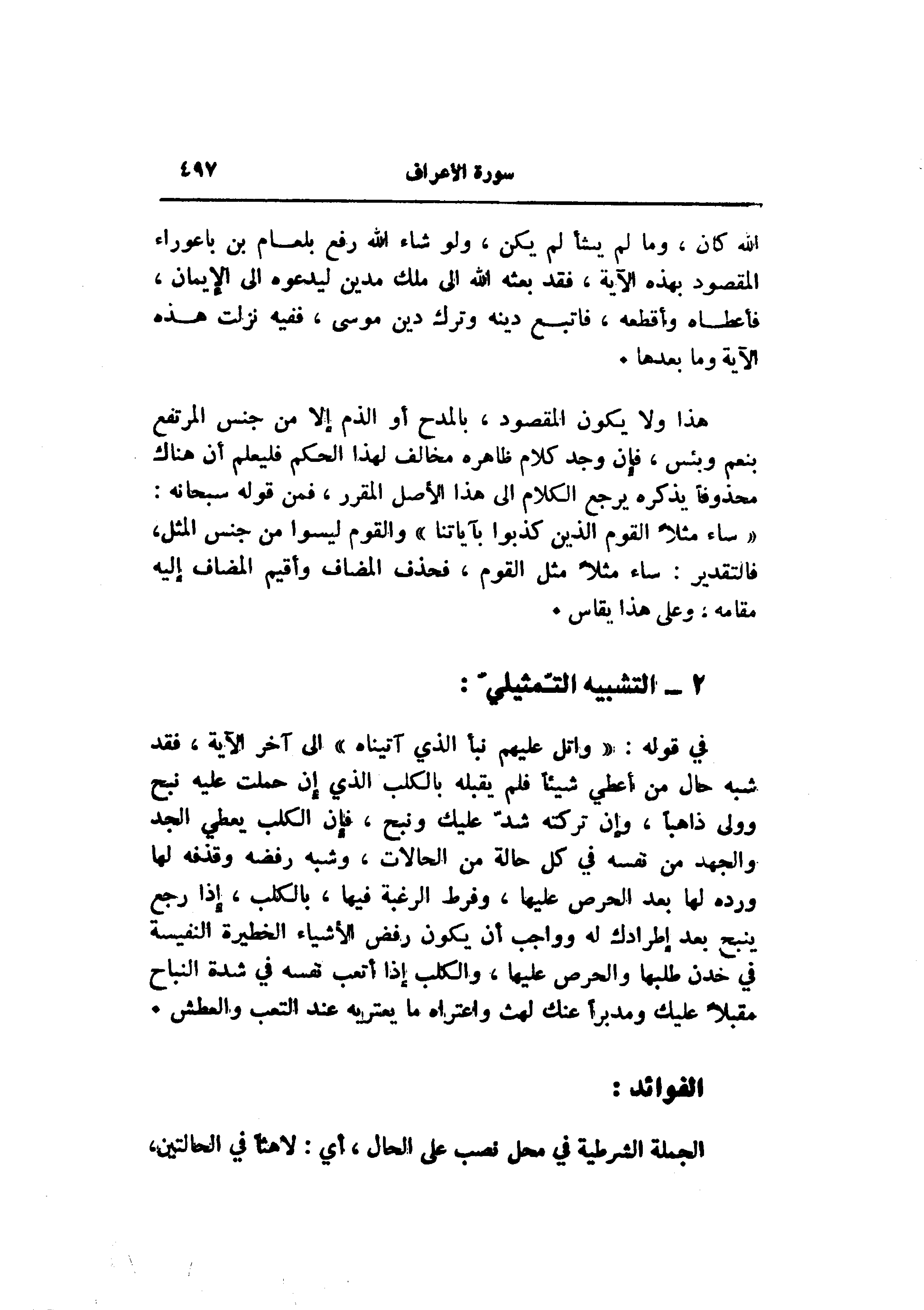 في قوله: «واتل عليهم نبأ الذي آتيناه» الى آخر الآية، فقد شبه حال من أعطي شيئا فلم يقبله بالكلب الذي إن حملت عليه نبح وولى ذاهبا، وإن تركته شدّ عليك ونبح، فإن الكلب يعطي الجد والجهد من نفسه في كل حالة من الحالات، وشبه رفضه وقذفه لها ورده لها بعد الحرص عليها، وفرط الرغبة فيها، بالكلب، إذا رجع ينبح بعد اطرادك له وواجب أن يكون رفض الأشياء الخطيرة النفيسة في خدن طلبها والحرص عليها، والكلب إذا أتعب نفسه في شدة النباح مقبلا عليك ومدبرا عنك لهث واعتراه ما يعتريه عند التعب والعطش.