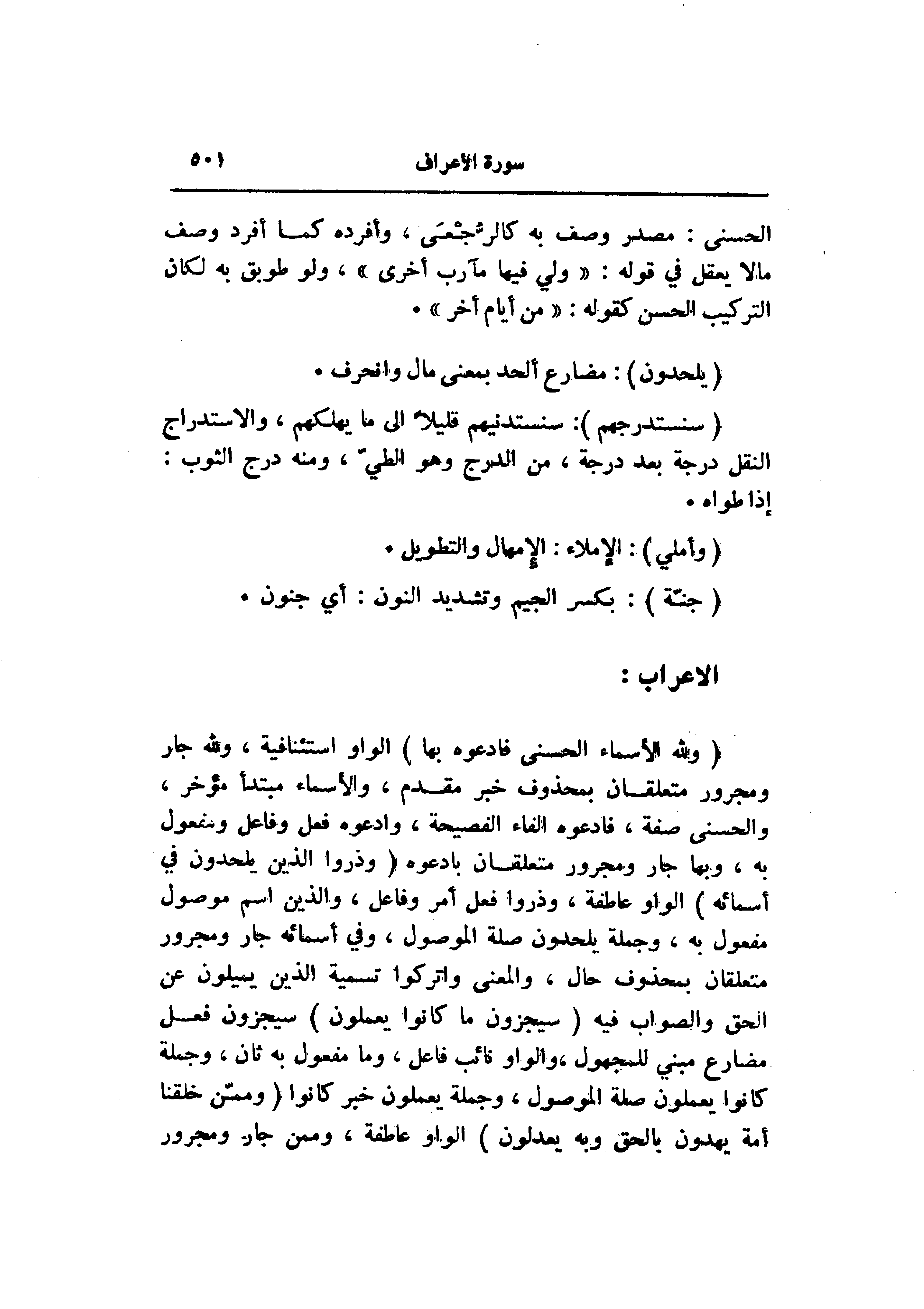 (وَلِلَّهِ الْأَسْماءُ الْحُسْنى فَادْعُوهُ بِها) الواو استئنافية، ولله جار ومجرور متعلقان بمحذوف خبر مقدم، والأسماء مبتدأ مؤخر، والحسنى صفة، فادعوه الفاء الفصيحة، وادعوه فعل وفاعل ومفعول به، وبها جار ومجرور متعلقان بادعوه (وَذَرُوا الَّذِينَ يُلْحِدُونَ فِي أَسْمائِهِ) الواو عاطفة، وذروا فعل أمر وفاعل، والذين اسم موصول مفعول به، وجملة يلحدون صلة الموصول، وفي أسمائه جار ومجرور متعلقان بمحذوف حال، والمعنى واتركوا تسمية الذين يميلون عن الحق والصواب فيه (سَيُجْزَوْنَ ما كانُوا يَعْمَلُونَ) سيجزون فعل مضارع مبني للمجهول، والواو نائب فاعل، وما مفعول به ثان، وجملة كانوا يعملون صلة الموصول، وجملة يعملون خبر كانوا (وَمِمَّنْ خَلَقْنا أُمَّةٌ يَهْدُونَ بِالْحَقِّ وَبِهِ يَعْدِلُونَ) الواو عاطفة، وممن جار ومجرور