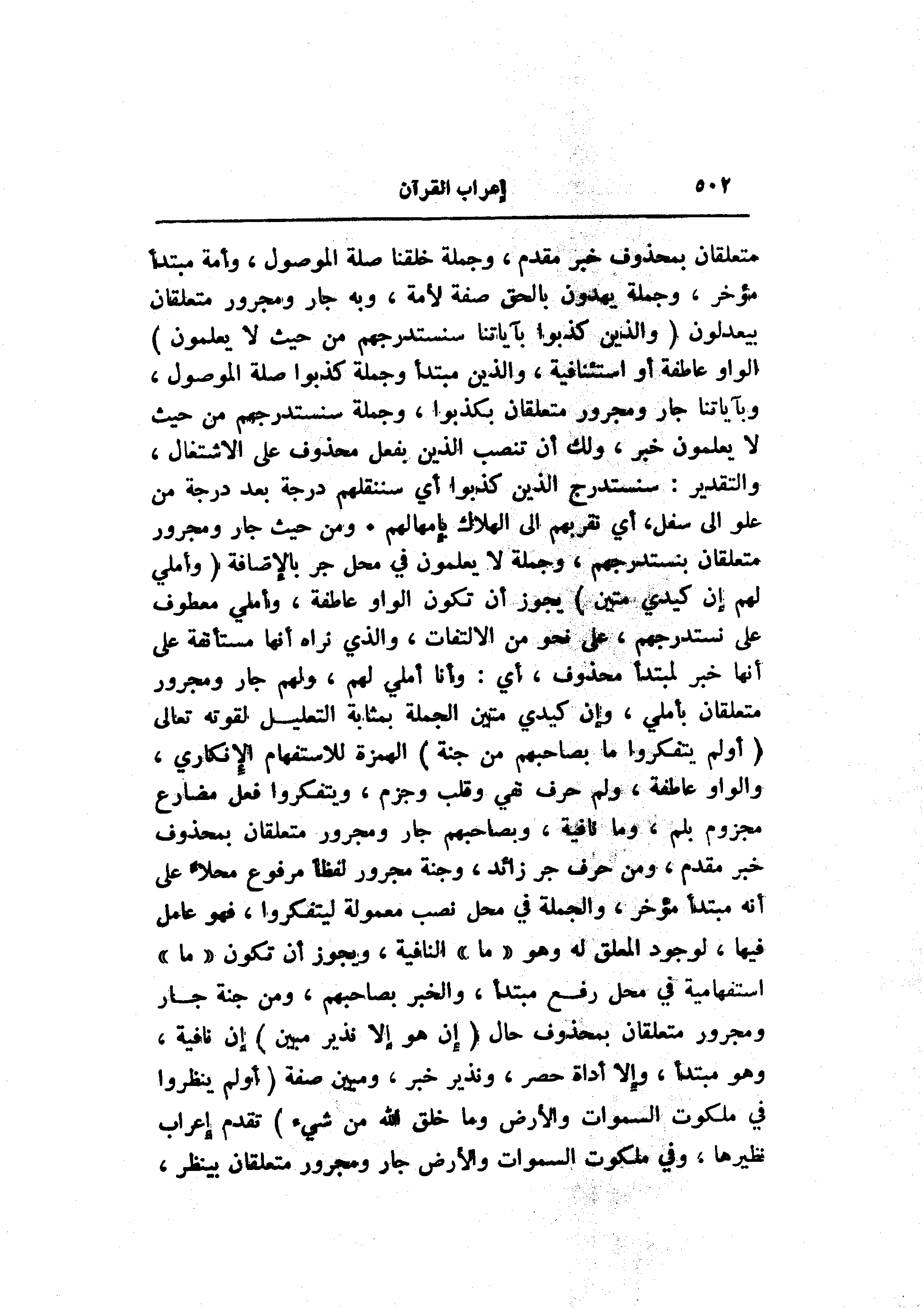 متعلقان بمحذوف خبر مقدم، وجملة خلقنا صلة الموصول، وأمة مبتدأ مؤخر، وجملة يهدون بالحق صفة لأمة، وبه جار ومجرور متعلقان بيعدلون (وَالَّذِينَ كَذَّبُوا بِآياتِنا سَنَسْتَدْرِجُهُمْ مِنْ حَيْثُ لا يَعْلَمُونَ) الواو عاطفة أو استئنافية، والذين مبتدأ وجملة كذبوا صلة الموصول، وبآياتنا جار ومجرور متعلقان بكذبوا، وجملة سنستدرجهم من حيث لا يعلمون خبر، ولك أن تنصب الذين بفعل محذوف على الاشتغال، والتقدير: سنستدرج الذين كذبوا أي سننقلهم درجة بعد درجة من علو الى سفل، أي نقربهم الى الهلاك بإمهالهم. ومن حيث جار ومجرور متعلقان بنستدرجهم، وجملة لا يعلمون في محل جر بالإضافة (وَأُمْلِي لَهُمْ إِنَّ كَيْدِي مَتِينٌ) يجوز أن تكون الواو عاطفة، وأملي معطوف على نستدرجهم، على نحو من الالتفات، والذي نراه أنها مستأنفة على أنها خبر لمبتدأ محذوف، أي: وأنا أملي لهم، ولهم جار ومجرور متعلقان بأملي، وإن كيدي متين الجملة بمثابة التعليل لقوته تعالى (أَوَلَمْ يَتَفَكَّرُوا ما بِصاحِبِهِمْ مِنْ جِنَّةٍ) الهمزة للاستفهام الإنكاري، والواو عاطفة، ولم حرف نفي وقلب وجزم، ويتفكروا فعل مضارع مجزوم بلم، وما نافية، وبصاحبهم جار ومجرور متعلقان بمحذوف خبر مقدم، ومن حرف جر زائد، وجنة مجرور لفظا مرفوع محلّا على أنه مبتدأ مؤخر، والجملة في محل نصب معمولة ليتفكروا، فهو عامل فيها، لوجود المعلق له وهو «ما» النافية، ويجوز أن تكون «ما» استفهامية في محل رفع مبتدأ، والخبر بصاحبهم، ومن جنة جار ومجرور متعلقان بمحذوف حال (إِنْ هُوَ إِلَّا نَذِيرٌ مُبِينٌ) إن نافية، وهو مبتدأ، وإلا أداة حصر، ونذير خبر، ومبين صفة (أَوَلَمْ يَنْظُرُوا فِي مَلَكُوتِ السَّماواتِ وَالْأَرْضِ وَما خَلَقَ اللَّهُ مِنْ شَيْءٍ) تقدم إعراب نظيرها، وفي ملكوت السموات والأرض جار ومجرور متعلقان بينظر،