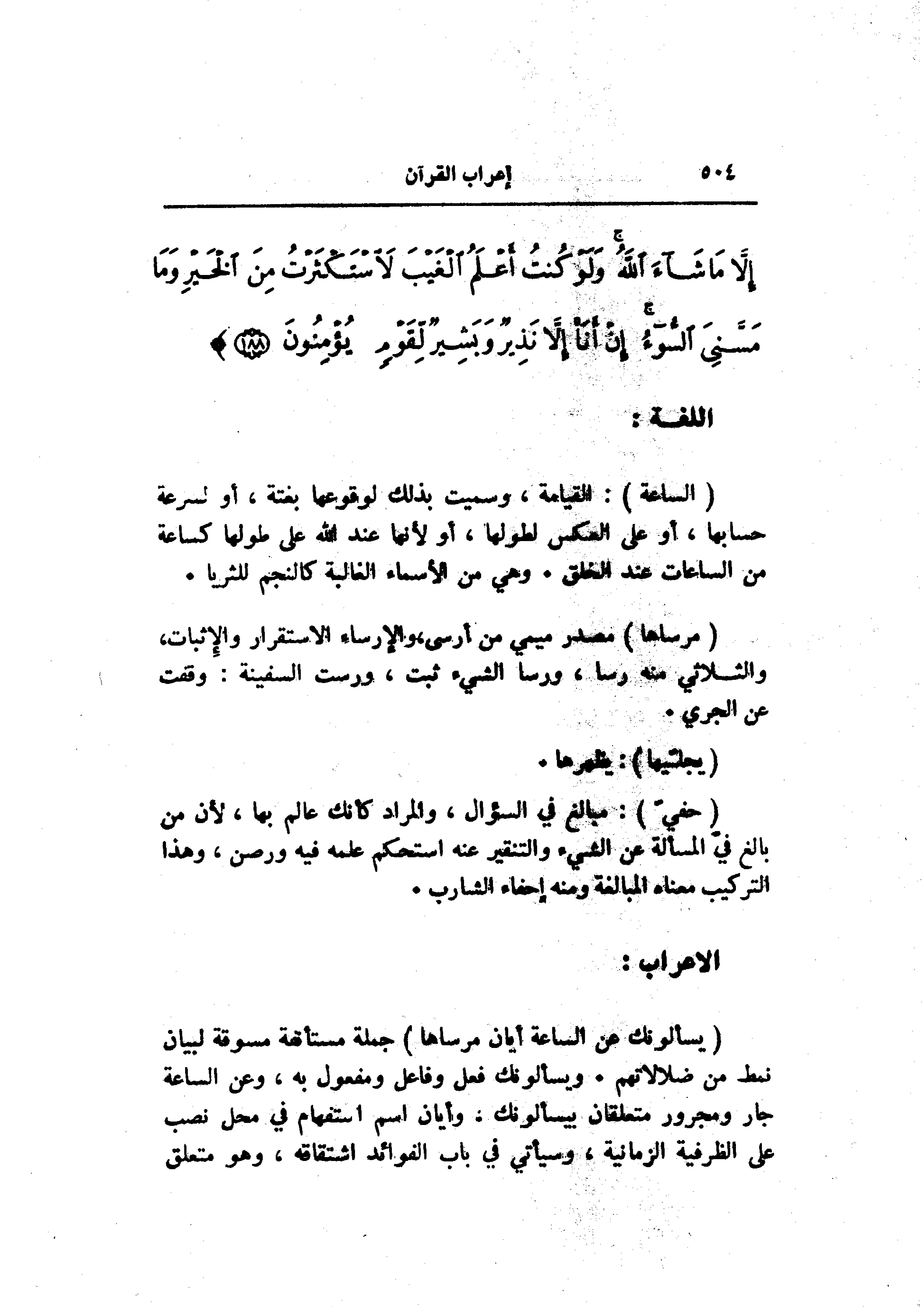 (يَسْئَلُونَكَ عَنِ السَّاعَةِ أَيَّانَ مُرْساها) جملة مستأنفة مسوقة لبيان نمط من ضلالاتهم. ويسألونك فعل وفاعل ومفعول به، وعن الساعة جار ومجرور متعلقان بيسألونك، وأيان اسم استفهام في محل نصب على الظرفية الزمانية، وسيأتي في باب الفوائد اشتقاقه، وهو متعلق