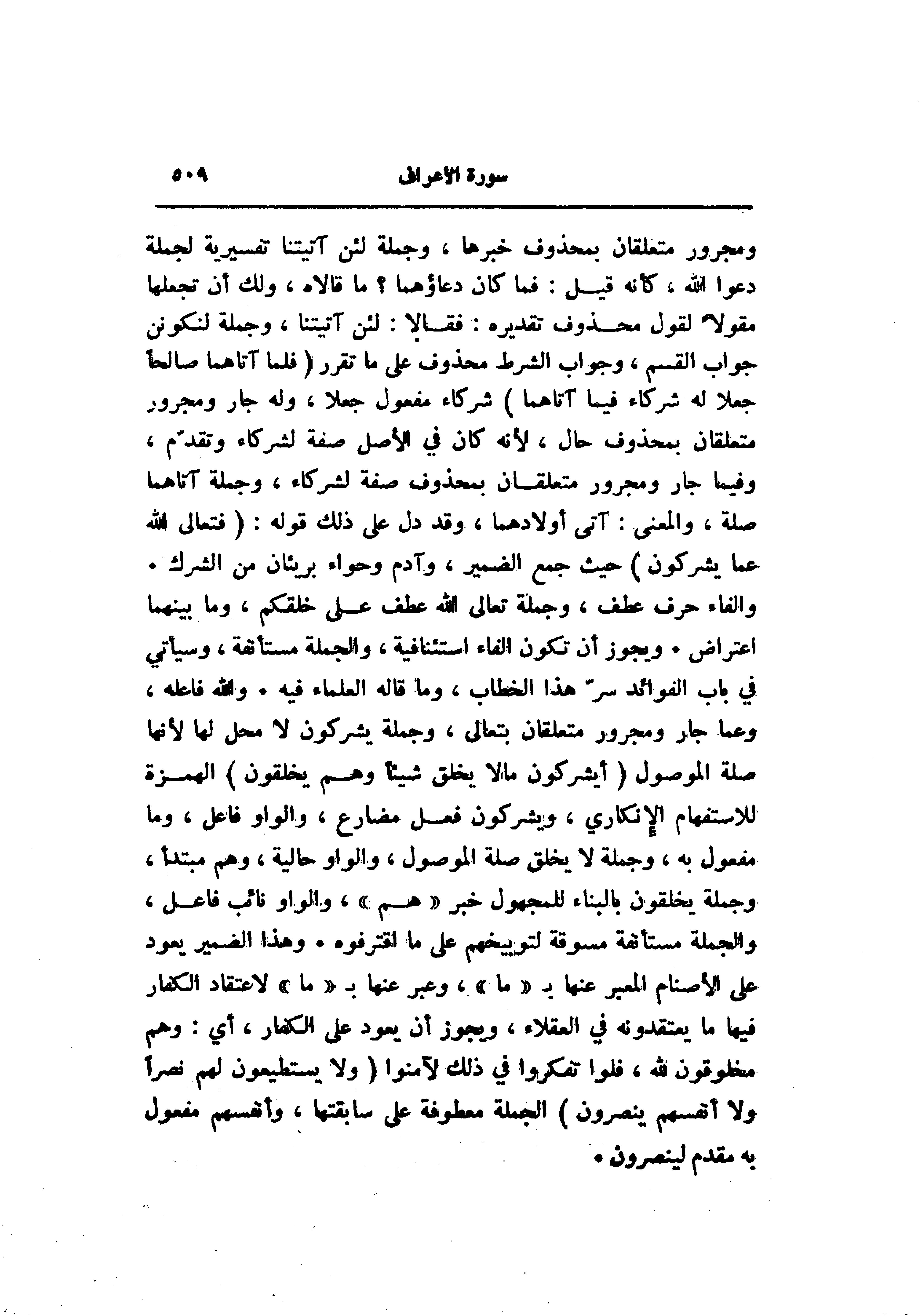 ومجرور متعلقان بمحذوف خبرها، وجملة لئن آتيتنا تفسيرية لجملة دعوا الله، كأنه قيل: فما كان دعاؤهما؟ ما قالاه، ولك أن تجعلها مقولا لقول محذوف تقديره: فقالا: لئن آتيتنا، وجملة لنكونن جواب القسم، وجواب الشرط محذوف على ما تقرر (فَلَمَّا آتاهُما صالِحاً جَعَلا لَهُ شُرَكاءَ فِيما آتاهُما) شركاء مفعول جعلا، وله جار ومجرور متعلقان بمحذوف حال، لأنه كان في الأصل صفة لشركاء وتقدّم، وفيما جار ومجرور متعلقان بمحذوف صفة لشركاء، وجملة آتاهما صلة، والمعنى: آتى أولادهما، وقد دل على ذلك قوله: (فَتَعالَى اللَّهُ عَمَّا يُشْرِكُونَ) حيث جمع الضمير، وآدم وحواء بريئان من الشرك.