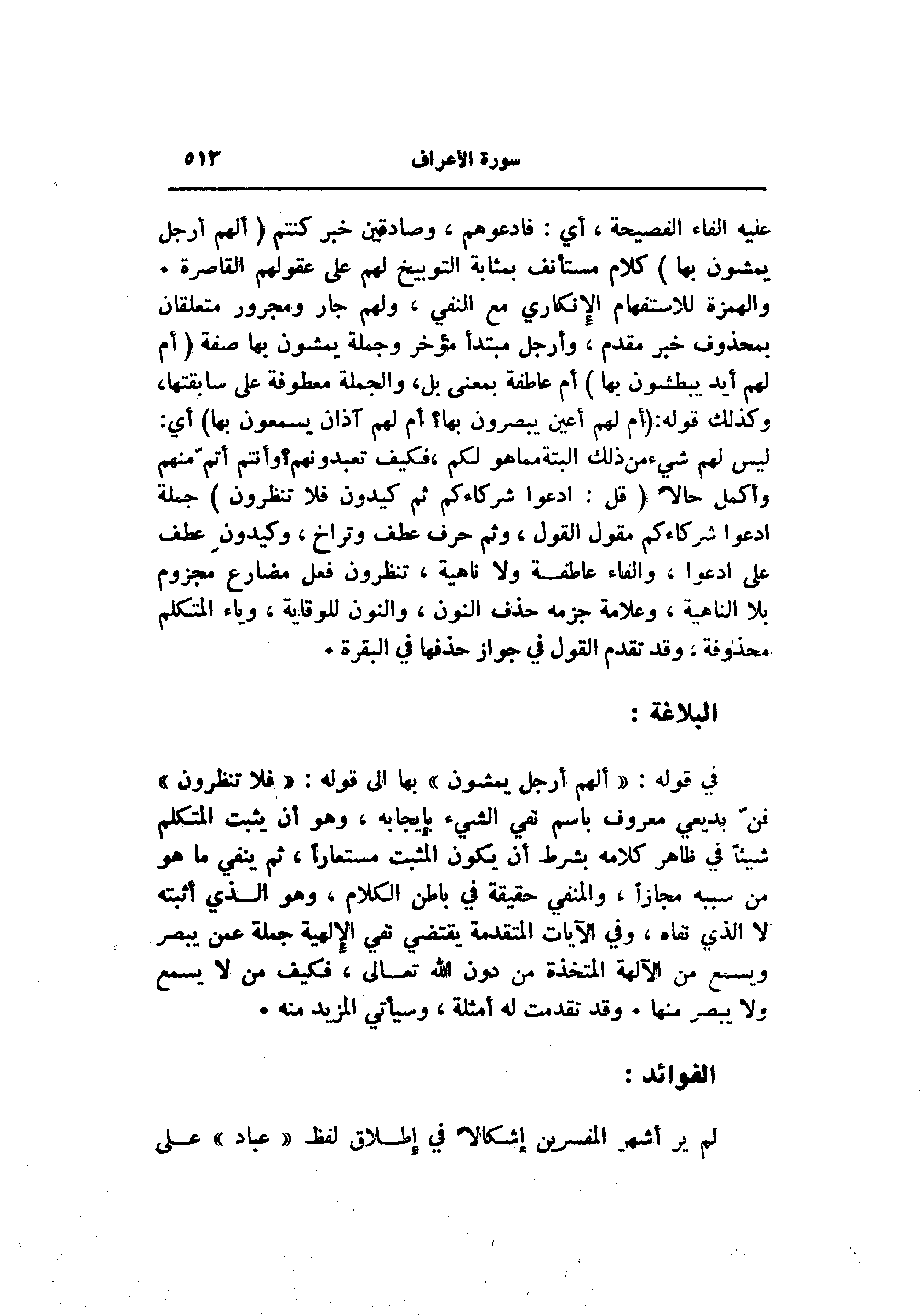 في قوله: «ألهم أرجل يمشون» بها الى قوله: «فلا تنظرون» فنّ بديعي معروف باسم نفي الشيء بإيجابه، وهو أن يثبت المتكلم شيئا في ظاهر كلامه بشرط أن يكون المثبت مستعارا، ثم ينفي ما هو من سببه مجازا، والمنفي حقيقة في باطن الكلام، وهو الذي أثبته لا الذي نفاه، وفي الآيات المتقدمة يقتضي نفي الإلهية جملة عمن يبصر ويسمع من الآلهة المتخذة من دون الله تعالى، فكيف من لا يسمع ولا يبصر منها. وقد تقدمت له أمثلة، وسيأتي المزيد منه.