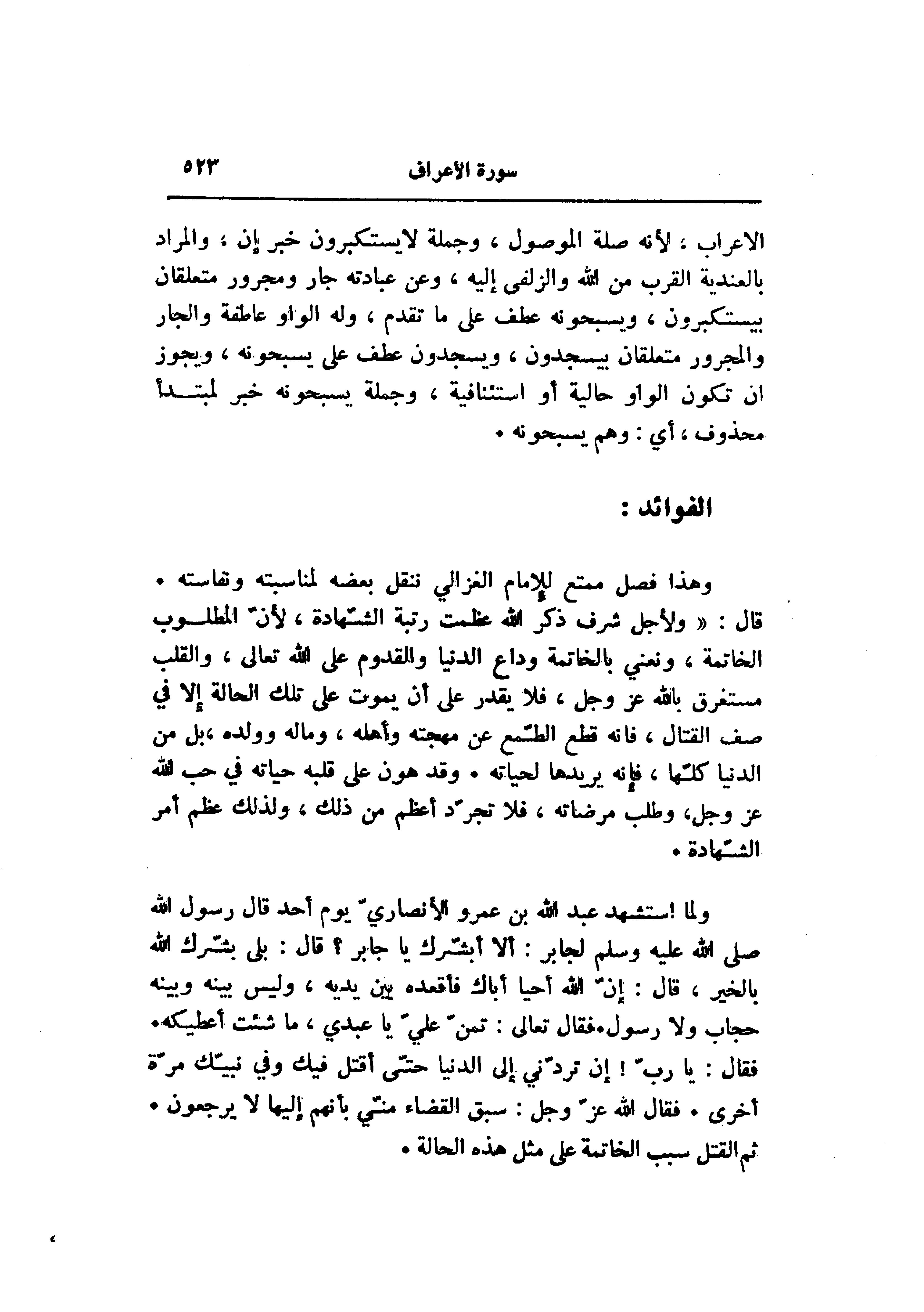ولما استشهد عبد الله بن عمرو الأنصاريّ يوم أحد قال رسول الله صلى الله عليه وسلم لجابر: ألا أبشّرك يا جابر؟ قال: بلى بشّرك الله بالخير، قال: إنّ الله أحيا أباك فأقعده بين يديه، وليس بينه وبينه حجاب ولا رسول. فقال تعالى: تمنّ عليّ يا عبدي، ما شئت أعطيكه.