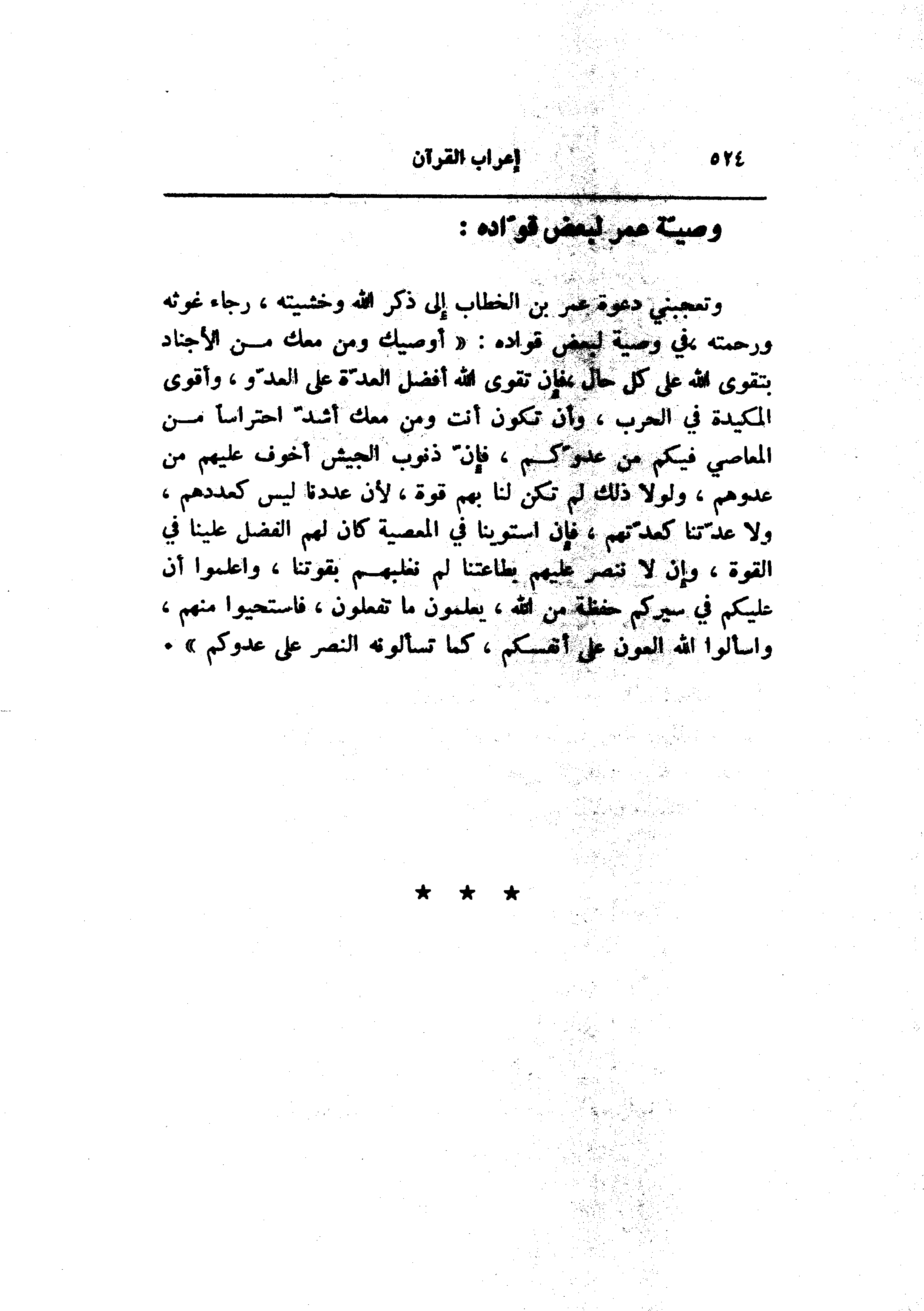 وتعجبني دعوة عمر بن الخطاب إلى ذكر الله وخشيته، رجاء غوثه ورحمته، في وصية لبعض قواده: «أوصيك ومن معك من الأجناد بتقوى الله على كل حال، فإن تقوى الله أفضل العدّة على العدو، وأقوى المكيدة في الحرب، وأن تكون أنت ومن معك أشدّ احتراسا من المعاصي فيكم من عدوّكم، فإنّ ذنوب الجيش أخوف عليهم من عدوهم، ولولا ذلك لم تكن لنا بهم قوة، لأن عددنا ليس كعددهم، ولا عدّتنا كعدّتهم، فإن استوينا في المعصية كان لهم الفضل علينا في القوة، وإن لا ننصر عليهم بطاعتنا لم نغلبهم بقوتنا، واعلموا أن عليكم في سيركم حفظة من الله، يعلمون ما تفعلون، فاستحيوا منهم، واسألوا الله العون على أنفسكم، كما تسألونه النصر على عدوكم» .