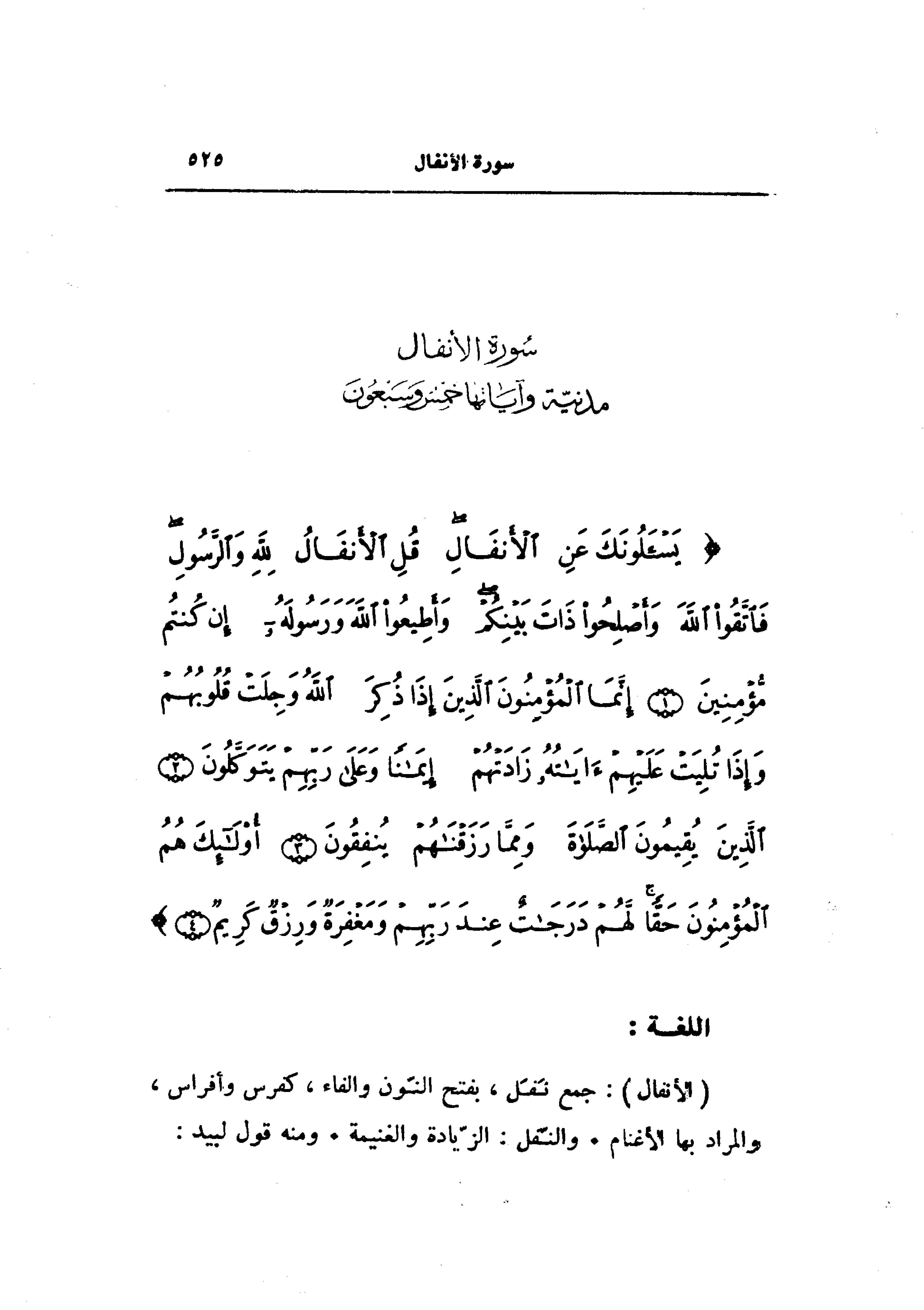 يَسْئَلُونَكَ عَنِ الْأَنْفالِ قُلِ الْأَنْفالُ لِلَّهِ وَالرَّسُولِ فَاتَّقُوا اللَّهَ وَأَصْلِحُوا ذاتَ بَيْنِكُمْ وَأَطِيعُوا اللَّهَ وَرَسُولَهُ إِنْ كُنْتُمْ مُؤْمِنِينَ (1) إِنَّمَا الْمُؤْمِنُونَ الَّذِينَ إِذا ذُكِرَ اللَّهُ وَجِلَتْ قُلُوبُهُمْ وَإِذا تُلِيَتْ عَلَيْهِمْ آياتُهُ زادَتْهُمْ إِيماناً وَعَلى رَبِّهِمْ يَتَوَكَّلُونَ (2) الَّذِينَ يُقِيمُونَ الصَّلاةَ وَمِمَّا رَزَقْناهُمْ يُنْفِقُونَ (3) أُولئِكَ هُمُ الْمُؤْمِنُونَ حَقًّا لَهُمْ دَرَجاتٌ عِنْدَ رَبِّهِمْ وَمَغْفِرَةٌ وَرِزْقٌ كَرِيمٌ (4)