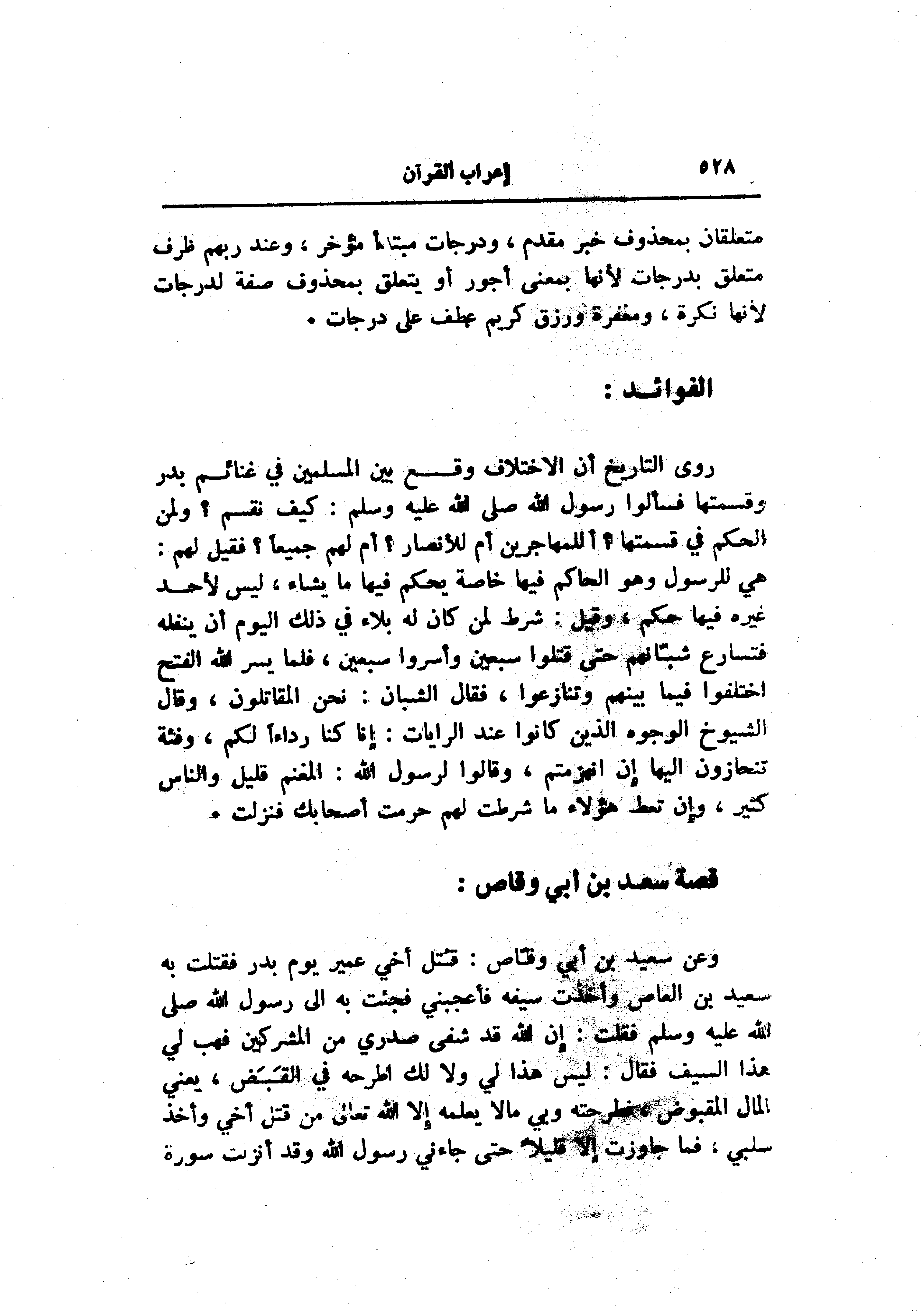 وعن سعيد بن أبي وقّاص: قتل أخي عمير يوم بدر فقتلت به سعيد بن العاص وأخذت سيفه فأعجبني فجئت به الى رسول الله صلى الله عليه وسلم فقلت: إن الله قد شفى صدري من المشركين فهب لي هذا السيف فقال: ليس هذا لي ولا لك اطرحه في القبض، يعني المال المقبوض، فطرحته وبي مالا يعلمه إلا الله تعالى من قتل أخي وأخذ سلبي، فما جاوزت إلا قليلا حتى جاءني رسول الله وقد أنزلت سورة