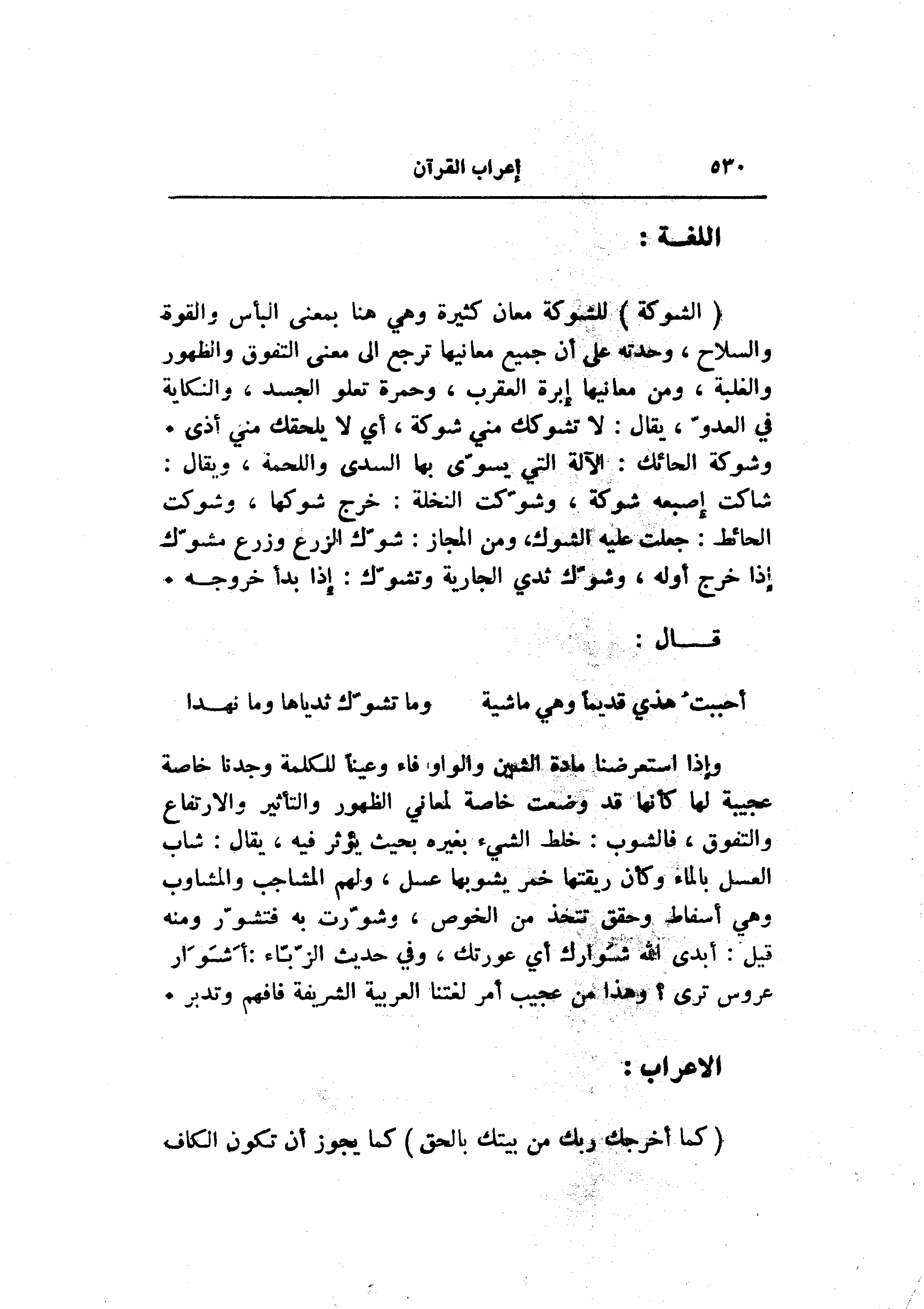 (الشَّوْكَةِ) للشوكة معان كثيرة وهي هنا بمعنى البأس والقوة والسلاح، وحدته على أن جميع معانيها ترجع الى معنى التفوق والظهور والغلبة، ومن معانيها إبرة العقرب، وحمرة تعلو الجسد، والنكاية في العدوّ، يقال: لا تشوكك مني شوكة، أي لا يلحقك مني أذى.