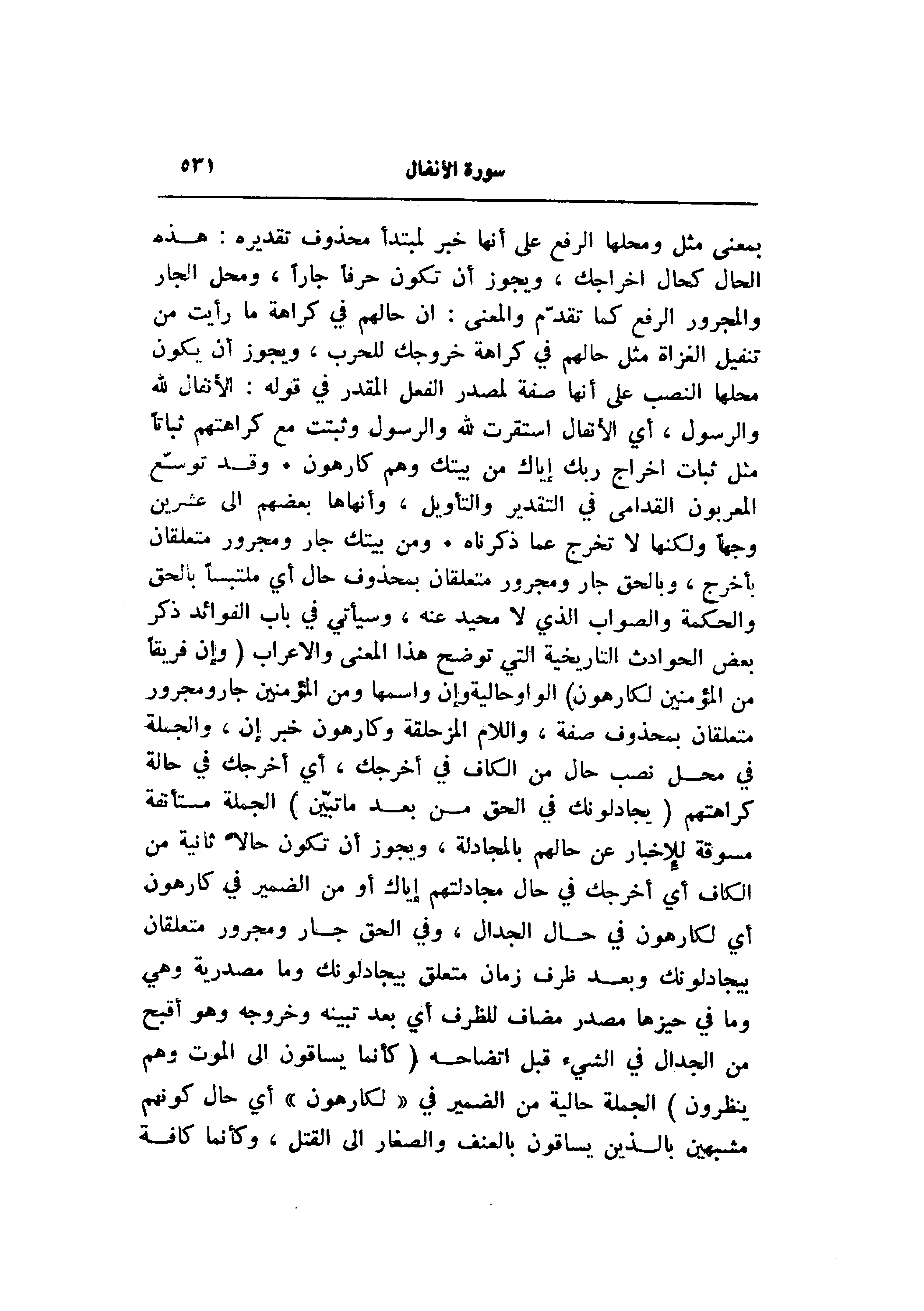 بمعنى مثل ومحلها الرفع على أنها خبر لمبتدأ محذوف تقديره: هذه الحال كحال اخراجك، ويجوز أن تكون حرفا جارا، ومحل الجار والمجرور الرفع كما تقدّم والمعنى: ان حالهم في كراهة ما رأيت من تنفيل الغزاة مثل حالهم في كراهة خروجك للحرب، ويجوز أن يكون محلها النصب على أنها صفة لمصدر الفعل المقدر في قوله: الأنفال لله والرسول، أي الأنفال استقرت لله والرسول وثبتت مع كراهتهم ثباتا مثل ثبات إخراج ربك إياك من بيتك وهم كارهون. وقد توسّع المعربون القدامى في التقدير والتأويل، وأنهاها بعضهم الى عشرين وجها ولكنها لا تخرج عما ذكرناه. ومن بيتك جار ومجرور متعلقان بأخرج، وبالحق جار ومجرور متعلقان بمحذوف حال أي ملتبسا بالحق والحكمة والصواب الذي لا محيد عنه، وسيأتي في باب الفوائد ذكر بعض الحوادث التاريخية التي توضح هذا المعنى والإعراب (وَإِنَّ فَرِيقاً مِنَ الْمُؤْمِنِينَ لَكارِهُونَ) الواو حالية وإن واسمها ومن المؤمنين جار ومجرور متعلقان بمحذوف صفة، واللام المزحلقة وكارهون خبر إن، والجملة في محل نصب حال من الكاف في أخرجك، أي أخرجك في حالة كراهتهم (يُجادِلُونَكَ فِي الْحَقِّ بَعْدَ ما تَبَيَّنَ) الجملة مستأنفة مسوقة للإخبار عن حالهم بالمجادلة، ويجوز أن تكون حالا ثانية من الكاف أي أخرجك في حال مجادلتهم إياك أو من الضمير في كارهون أي لكارهون في حال الجدال، وفي الحق جار ومجرور متعلقان بيجادلونك وبعد ظرف زمان متعلق بيجادلونك وما مصدرية وهي وما في حيزها مصدر مضاف للظرف أي بعد تبينه وخروجه وهو أقبح من الجدال في الشيء قبل اتضاحه (كَأَنَّما يُساقُونَ إِلَى الْمَوْتِ وَهُمْ يَنْظُرُونَ) الجملة حالية من الضمير في «لكارهون» أي حال كونهم مشبهين بالذين يساقون بالعنف والصغار الى القتل، وكأنما كافة