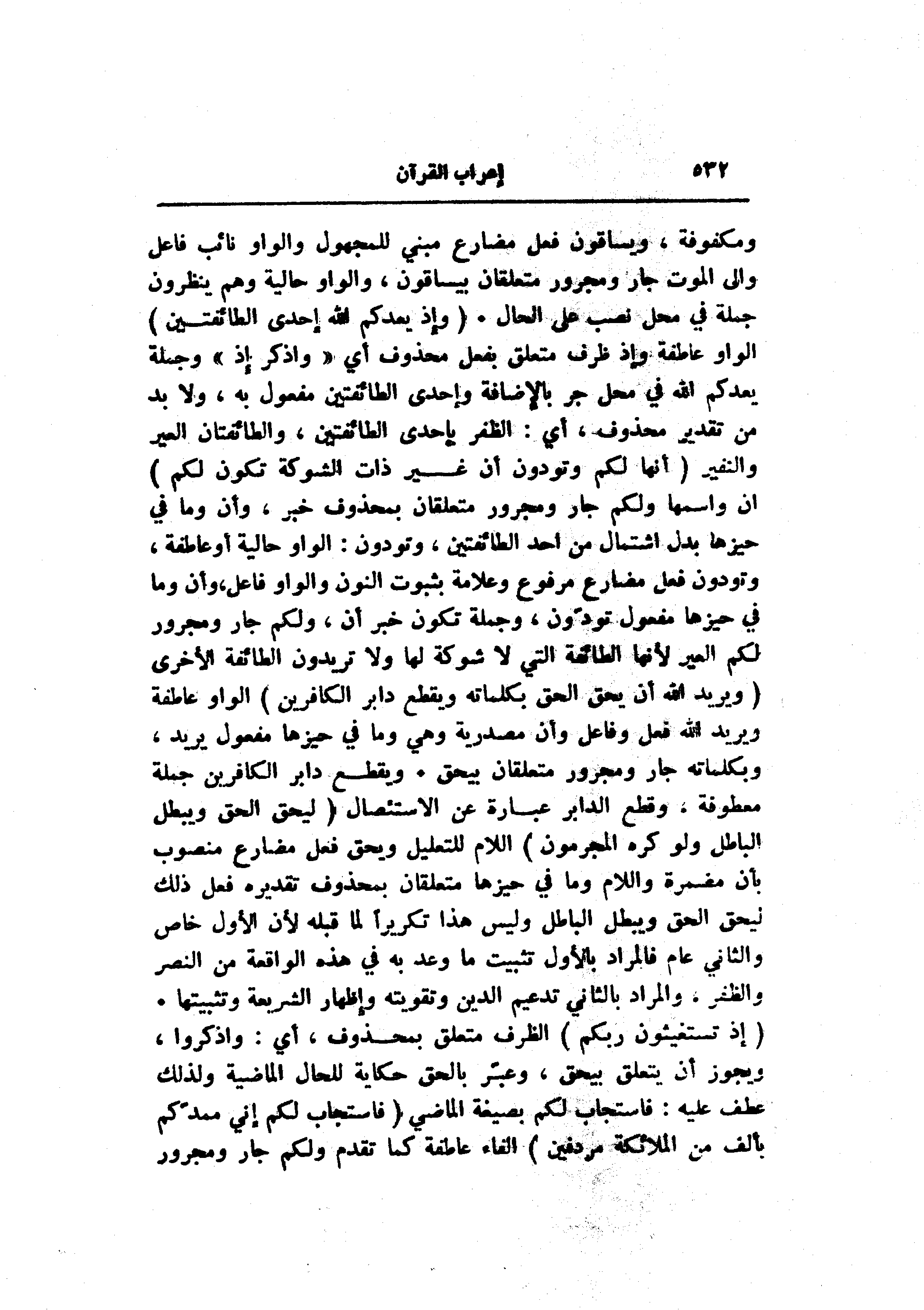 ومكفوفة، ويساقون فعل مضارع مبني للمجهول والواو نائب فاعل والى الموت جار ومجرور متعلقان بيساقون، والواو حالية وهم ينظرون جملة في محل نصب على الحال. (وَإِذْ يَعِدُكُمُ اللَّهُ إِحْدَى الطَّائِفَتَيْنِ) الواو عاطفة وإذ ظرف متعلق بفعل محذوف أي «واذكر إذ» وجملة يعدكم الله في محل جر بالإضافة وإحدى الطائفتين مفعول به، ولا بد من تقدير محذوف، أي: الظفر بإحدى الطائفتين، والطائفتان العير والنفير (أَنَّها لَكُمْ وَتَوَدُّونَ أَنَّ غَيْرَ ذاتِ الشَّوْكَةِ تَكُونُ لَكُمْ) ان واسمها ولكم جار ومجرور متعلقان بمحذوف خبر، وأن وما في حيزها بدل اشتمال من أحد الطائفتين، وتودون: الواو حالية أو عاطفة، وتودون فعل مضارع مرفوع وعلامة بثبوت النون والواو فاعل، وأن وما في حيزها مفعول تودّون، وجملة تكون خبر أن، ولكم جار ومجرور لكم العير لأنها الطائفة التي لا شوكة لها ولا تريدون الطائفة الأخرى (وَيُرِيدُ اللَّهُ أَنْ يُحِقَّ الْحَقَّ بِكَلِماتِهِ وَيَقْطَعَ دابِرَ الْكافِرِينَ) الواو عاطفة ويريد الله فعل وفاعل وأن مصدرية وهي وما في حيزها مفعول يريد، وبكلماته جار ومجرور متعلقان بيحق. ويقطع دابر الكافرين جملة معطوفة، وقطع الدابر عبارة عن الاستئصال (لِيُحِقَّ الْحَقَّ وَيُبْطِلَ الْباطِلَ وَلَوْ كَرِهَ الْمُجْرِمُونَ) اللام للتعليل ويحق فعل مضارع منصوب بأن مضمرة واللام وما في حيزها متعلقان بمحذوف تقديره فعل ذلك ليحق الحق ويبطل الباطل وليس هذا تكريرا لما قبله لأن الأول خاص والثاني عام فالمراد بالأول تثبيت ما وعد به في هذه الواقعة من النصر والظفر. والمراد بالثاني تدعيم الدين وتقويته وإظهار الشريعة وتثبيتها.
