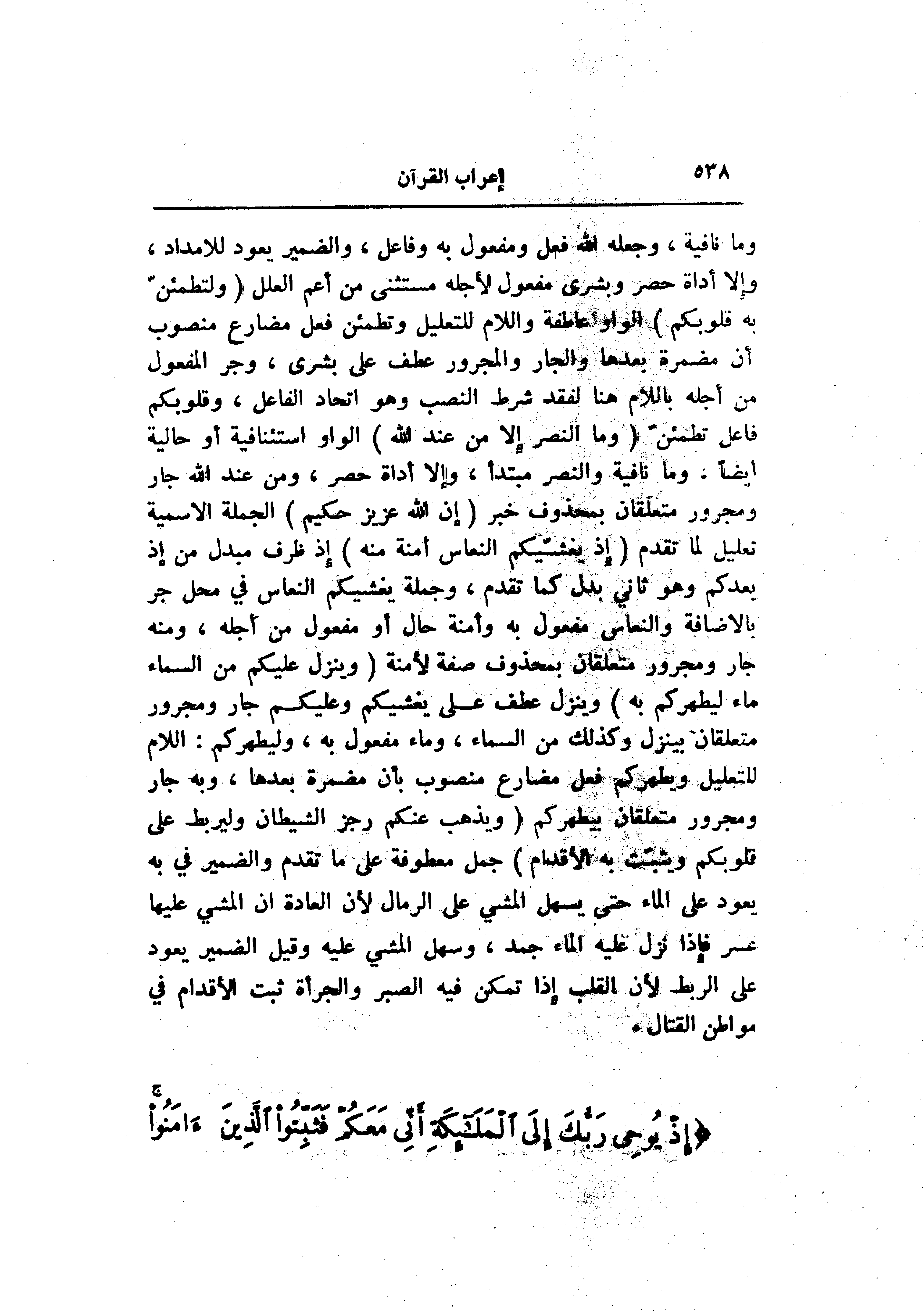 وما نافية، وجعله الله فعل ومفعول به وفاعل، والضمير يعود للامداد، وإلا أداة حصر وبشرى مفعول لأجله مستثنى من أعم العلل (وَلِتَطْمَئِنَّ بِهِ قُلُوبُكُمْ) الواو عاطفة واللام للتعليل وتطمئن فعل مضارع منصوب أن مضمرة بعدها والجار والمجرور عطف على بشرى، وجر المفعول من أجله باللام هنا لفقد شرط النصب وهو اتحاد الفاعل، وقلوبكم فاعل تطمئنّ (وَمَا النَّصْرُ إِلَّا مِنْ عِنْدِ اللَّهِ) الواو استئنافية أو حالية أيضا، وما نافية والنصر مبتدأ، وإلا أداة حصر، ومن عند الله جار ومجرور متعلقان بمحذوف خبر (إِنَّ اللَّهَ عَزِيزٌ حَكِيمٌ) الجملة الاسمية تعليل لما تقدم (إِذْ يُغَشِّيكُمُ النُّعاسَ أَمَنَةً مِنْهُ) إذ ظرف مبدل من إذ يعدكم وهو ثاني بدل كما تقدم، وجملة يغشيكم النعاس في محل جر بالاضافة والنعاس مفعول به وأمنة حال أو مفعول من أجله، ومنه جار ومجرور متعلقان بمحذوف صفة لأمنة (وَيُنَزِّلُ عَلَيْكُمْ مِنَ السَّماءِ ماءً لِيُطَهِّرَكُمْ بِهِ) وينزل عطف على يغشيكم وعليكم جار ومجرور متعلقان بينزل وكذلك من السماء، وماء مفعول به، وليطهركم: اللام للتعليل ويطهركم فعل مضارع منصوب بأن مضمرة بعدها، وبه جار ومجرور متعلقان بيطهركم (وَيُذْهِبَ عَنْكُمْ رِجْزَ الشَّيْطانِ وَلِيَرْبِطَ عَلى قُلُوبِكُمْ وَيُثَبِّتَ بِهِ الْأَقْدامَ) جمل معطوفة على ما تقدم والضمير في به يعود على الماء حتى يسهل المشي على الرمال لأن العادة ان المشي عليها عسر فإذا نزل عليه الماء جمد، وسهل المشي عليه وقيل الضمير يعود على الربط لأن القلب إذا تمكن فيه الصبر والجرأة ثبت الأقدام في مواطن القتال.