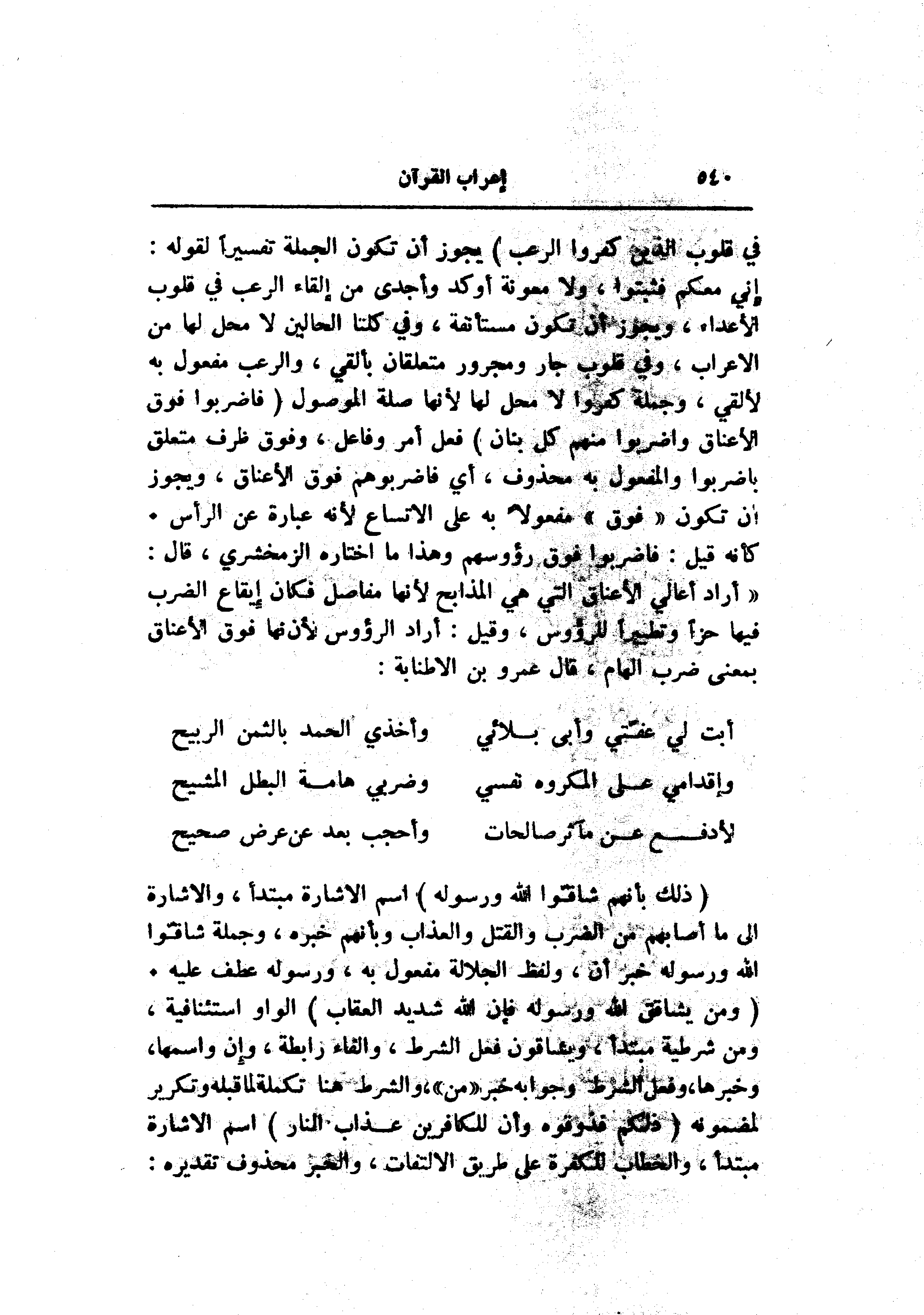 إني معكم فثبتوا، ولا معونة أوكد وأجدى من إلقاء الرعب في قلوب الأعداء، ويجوز أن تكون مستأنفة، وفي كلتا الحالين لا محل لها من الإعراب، وفي قلوب جار ومجرور متعلقان بألقي، والرعب مفعول به لألقي، وجملة كفروا لا محل لها لأنها صلة الموصول (فَاضْرِبُوا فَوْقَ الْأَعْناقِ وَاضْرِبُوا مِنْهُمْ كُلَّ بَنانٍ) فعل أمر وفاعل، وفوق ظرف متعلق باضربوا والمفعول به محذوف، أي فاضربوهم فوق الأعناق، ويجوز أن تكون «فوق» مفعولا به على الاتساع لأنه عبارة عن الرأس.