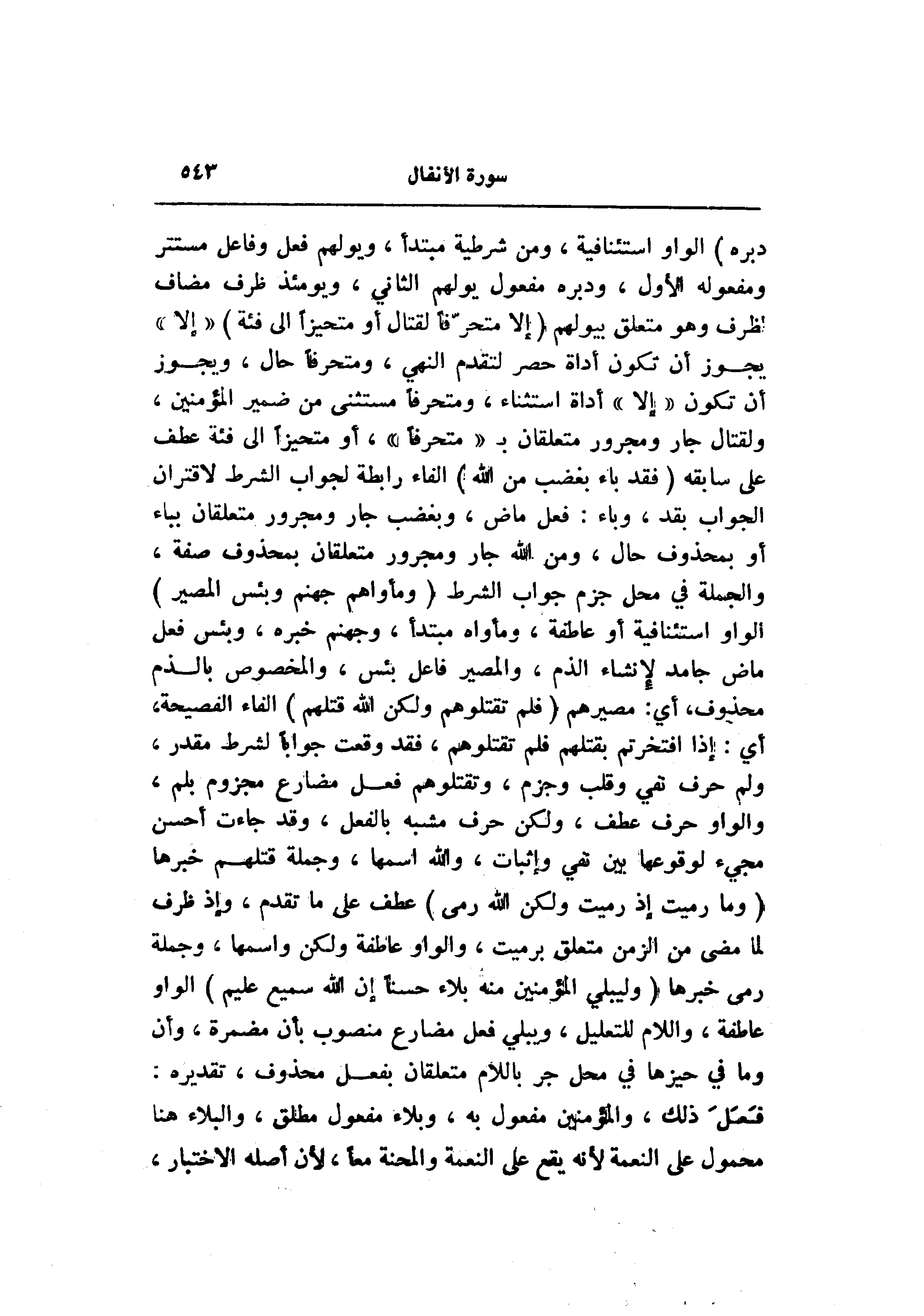 الواو استئنافية، ومن شرطية مبتدأ، ويولهم فعل وفاعل مستتر ومفعوله الأول، ودبره مفعول يولهم الثاني، ويومئذ ظرف مضاف لظرف وهو متعلق بيولهم (إِلَّا مُتَحَرِّفاً لِقِتالٍ أَوْ مُتَحَيِّزاً إِلى فِئَةٍ) «إلا» يجوز أن تكون أداة حصر لتقدم النهي، ومتحرفا حال، ويجوز أن تكون «إلا» أداة استثناء، ومتحرفا مستثنى من ضمير المؤمنين، ولقتال جار ومجرور متعلقان ب «متحرفا» ، أو متحيزا الى فئة عطف على سابقه (فَقَدْ باءَ بِغَضَبٍ مِنَ اللَّهِ) الفاء رابطة لجواب الشرط لاقتران الجواب بقد، وباء: فعل ماض، وبغضب جار ومجرور متعلقان بباء أو بمحذوف حال، ومن الله جار ومجرور متعلقان بمحذوف صفة، والجملة في محل جزم جواب الشرط (وَمَأْواهُ جَهَنَّمُ وَبِئْسَ الْمَصِيرُ) الواو استئنافية أو عاطفة، ومأواه مبتدأ، وجهنم خبره، وبئس فعل ماض جامد لإنشاء الذم، والمصير فاعل بئس، والمخصوص بالذم محذوف، أي: مصيرهم (فَلَمْ تَقْتُلُوهُمْ وَلكِنَّ اللَّهَ قَتَلَهُمْ) الفاء الفصيحة، أي: إذا افتخرتم بقتلهم فلم تقتلوهم، فقد وقعت جوابا لشرط مقدر، ولم حرف نفي وقلب وجزم، وتقتلوهم فعل مضارع مجزوم بلم، والواو حرف عطف، ولكن حرف مشبه بالفعل، وقد جاءت أحسن مجيء لوقوعها بين نفي وإثبات، والله اسمها، وجملة قتلهم خبرها (وَما رَمَيْتَ إِذْ رَمَيْتَ وَلكِنَّ اللَّهَ رَمى) عطف على ما تقدم، وإذ ظرف لما مضى من الزمن متعلق برميت، والواو عاطفة ولكن واسمها، وجملة رمى خبرها (وَلِيُبْلِيَ الْمُؤْمِنِينَ مِنْهُ بَلاءً حَسَناً إِنَّ اللَّهَ سَمِيعٌ عَلِيمٌ) الواو عاطفة، واللام للتعليل، ويبلي فعل مضارع منصوب بأن مضمرة، وأن وما في حيزها في محل جر باللام متعلقان بفعل محذوف، تقديره: