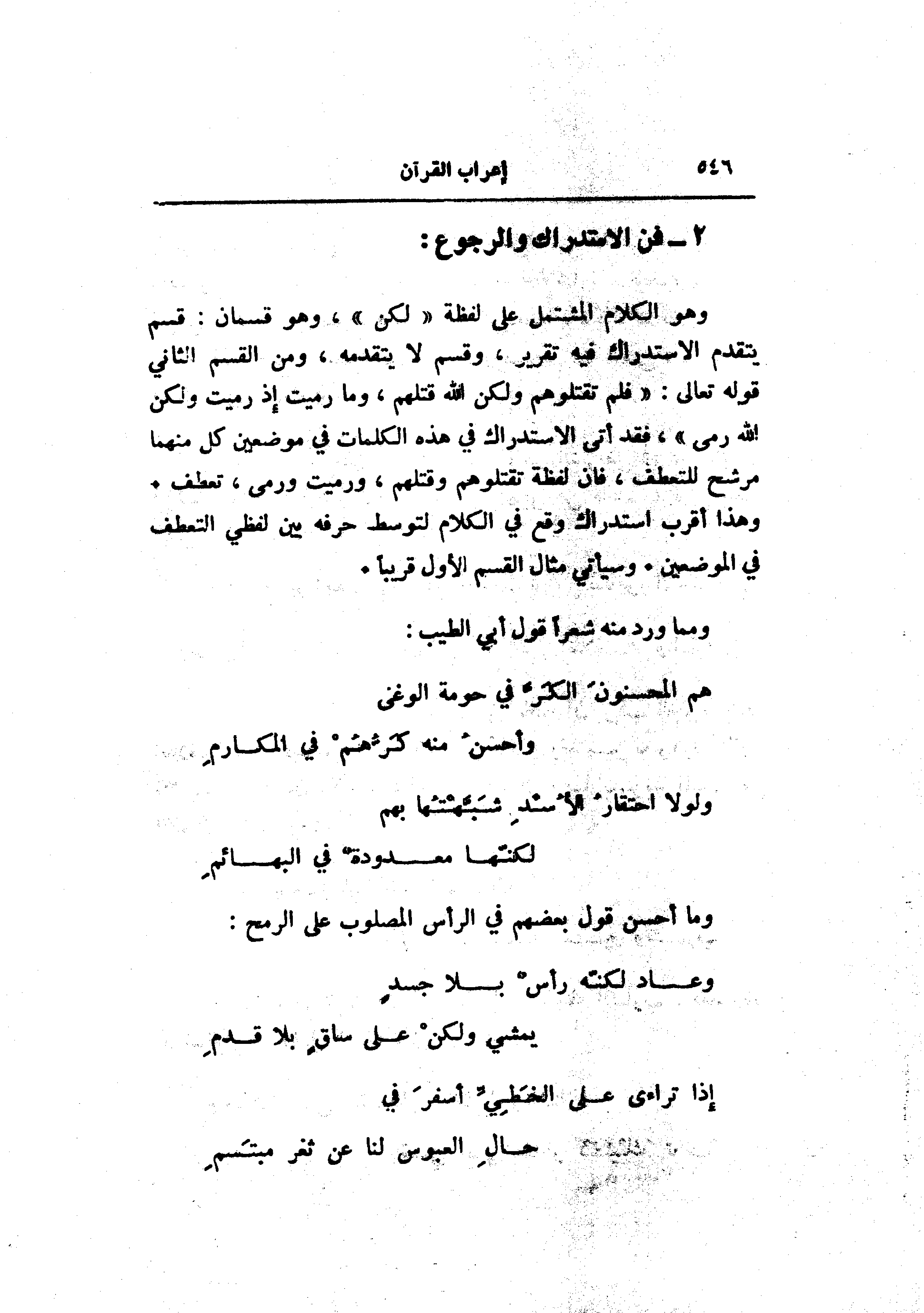 وهو الكلام المشتمل على لفظة «لكن» ، وهو قسمان: قسم يتقدم الاستدراك فيه تقرير، وقسم لا يتقدمه، ومن القسم الثاني قوله تعالى: «فلم تقتلوهم ولكن الله قتلهم، وما رميت إذ رميت ولكن الله رمى» ، فقد أتى الاستدراك في هذه الكلمات في موضعين كل منهما مرشح للتعطف، فان لفظة تقتلوهم وقتلهم، ورميت ورمى، تعطف.