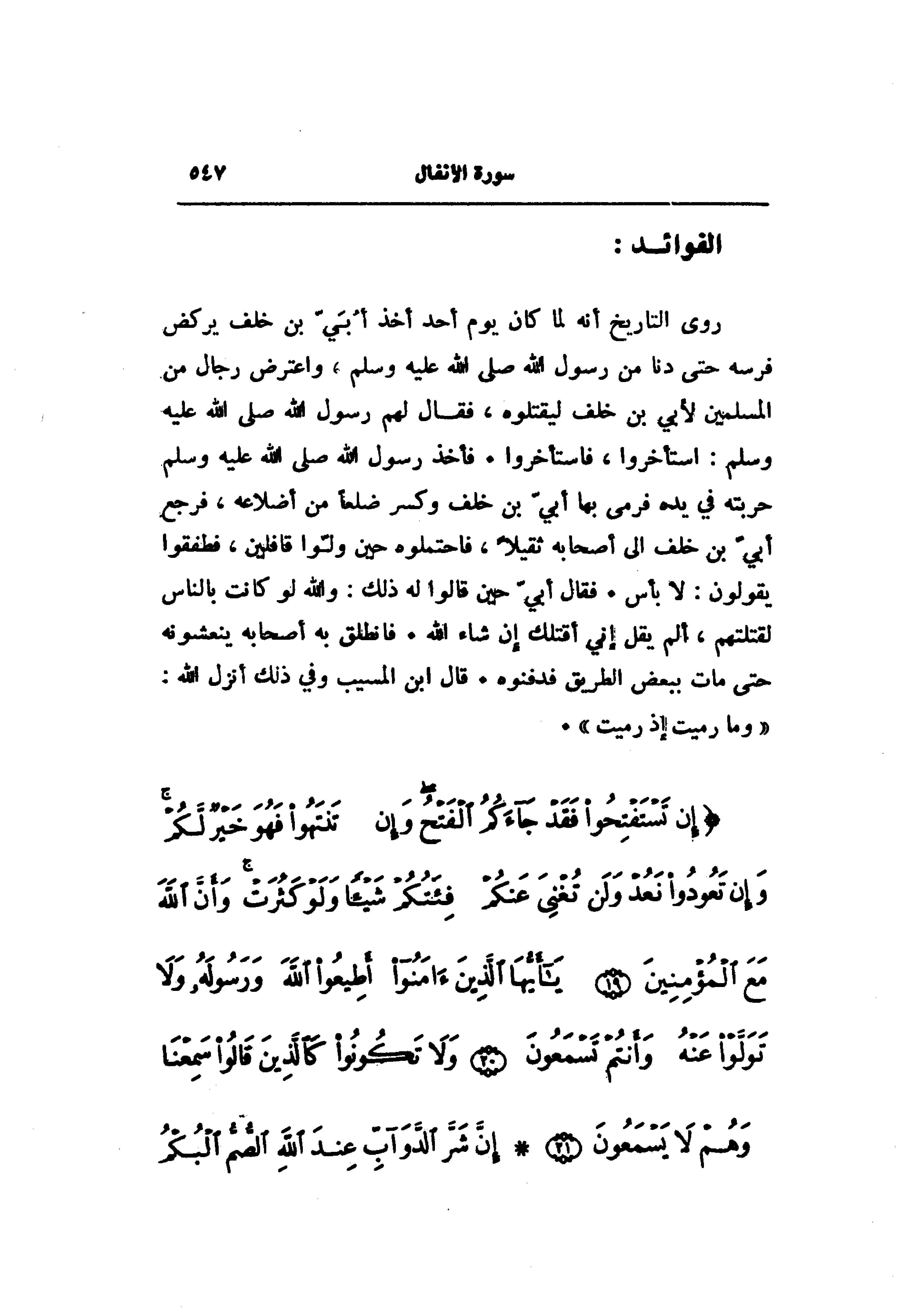 روى التاريخ أنه لما كان يوم أحد أخذ أبيّ بن خلف يركض فرسه حتى دنا من رسول الله صلى الله عليه وسلم، واعترض رجال من المسلمين لأبي بن خلف ليقتلوه، فقال لهم رسول الله صلى الله عليه وسلم: استأخروا، فاستأخروا. فأخذ رسول الله صلى الله عليه وسلم حربته في يده فرمى بها أبيّ بن خلف وكسر ضلعا من أضلاعه، فرجع أبيّ بن خلف الى أصحابه ثقيلا، فاحتملوه حين ولّوا قافلين، فطفقوا يقولون: لا بأس. فقال أبيّ حين قالوا له ذلك: والله لو كانت بالناس لقتلتهم، ألم يقل إني أقتلك إن شاء الله. فانطلق به أصحابه ينعشونه حتى مات ببعض الطريق فدفنوه. قال ابن المسيب وفي ذلك أنزل الله:
