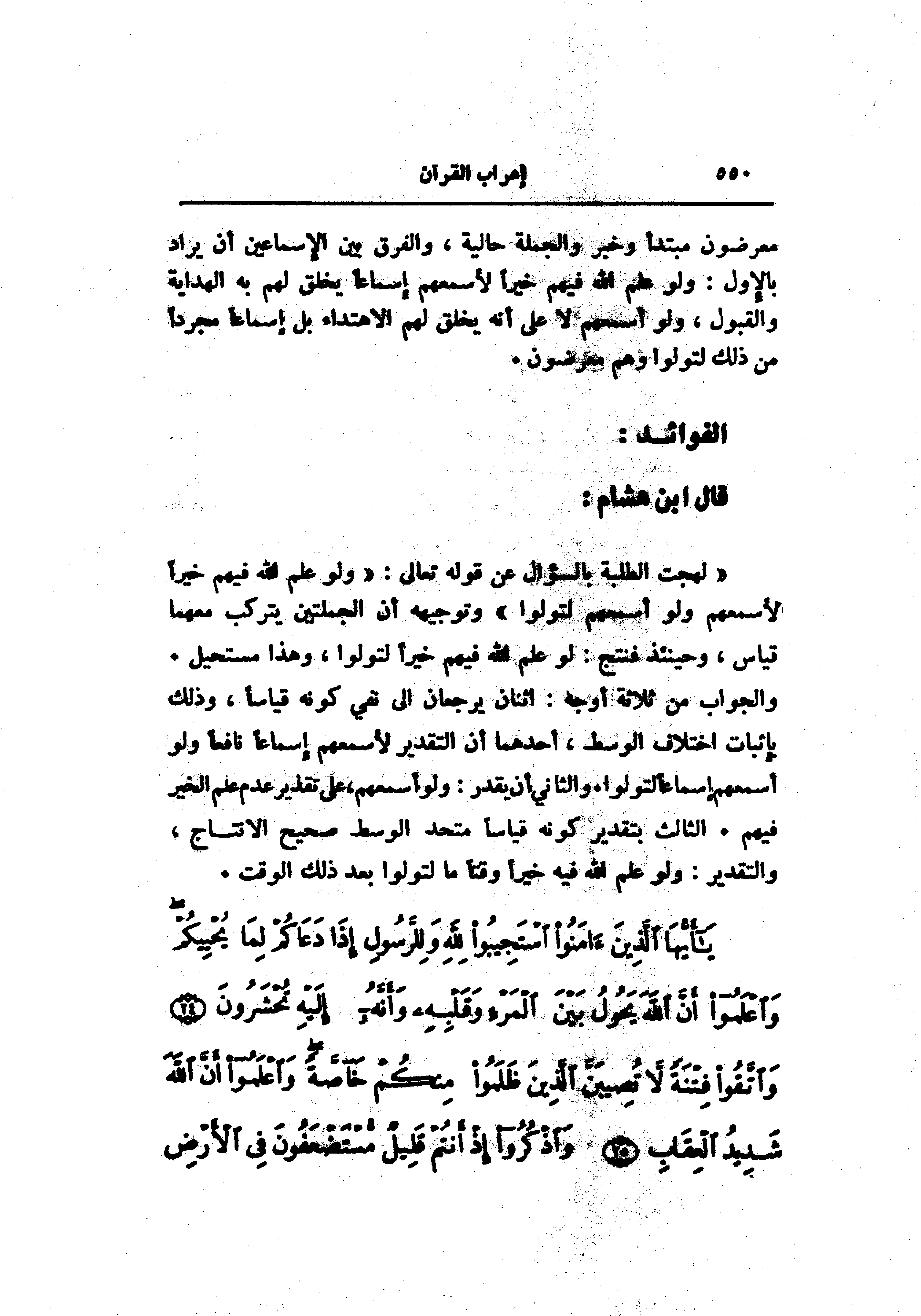 «لهجت الطلبة بالسؤال عن قوله تعالى: «ولو علم الله فيهم خيرا لأسمعهم ولو أسمعهم لتولوا» وتوجيهه أن الجملتين يتركب معهما قياس، وحينئذ فنتج: لو علم الله فيهم خيرا لتولوا، وهذا مستحيل.