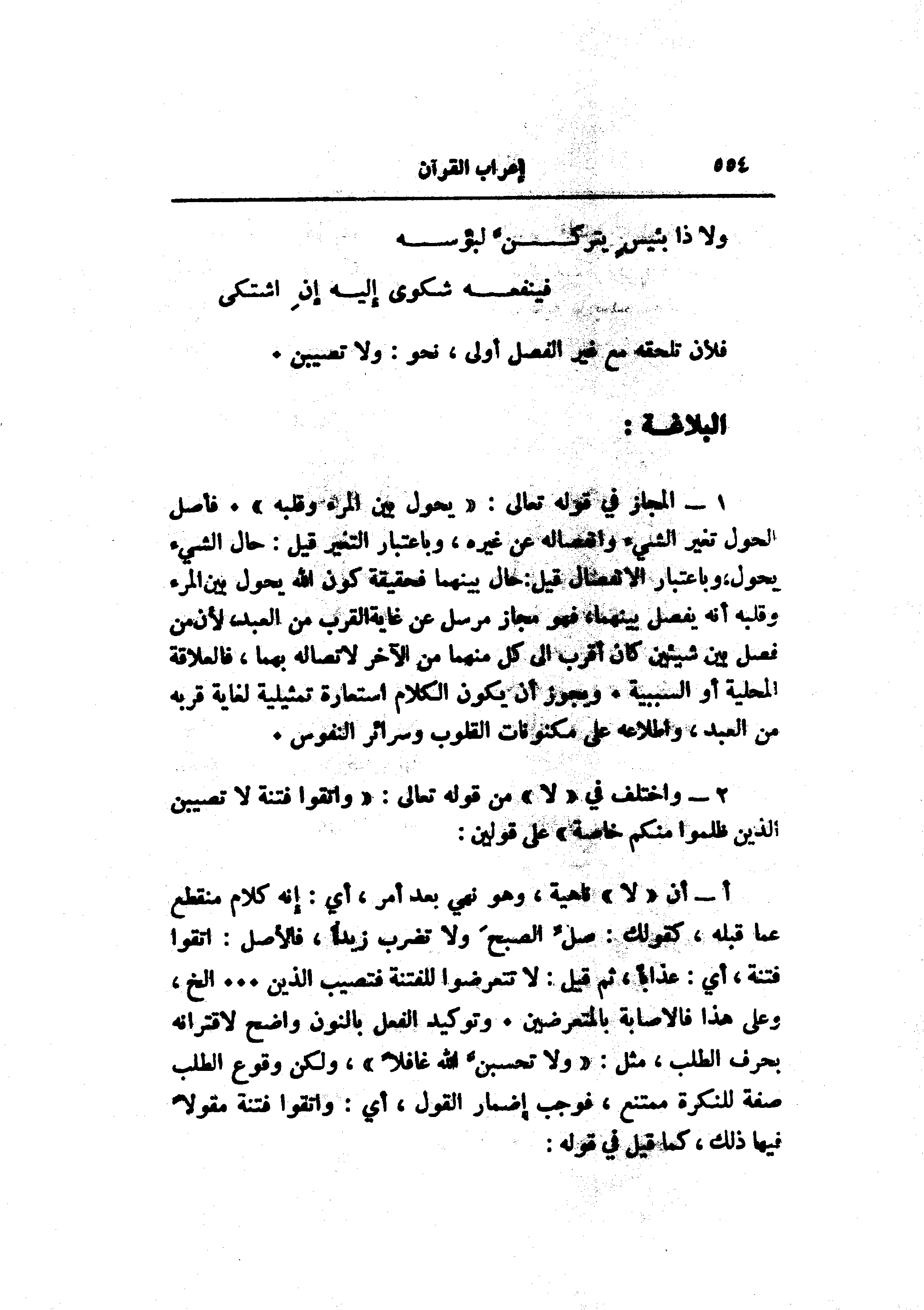 أ- أن «لا» ناهية، وهو نهي بعد أمر، أي: إنه كلام منقطع عما قبله، كقولك: صلّ الصبح ولا تضرب زيدا، فالأصل: اتقوا فتنة، أي: عذابا، ثم قيل: لا تتعرضوا للفتنة فتصيب الذين ... إلخ، وعلى هذا فالاصابة بالمتعرضين. وتوكيد الفعل بالنون واضح لاقترانه بحرف الطلب، مثل: «ولا تحسبنّ الله غافلا» ، ولكن وقوع الطلب صفة للنكرة ممتنع، فوجب إضمار القول، أي: واتقوا فتنة مقولا فيها ذلك، كما قيل في قوله: