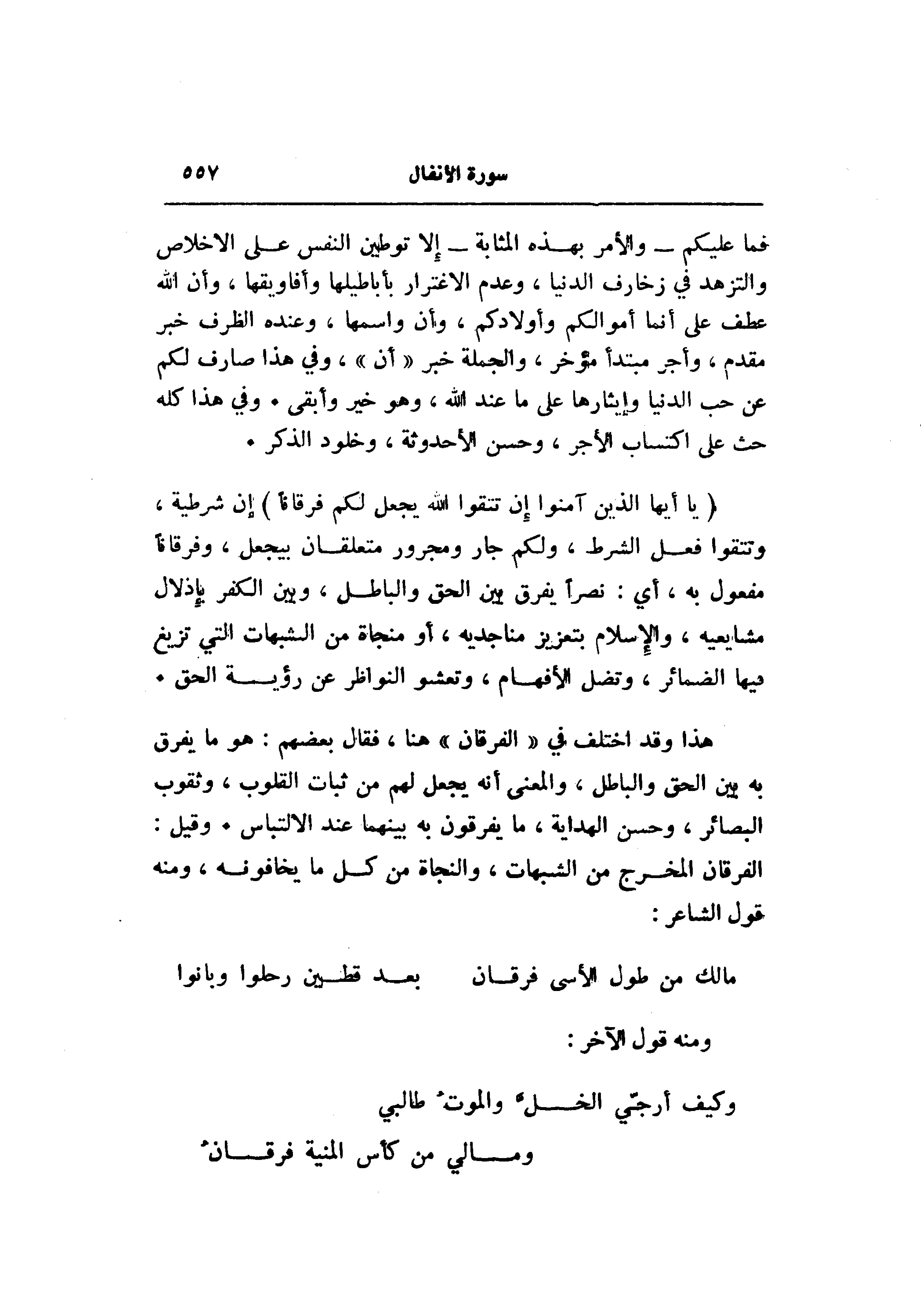 (يا أَيُّهَا الَّذِينَ آمَنُوا إِنْ تَتَّقُوا اللَّهَ يَجْعَلْ لَكُمْ فُرْقاناً) إن شرطية، وتتقوا فعل الشرط، ولكم جار ومجرور متعلقان بيجعل، وفرقانا مفعول به، أي: نصرا يفرق بين الحق والباطل، وبين الكفر بإذلال مشايعيه، والإسلام بتعزيز مناجديه، أو منجاة من الشبهات التي تزيغ فيها الضمائر، وتضل الأفهام، وتعشو النواظر عن رؤية الحق.