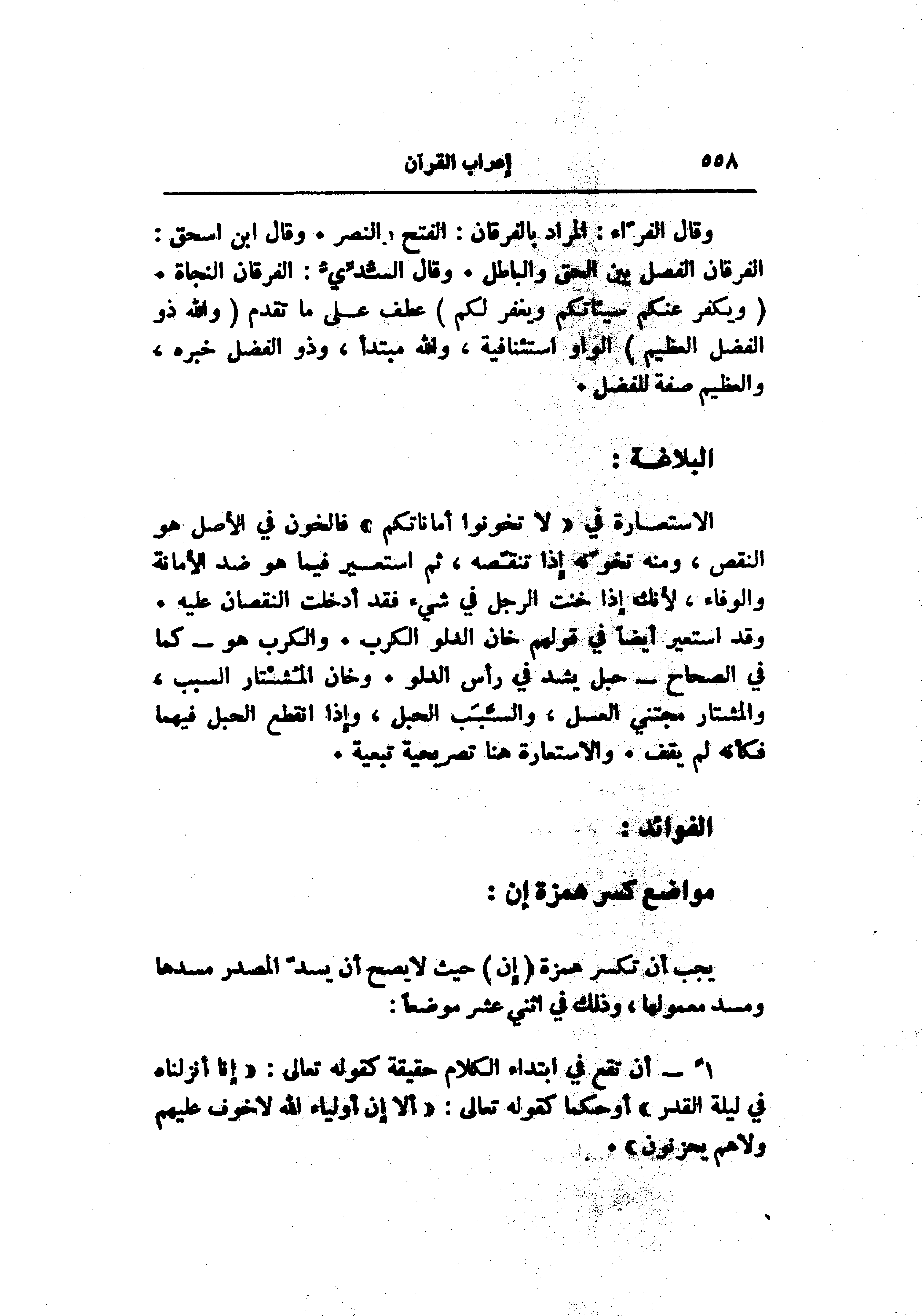الاستعارة في «لا تخونوا أماناتكم» فالخون في الأصل هو النقص، ومنه تخوّنه إذا تنقّصه، ثم استعير فيما هو ضد الأمانة والوفاء، لأنك إذا خنت الرجل في شيء فقد أدخلت النقصان عليه.