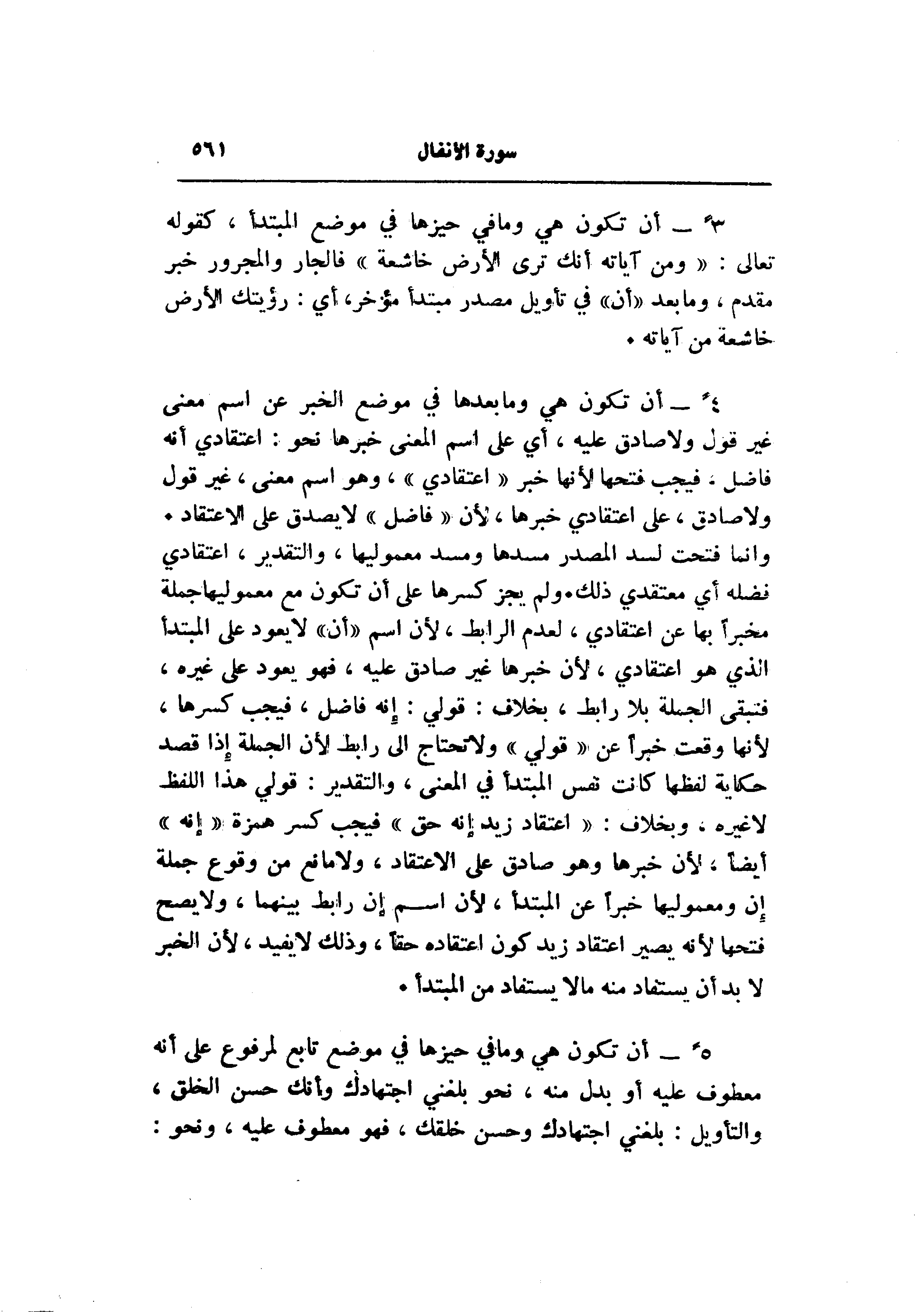 وانما فتحت لسد المصدر مسدها ومسد معموليها، والتقدير، اعتقادي فضله أي معتقدي ذلك. ولم يجز كسرها على أن تكون مع معموليها جملة مخبرا بها عن اعتقادي، لعدم الرابط، لأن اسم «أن» لا يعود على المبتدأ الذي هو اعتقادي، لأن خبرها غير صادق عليه، فهو يعود على غيره، فتبقى الجملة بلا رابط، بخلاف: قولي: إنه فاضل، فيجب كسرها، لأنها وقعت خبرا عن «قولي» ولا تحتاج الى رابط لأن الجملة إذا قصد حكاية لفظها كانت نفس المبتدأ في المعنى، والتقدير: قولي هذا اللفظ لا غيره، وبخلاف: «اعتقاد زيد إنه حق» فيجب كسر همزة «إنه» أيضا، لأن خبرها وهو صادق على الاعتقاد، ولا مانع من وقوع جملة إن ومعموليها خبرا عن المبتدأ، لأن اسم إن رابط بينهما، ولا يصح فتحها لأنه يصير اعتقاد زيد كون اعتقاده حقا، وذلك لا يفيد، لأن الخبر لا بد أن يستفاد منه مالا يستفاد من المبتدأ.