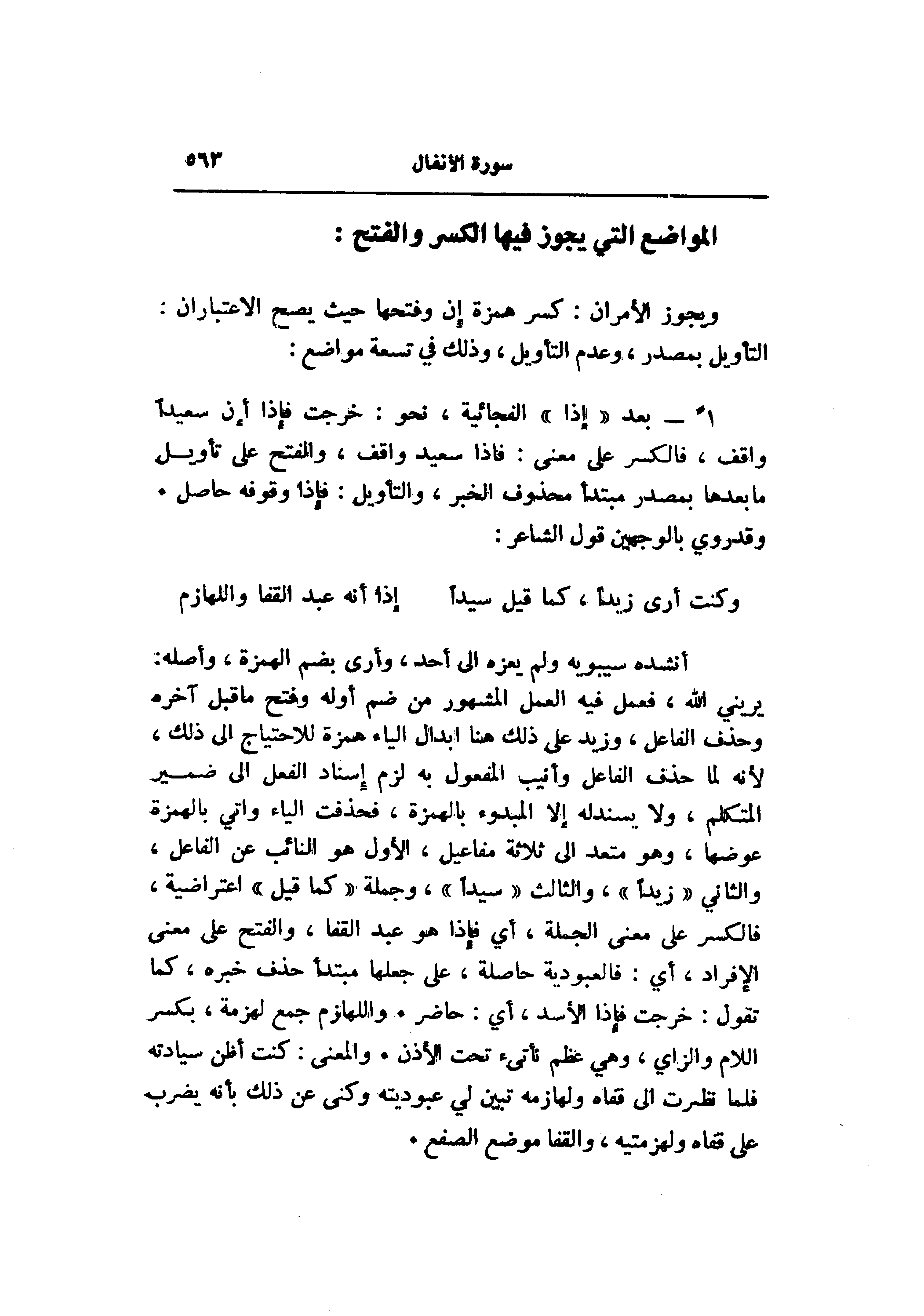 1- بعد «إذا» الفجائية، نحو: خرجت فإذا أن سعيدا واقف، فالكسر على معنى: فاذا سعيد واقف، والفتح على تأويل ما بعدها بمصدر مبتدأ محذوف الخبر، والتأويل: فإذا وقوفه حاصل.