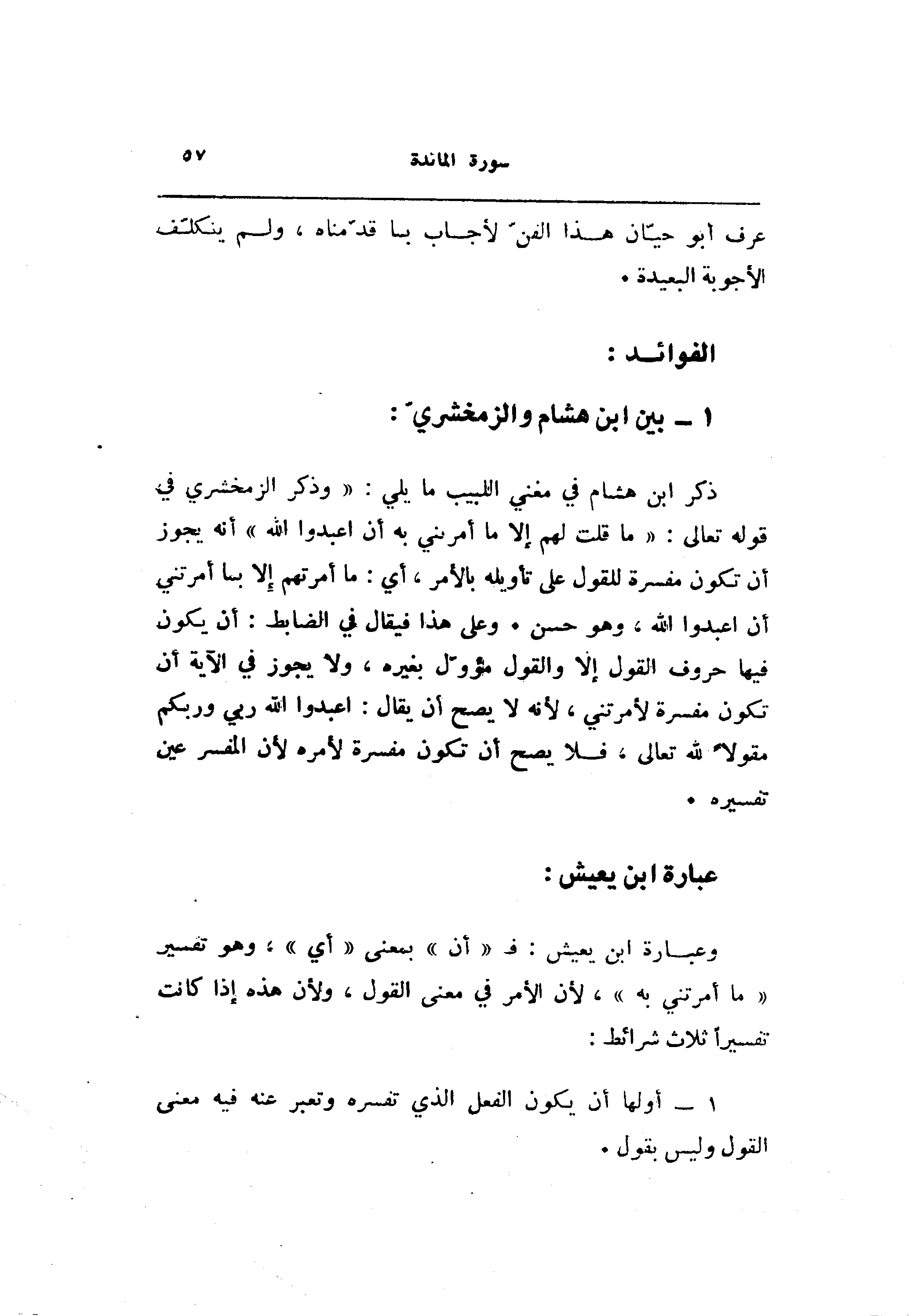 ذكر ابن هشام في مغني اللبيب ما يلي: «وذكر الزمخشري في قوله تعالى: «ما قلت لهم إلا ما أمرتني به أن اعبدوا الله» أنه يجوز أن تكون مفسرة للقول على تأويله بالأمر، أي: ما أمرتهم إلا بما أمرتني أن اعبدوا الله، وهو حسن. وعلى هذا فيقال في الضابط: أن يكون فيها حروف القول إلا والقول مؤوّل بغيره، ولا يجوز في الآية أن تكون مفسرة لأمرتني، لأنه لا يصح أن يقال: اعبدوا الله ربي وربكم مقولا لله تعالى، فلا يصح أن تكون مفسرة لأمره لأن المفسر عين تفسيره.