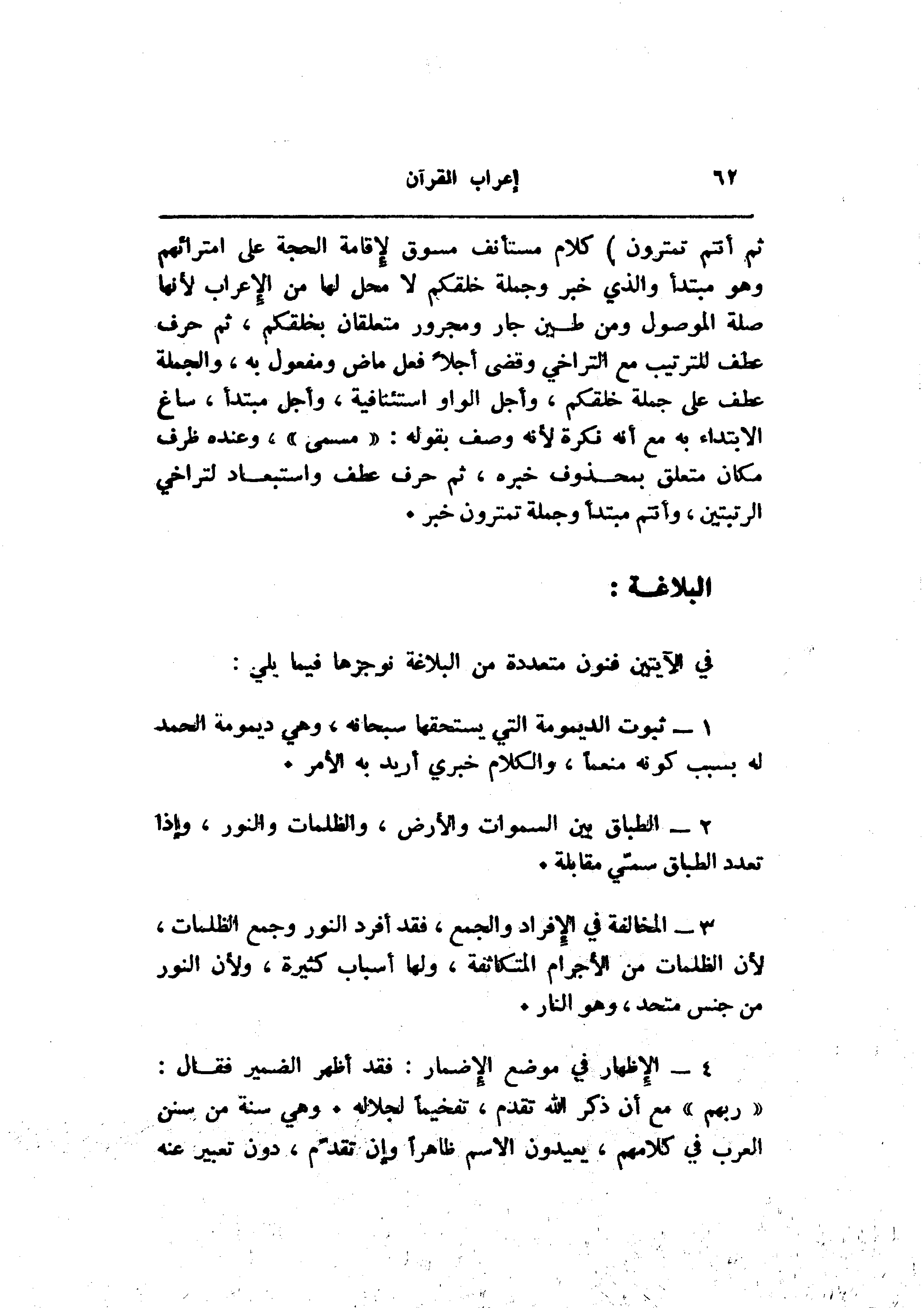 3- المخالفة في الإفراد والجمع، فقد أفرد النور وجمع الظلمات، لأن الظلمات من الأجرام المتكاثفة، ولها أسباب كثيرة، ولأن النور من جنس متحد، وهو النار.