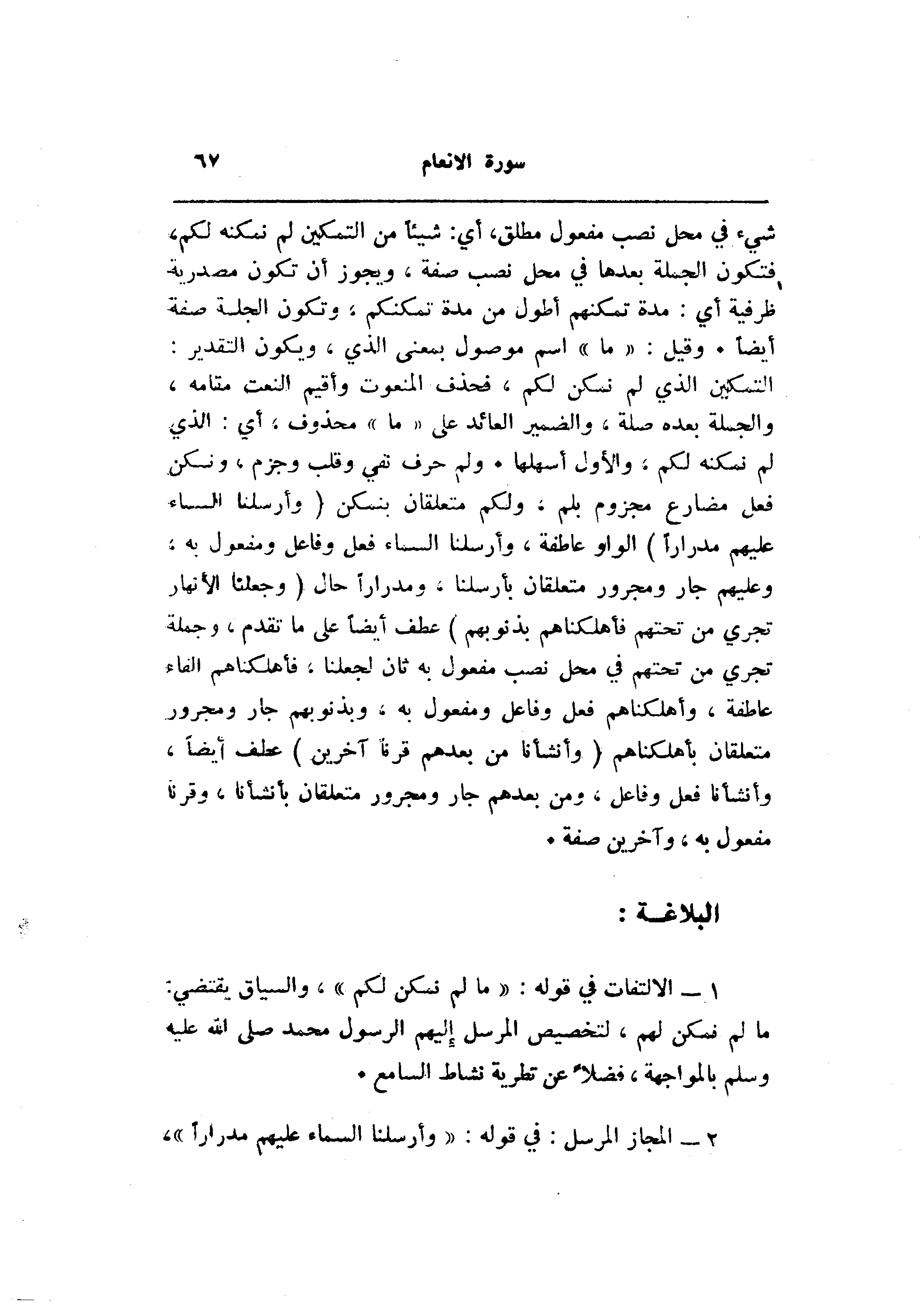 التمكين الذي لم نمكن لكم، فحذف المنعوت وأقيم النعت مقامه، والجملة بعده صلة، والضمير العائد على «ما» محذوف، أي: الذي لم نمكنه لكم، والأول أسهلها. ولم حرف نفي وقلب وجزم، ونكن فعل مضارع مجزوم بلم، ولكم متعلقان بنمكن (وَأَرْسَلْنَا السَّماءَ عَلَيْهِمْ مِدْراراً) الواو عاطفة، وأرسلنا السماء فعل وفاعل ومفعول به، وعليهم جار ومجرور متعلقان بأرسلنا، ومدرارا حال (وَجَعَلْنَا الْأَنْهارَ تَجْرِي مِنْ تَحْتِهِمْ فَأَهْلَكْناهُمْ بِذُنُوبِهِمْ) عطف أيضا على ما تقدم، وجملة تجري من تحتهم في محل نصب مفعول به ثان لجعلنا، فأهلكناهم الفاء عاطفة، وأهلكناهم فعل وفاعل ومفعول به، وبذنوبهم جار ومجرور متعلقان بأهلكناهم (وَأَنْشَأْنا مِنْ بَعْدِهِمْ قَرْناً آخَرِينَ) عطف أيضا، وأنشأنا فعل وفاعل، ومن بعدهم جار ومجرور متعلقان بأنشأنا، وقرنا مفعول به، وآخرين صفة.